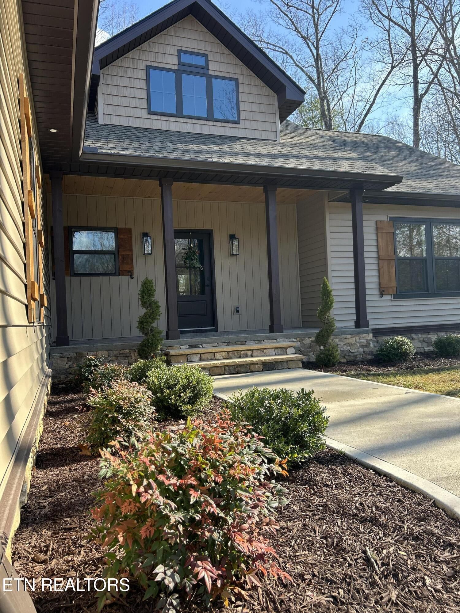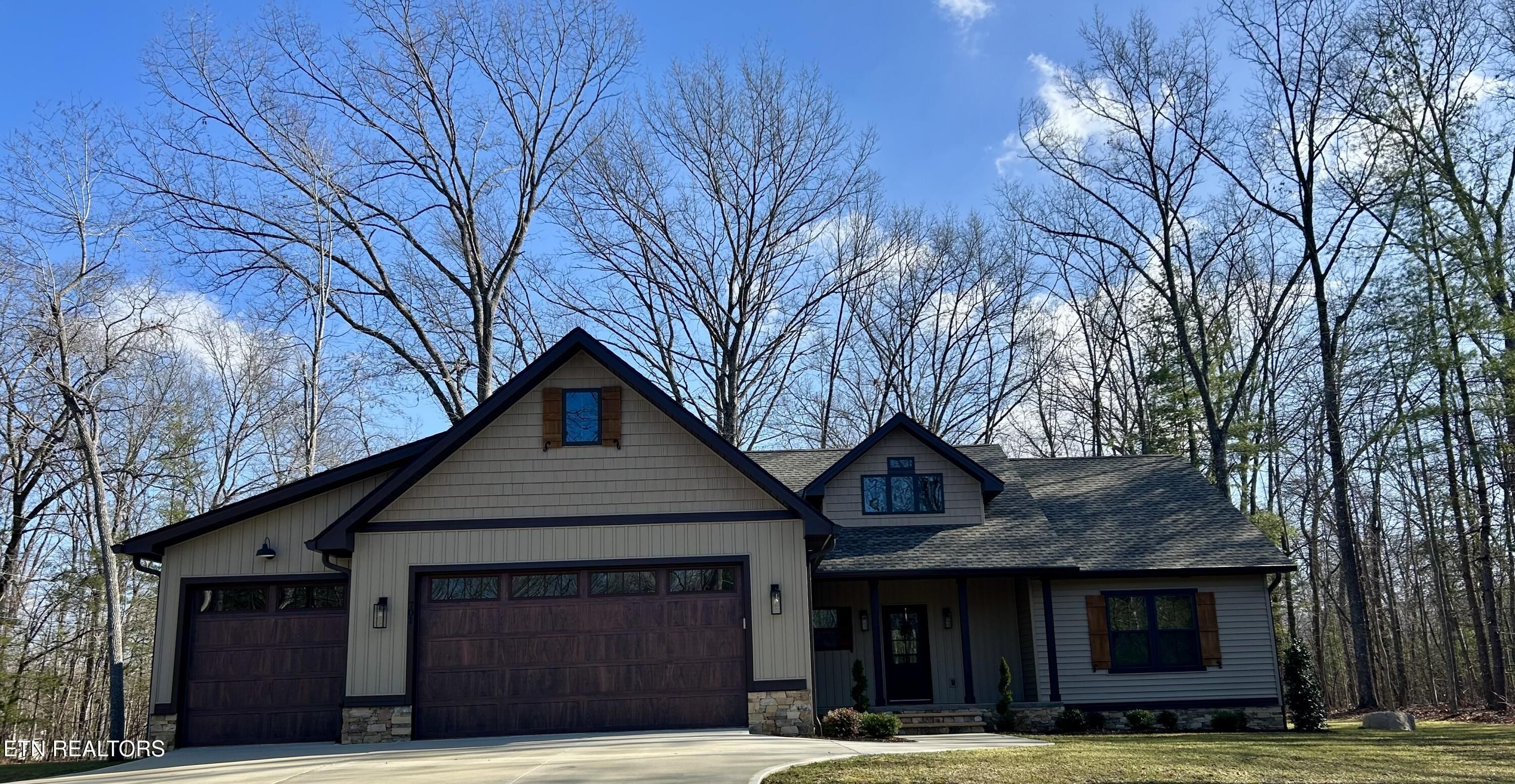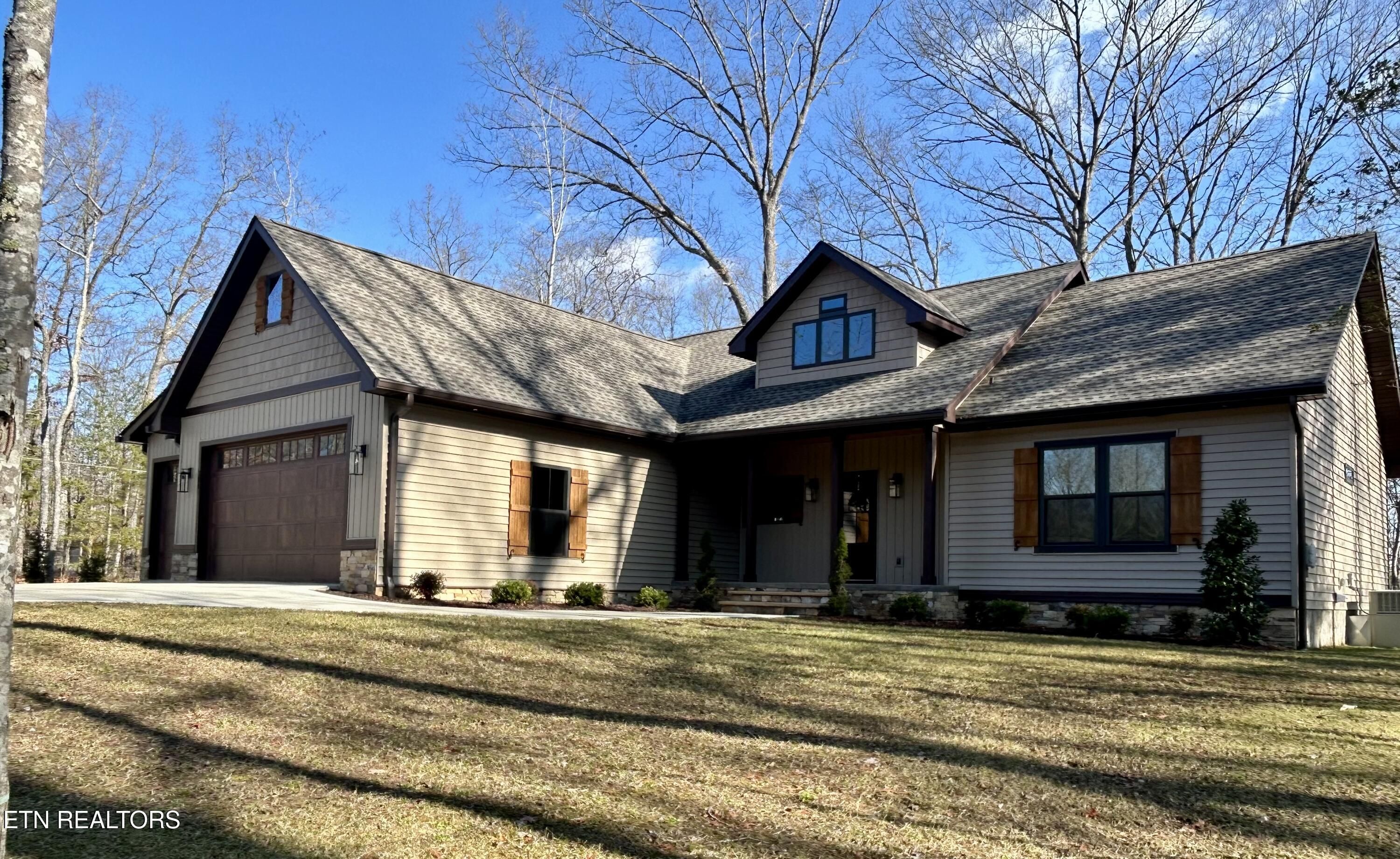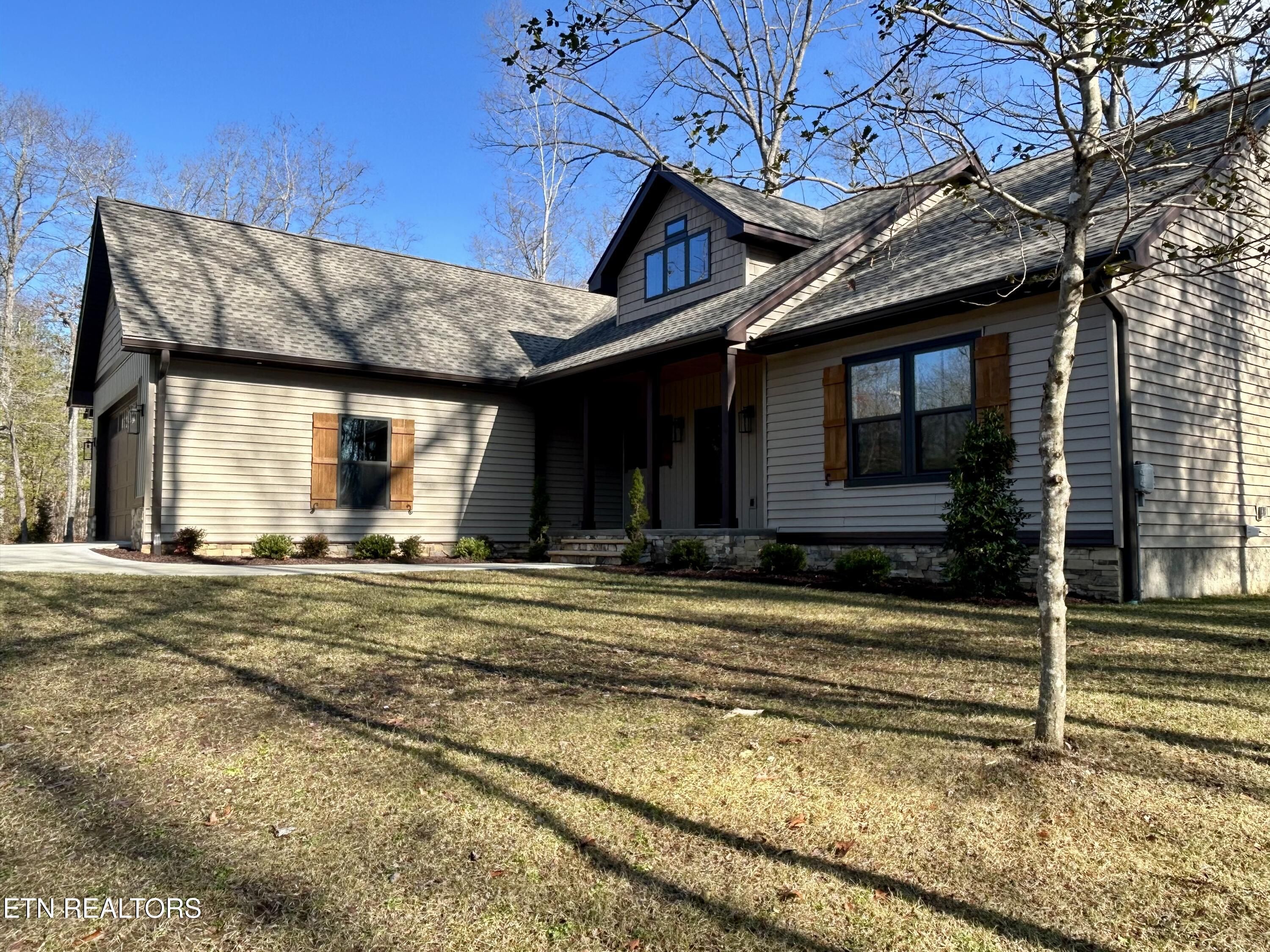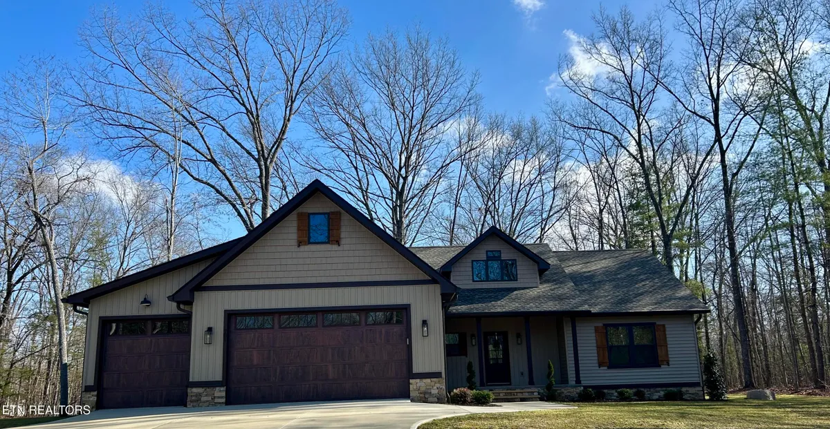 Looking for a home that checks every box? This brand-new 2025 craftsman ranch sits on one level and offers a 3-car garage, semi-circular driveway, and true wooded privacy in a neighborhood of newer homes. Built by Qualls Construction. It greets you with a generous stamped-concrete front porch, tongue-and-groove ceiling, crab orchard stone accents, board-and-batten shutters, and a timeless wood front door. Step inside to an elegant entry with wainscoting, a chandelier, and an open-concept vaulted great room anchored by a stunning fireplace. LVP floors run throughout, complemented by abundant recessed lighting. The chef's kitchen delivers top-tier appliances, soft-close cabinetry, granite countertops, a gourmet gas range, tiled backsplash, under-cabinet lighting, and a coffee bar with butcher-block counter and built-in microwave. The primary suite features a tray ceiling and a luxurious bath with dual vanities, walk-in closet, water closet, and a rain shower with handheld wand and tiled walls. The guest bath is equally impressive with beautiful tilework and another rain shower. Enjoy peaceful Tennessee living on the expansive screened porch surrounded by woods for maximum privacy, complete with tongue-and-groove ceiling, modern fan, and stamped concrete. Additional features include gas heat, gas tankless water heater, gas stub at the laundry for a dryer, laundry tub in the garage, Generac pre-wire, and an encapsulated crawl space.
