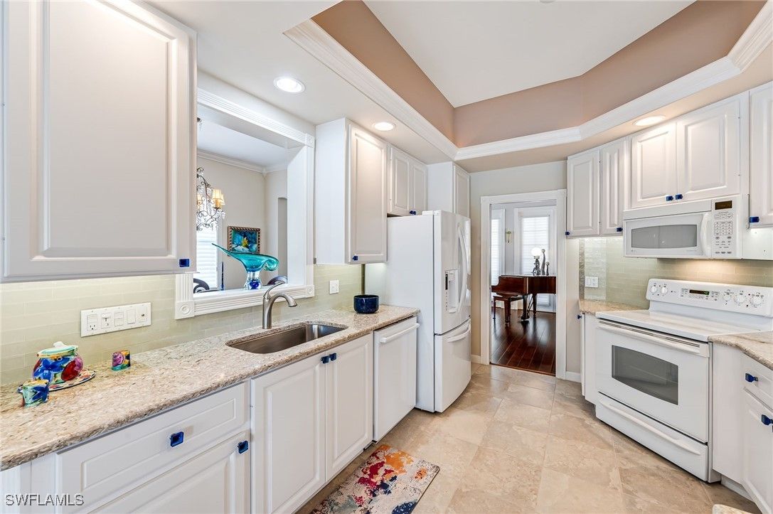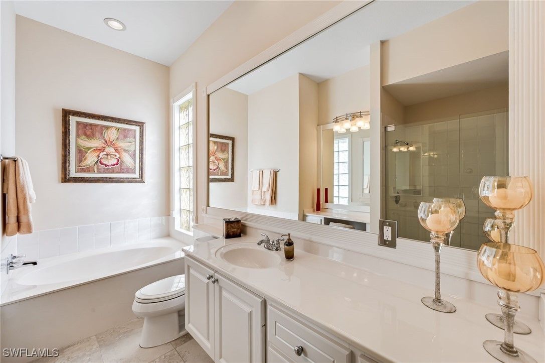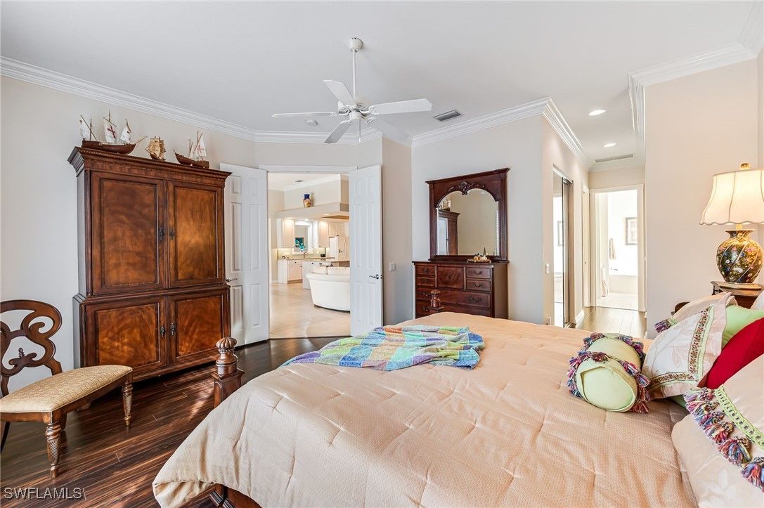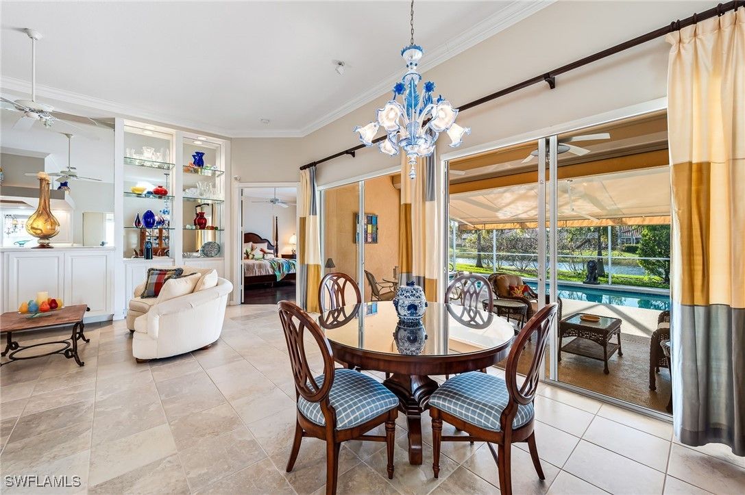 From the moment you enter this elegant, unique Carlyle home built by DiVosta, you will observe many custom, architectural features it has to offer such as lighting, carpentry, sound systems and more! The kitchen has been remodeled with a special designed, glass tile backsplash, dimmable under-cabinet lighting, a wine refrigerator, crown molding that is back illuminated, a pantry with sliding drawers and wainscoting under the bar. As you meander into the spacious family room, you will take in more crown molding, custom lighting and a sound system. The living room & dining room boasts a custom sound system, lighting, custom base molding and fluted casings around all windows. New washer/dryer installed 3/24. New stove 2025. Custom electric, roll-down storm shutters and accordion shutters. The southwest facing lanai enables you to enjoy the magnificent Florida sunsets. The screened lanai includes the following features: ceiling fans with lights, no-see-um screening, a one-of-a-kind art deco, illuminated wall feature, a sound system & a custom epoxy flake deck. There is an electric-retractable awning to allow for maximum entertaining space. The crystal blue pool is heated for your comfort. New roof installed 2021, new microwave oven installed 3/26. This home will WOW you!