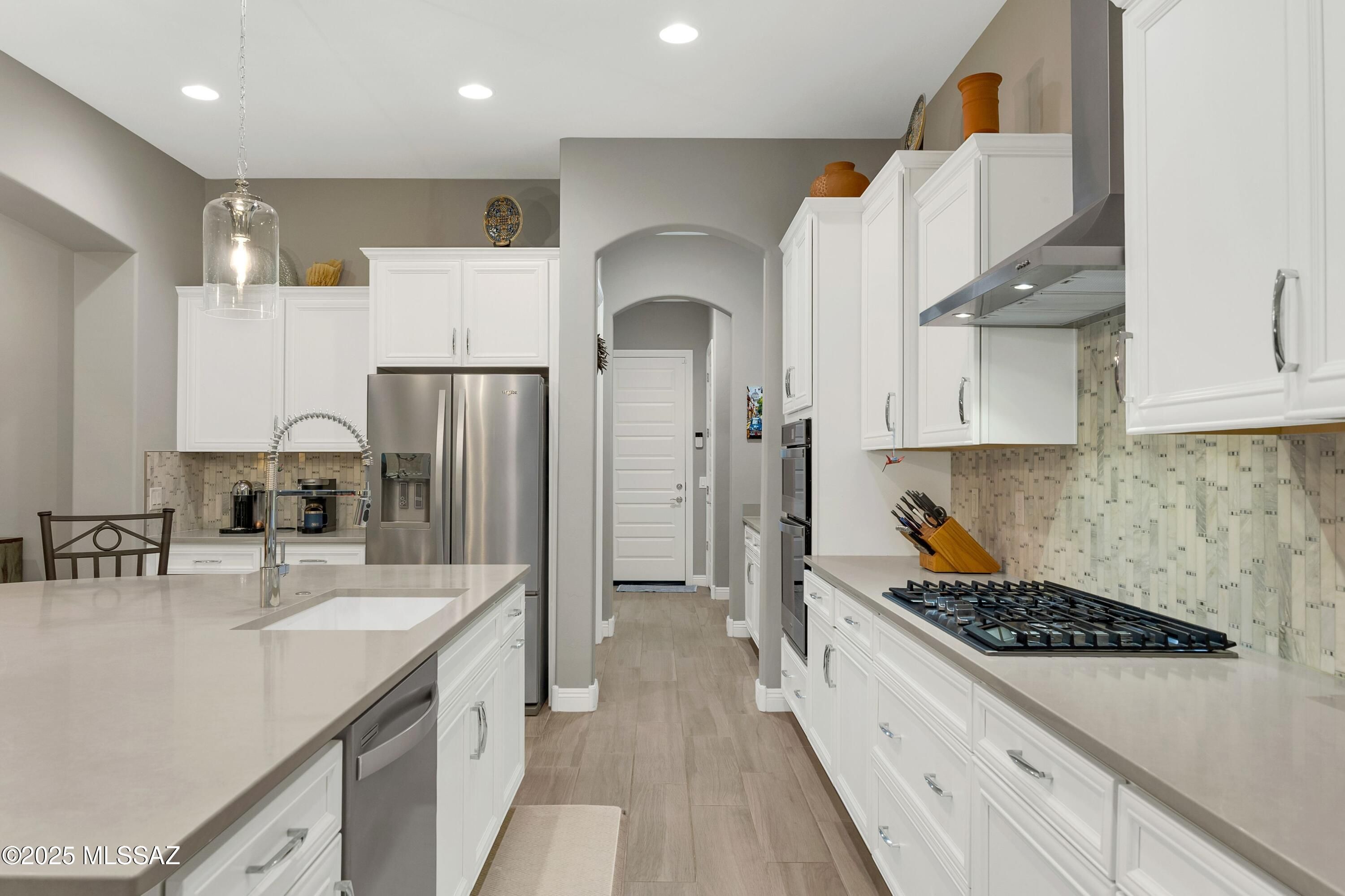 Welcome Home! Expect to be impressed from the moment you enter the inviting paver courtyard. This desirable Journey floor plan has been consistently updated throughout. Enjoy 3 bedrooms plus a den, 2.5 bathrooms and an extended garage plus golf cart garage. The great room is light and bright and brings the outdoors in with sliding doors. The Gourmet kitchen features an abundance of cabinets, quartz countertops, custom backsplash, large curved island with breakfast bar, SS appliances, gas cooktop, built in oven, and huge walk-in pantry plus a butler's pantry. The primary bedroom includes a spa like bath with two vanities, a large walk-in shower and oversized closet. The two guest bedrooms share a jack and jill bathroom. Enjoy your professionally landscaped private backyard with an
