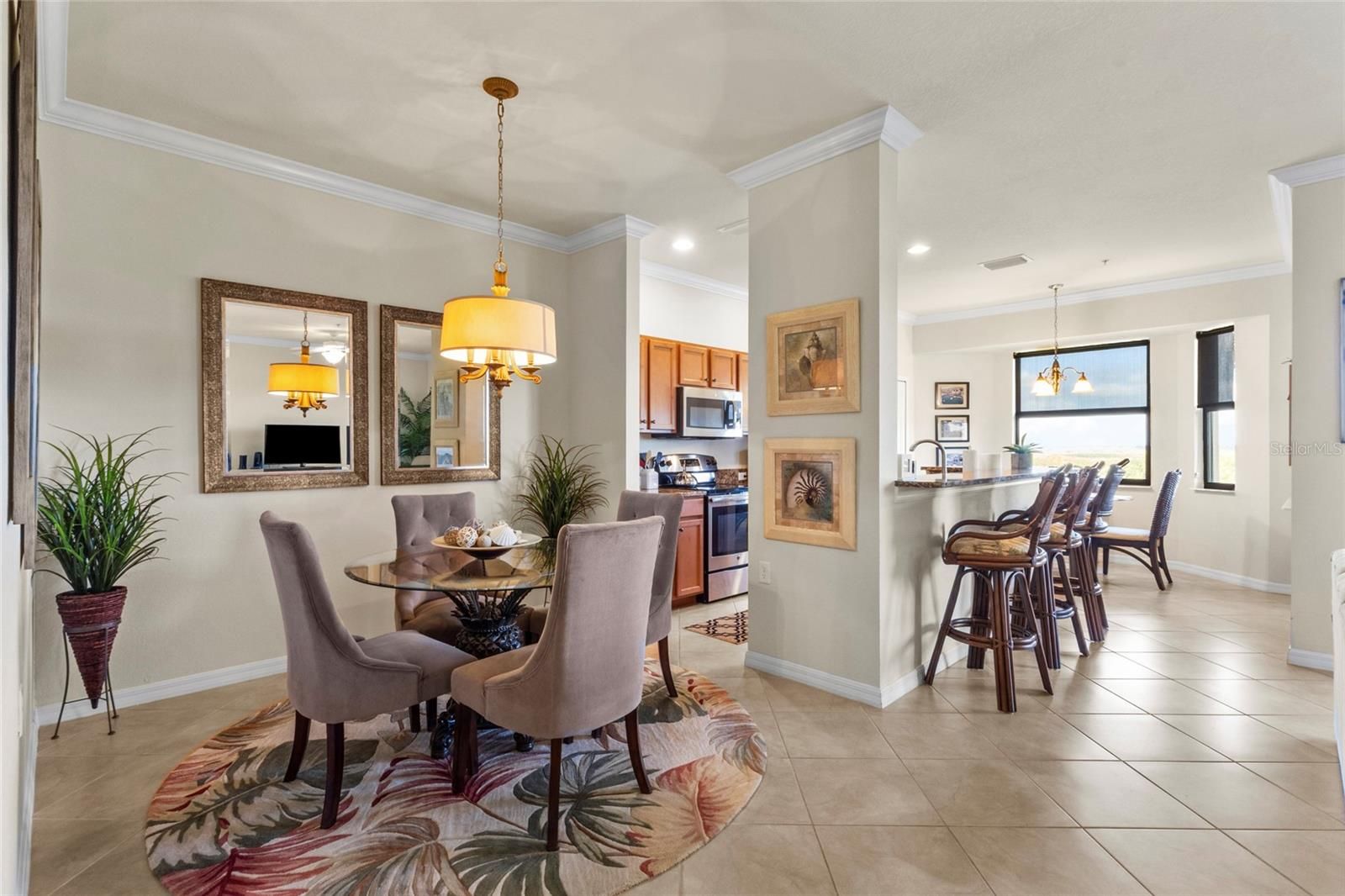 Experience elevated resort living in the prestigious, guard-gated community of River Strand Golf & Country Club. Perfectly positioned on the top (4th) floor as a coveted end-unit, this beautifully appointed 2-bedroom, 2-bath luxury condominium offers exceptional privacy, abundant natural light, and spectacular panoramic golf and water views. Professionally designed and fully furnished by an interior designer, the residence showcases 1,156 square feet under air (1,260 total under roof) of thoughtfully curated living space. The open and airy layout is highlighted by dramatic vaulted architectural ceilings, creating a bright, sophisticated ambiance ideal for both relaxed living and elegant entertaining. The home features a formal living room, formal dining room, and versatile den/office, providing flexibility for today’s lifestyle. At the heart of the residence is the gourmet-inspired kitchen, appointed with granite countertops, rich wood cabinetry, and an expansive peninsula breakfast bar. A charming bay window breakfast area frames tranquil views of the golf course, bringing the outdoors into your daily living experience. Step outside to the private screened balcony, where breathtaking vistas unfold across the 9th fairway approach, sparkling lakefront waters, and the sand bunker protecting the green. This peaceful outdoor retreat provides the perfect setting for morning coffee, sunset cocktails, or simply enjoying the serene Florida landscape. The luxurious primary suite serves as a relaxing sanctuary with dual walk-in closets and a spacious en-suite bath, while the guest bedroom and guest bathroom offer comfortable accommodations for visiting family and friends. An interior utility closet with full-size washer and dryer adds everyday convenience. This exceptional residence includes numerous premium features rarely found together: • Oversized private storage room directly across the hall • Reserved covered carport parking • Elevator service within the building • Ample guest parking Lovingly owned by one owner since new and used primarily as an investment residence, the condominium has been meticulously maintained and preserved in pristine condition, making it truly move-in ready. Residents of River Strand Golf & Country Club enjoy an exceptional country club lifestyle anchored by a 27-hole championship golf course designed by renowned architect Arthur Hills. The community offers nine Har-Tru tennis courts, eight pickleball courts, and an array of luxury amenities designed to enrich daily life. Social and recreational highlights include: • Resort-style pools and spa • State-of-the-art fitness center and group fitness classes • Dining and social events • Biking and walking paths throughout the community • Hobby clubs and special interest groups • The popular Shank Shack and Tiki Bar An exciting $8.5 million master-planned renovation of the clubhouse is currently underway, promising to further elevate the already vibrant lifestyle enjoyed by residents. This exceptional residence presents a rare opportunity to own a beautifully furnished top-floor condominium with breathtaking golf course views in one of Bradenton’s most desirable country club communities—where luxury, recreation, and relaxed Florida living come together seamlessly.