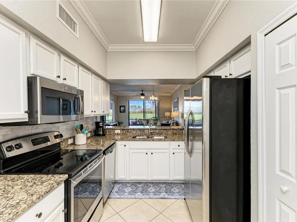EXCEPTIONALLY VALUE PRICED WITH ELEVATED STYLE makes this one truly special! TOTALLY TURNKEY, MOVE-IN READY and complete with beautiful furnishings and accessories, you will be able to envision this FIRST FLOOR condominium as your next primary residence, second home or investment opportunity! Everything you need is here to make this 2 bedroom, 2 bath GOLF DEEDED residence your next Florida home! Beautifully designed with custom paint and light fixtures, plantation shutters, and vinyl flooring, this unit was thoughtfully furnished with a stylish yet functional design. The eat-in kitchen is spacious, with custom backsplash, painted cabinets and breakfast bar leading to the combined dining and great room space. Sliders open to the private no-seeum screened lanai and the SPECTACULAR GOLF AND WATER VIEWS that River Strand is known for! Southern exposure also means gorgeous sunsets, sunrises and Florida sunshine year round! The primary suite enjoys the vistas too and includes 2 walk-ins and en-suite with painted cupboards. Complete with a nice storage room and assigned covered carport, it is all here. River Strand is a GATED RESORT COMMUNITY with 27 holes of Arthur Hills recently redesigned golf, clubhouse with RESTAURANT and grille room, 2 community pools and spas, tiki bar, 6 satellite pools, 2 fitness centers, tennis and pickleball courts and so many social and fitness events and activities! The Clubhouse , Tiki bar and Pool area is currently undergoing an $8 million renovation expected to be completed early 2026! Ideally located minutes to I-75 and the new Marketplace and close to the beautiful beaches of the Gulf Coast! So come and see this special home in this exceptional community, once you experience River Strand at it's best you may never want to leave!