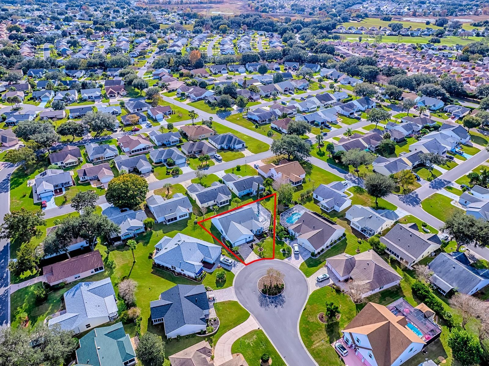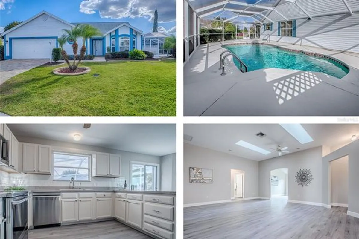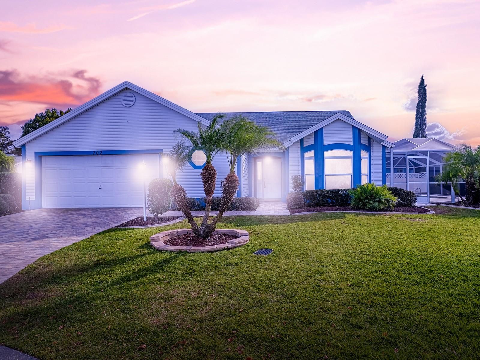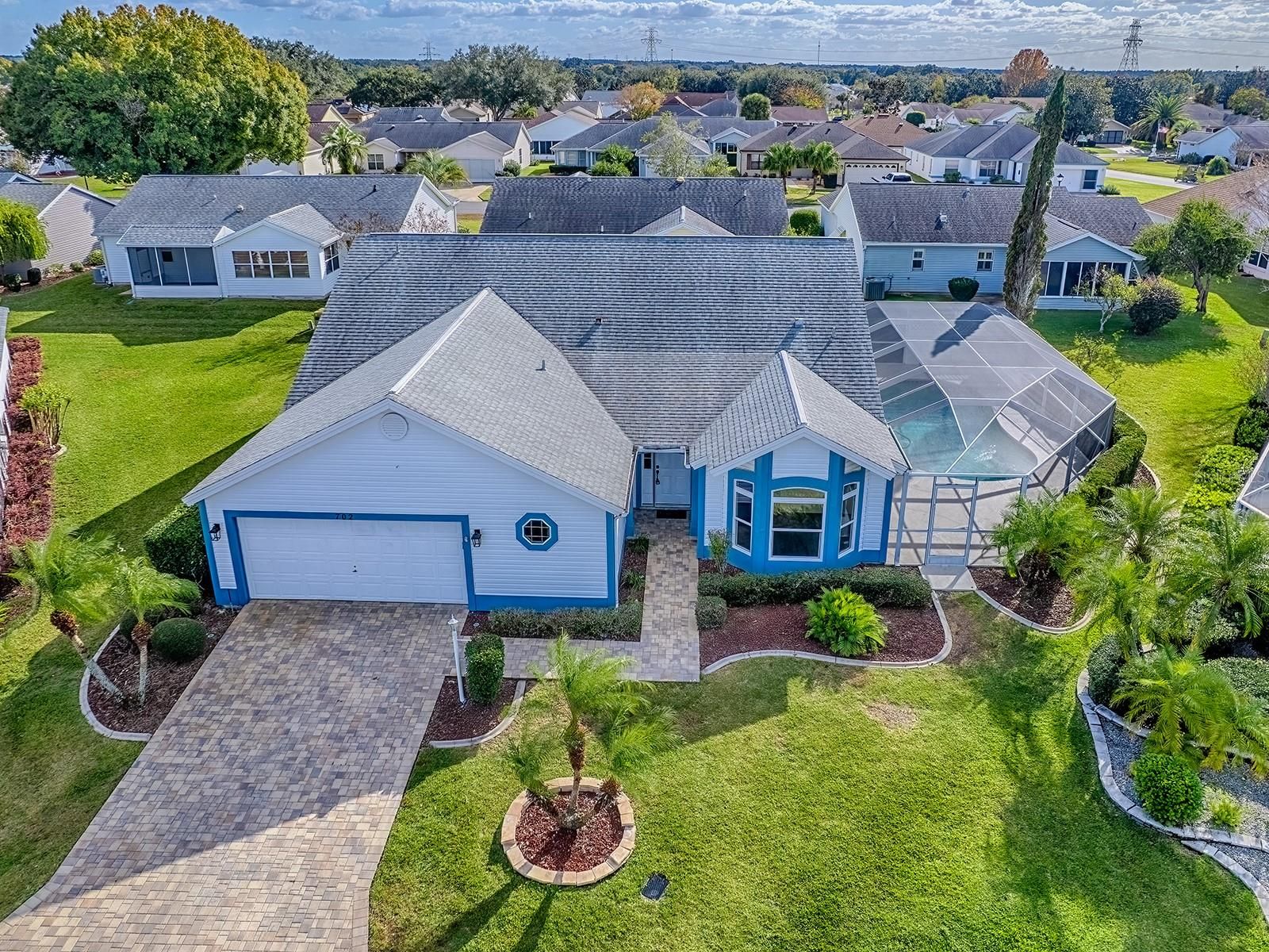 BOND PAID! Welcome to this beautifully updated Santa Domingo POOL HOME, perfectly situated on a quiet cul-de-sac in the Village of Rio Grande. If you are looking for a move-in-ready home, this one is sure to impress! Attractive landscaping and fresh exterior trim paint create wonderful curb appeal. Inside, you’re greeted by a welcoming foyer with a convenient coat closet, vaulted ceilings with NO POPCORN, and NEW luxury vinyl plank flooring throughout. The bright, updated kitchen features freshly painted cabinetry, brand-new stainless-steel appliances, Quartz countertops, a pantry, built-in desk space, and a window overlooking the pool. A cozy dinette just off the kitchen features sliding glass doors that lead directly to the pool area, perfect for casual dining and indoor-outdoor living. The spacious living room has two skylights that illuminate the space and showcase volume ceilings, and flows seamlessly into the formal dining area. At the same time, the Florida Room adds valuable living space and is ideally located just off the living room, great for entertaining. The owner’s suite offers dual closets and private access to the pool, along with an updated en-suite bath featuring QUARTZ countertops, dual sinks, a walk-in shower, and a linen closet. Step outside to enjoy the SPARKLING HEATED POOL with a newly screened birdcage, ideal for relaxing or entertaining in the Florida sunshine. The guest wing includes two comfortable bedrooms with double-door closets, separated by an updated guest bath with a new vanity and decorative glass door in the tub/shower combo. The laundry room is equipped with storage cabinets, a set sink, and an additional refrigerator. You will love the OVERSIZED GARAGE with room for two cars plus a golf cart! Recent improvements include NEW interior paint, NEW flooring, removal of popcorn ceilings, NEW front and back windows, freshly painted pool decking, NEW birdcage screens, NEW garage paint and floor, NEW exterior trim paint, NEW water heater, and all NEW appliances. Roof 2014, HVAC 2018. Conveniently located between Lake Sumter and Spanish Springs Town Squares. Located just 1/2 mile to the Rio Grande Neighborhood Pool and minutes to County Road 466 with numerous grocery stores, restaurants, banks, and medical. Close to three large Regional Recreation Centers, Laurel Manor, Savannah Center, and La Hacienda. Plus, this home is also close to several Country Clubs & Championship Golf Courses such as Tierra Del Sol, Hacienda Hills, and Orange Blossom Hills. This meticulously updated home is truly move-in ready. Don’t miss your opportunity to enjoy the best of Village living!