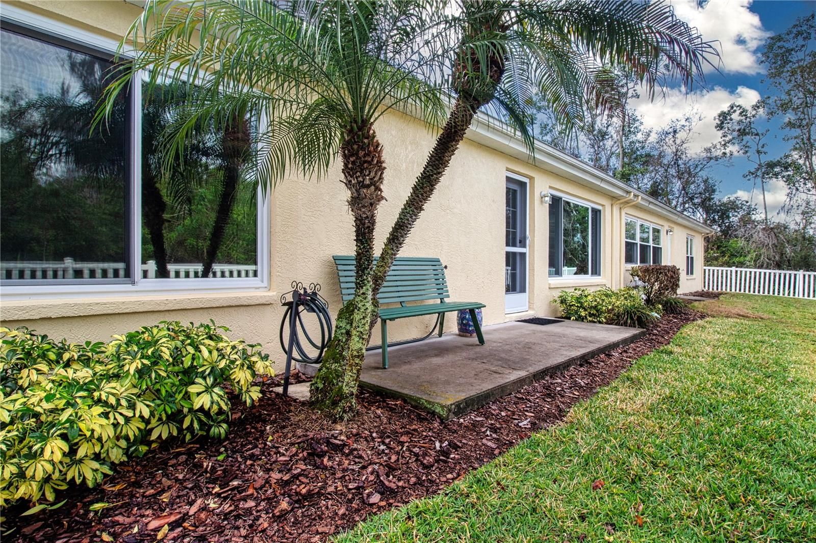 If you’re seeking a friendly neighborhood on a quiet cul-de-sac, this impeccable 2-bedroom, 2-bath condo offers comfort, style, and peace of mind. The open split floor plan features vaulted ceilings and premium laminate flooring, creating a bright and spacious feel throughout. The generous kitchen opens seamlessly to the living and dining areas and offers abundant cabinetry, white appliances, a pantry, and a cozy dinette space. Recent upgrades include hurricane-impact windows, blinds and shades, ceiling fans, and two skylights that fill the home with natural light. The primary suite features a walk-in closet, walk-in shower, and a versatile bonus area—ideal for a home office, reading nook, or hobby space. Relax while enjoying lush greenery views from the Florida room or unwind on the new backyard patio. The spacious two-car garage includes the laundry area with washer and dryer, utility table, and hanging space. For added value, all ductwork has been recently cleaned by Stanley Steamer. HOA fees provide exceptional convenience, covering lawn care, interior and exterior water, irrigation, cable, pest control, exterior maintenance, roof replacement, and access to community activities and amenities. Located in King's Point, a gated golf cart community offering pools, a fitness center, clubs, arts and crafts, tennis, pickleball, restaurants, a bar, and a dog park — this home truly offers resort-style living at its best.