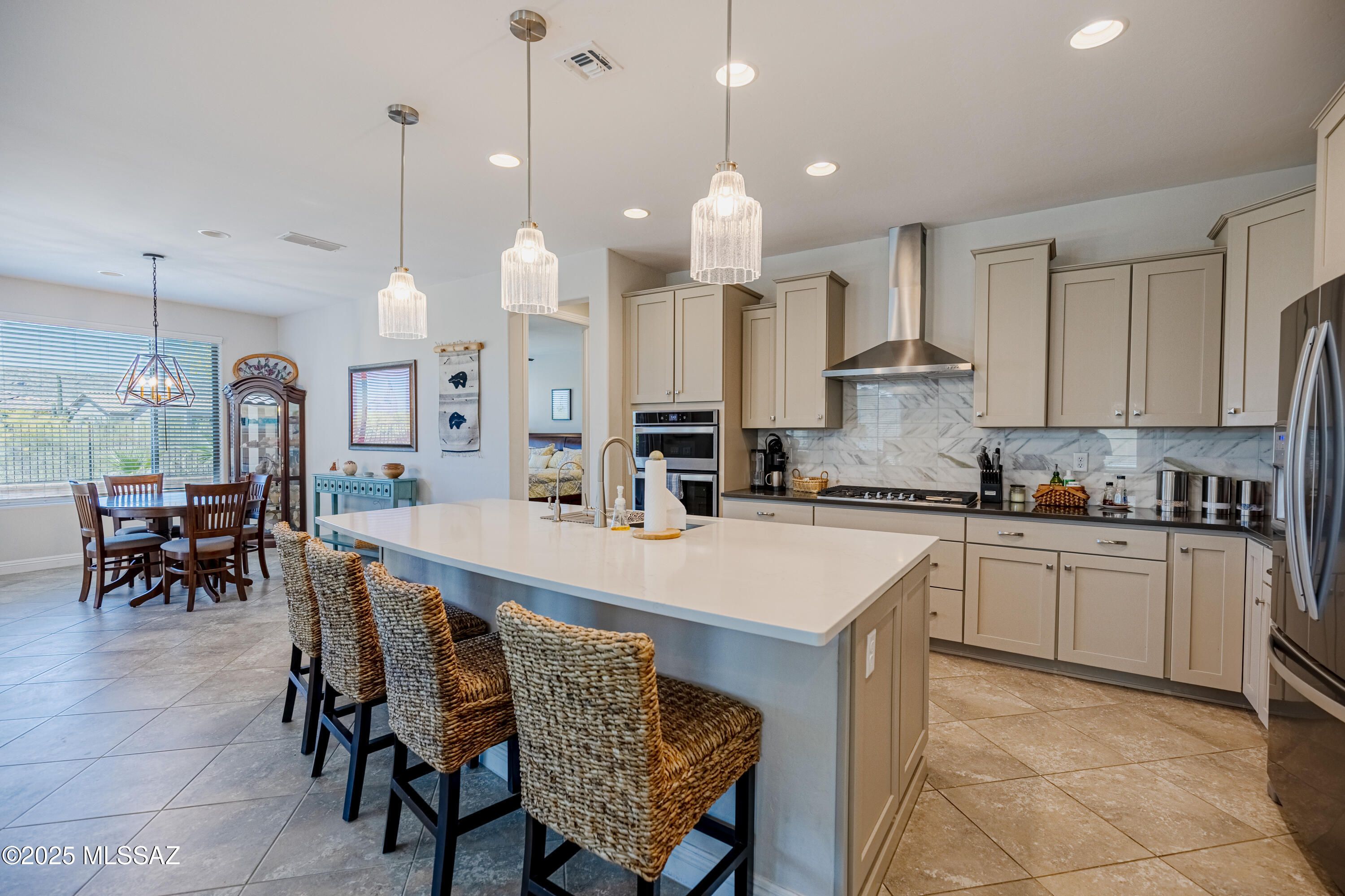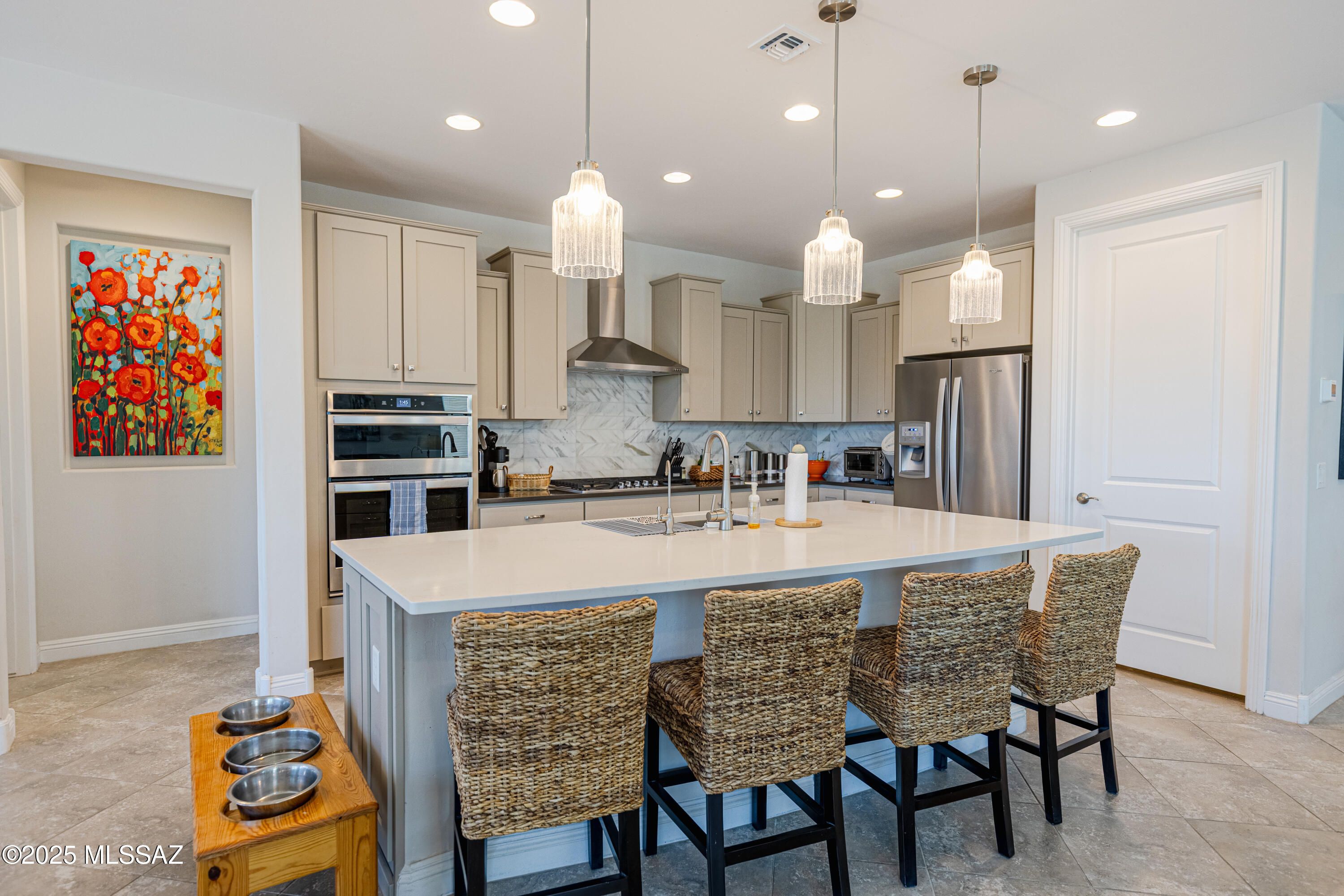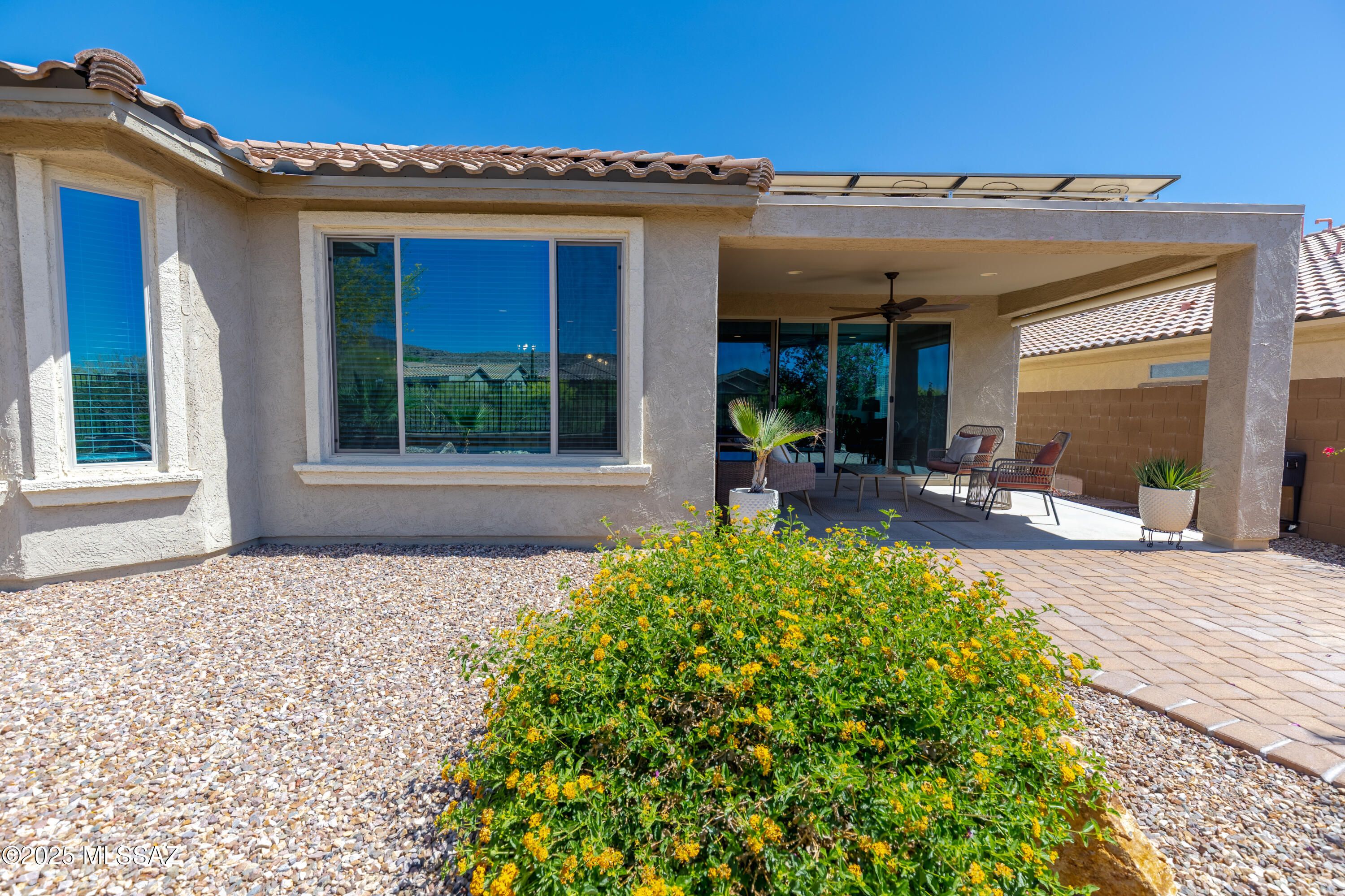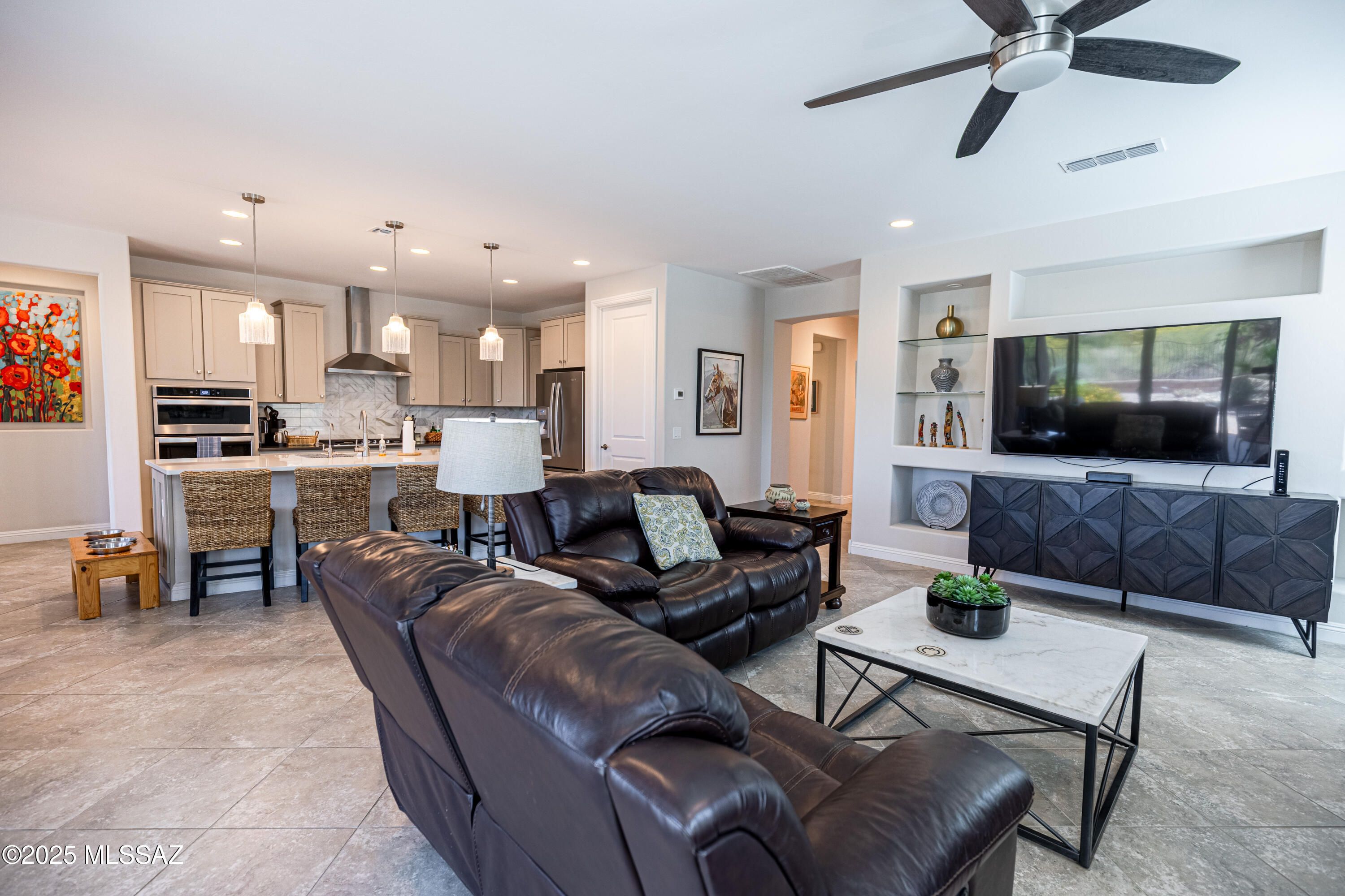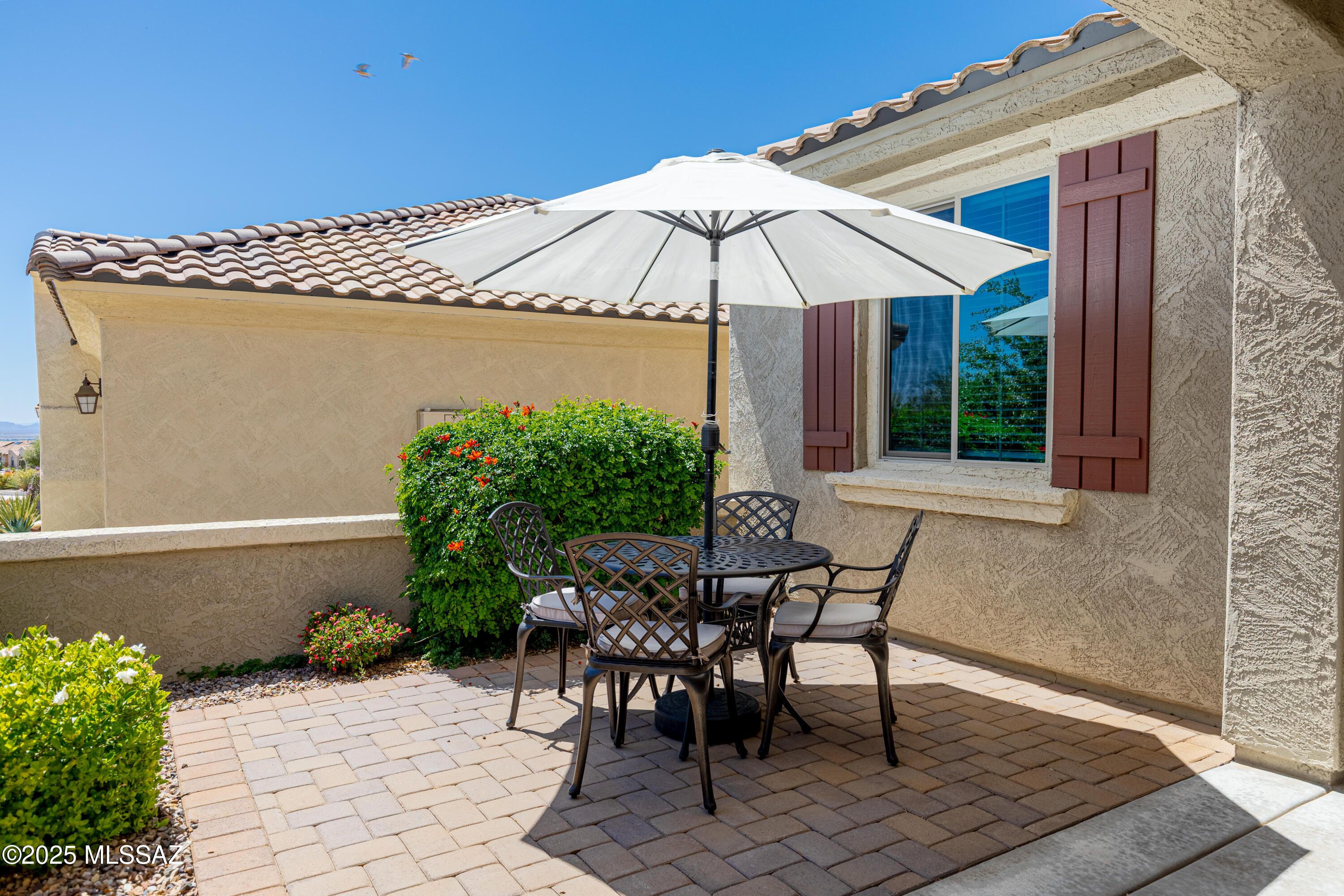 STUNNING 2 Bedroom, 2 Bathroom + Den in the Del Webb at Dove Mountain community. This expanded 1,858 sq ft Sanctuary floor plan features OWNED solar for monthly savings! The open concept layout offers a large gathering room w/built-in media wall, double sliding glass doors, dining nook, a modern gourmet kitchen w/center island, quartz countertops, built-in stainless appliances w/gas cooktop, and a walk-in pantry. The owner's suite is highlighted by a bay window, dual sink vanity plus a large walk-in shower & closet. Relish the AZ weather on the rear covered patio with sunshade & extended paver patio, while a view fence showcases the rear common area & Tortolita Mountain views. Other amenities include an extended 2-car garage, water softener & tankless water heater. Community pool & more!
