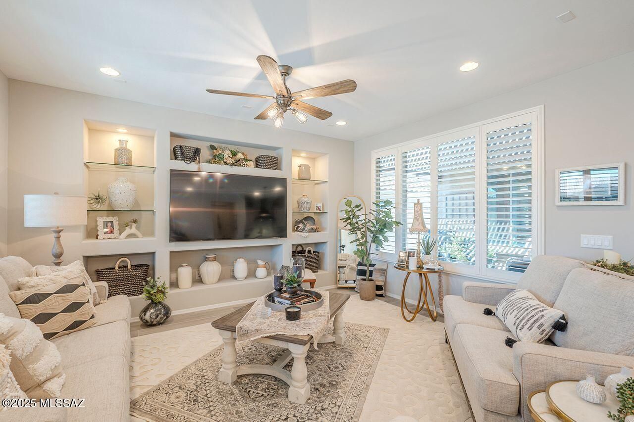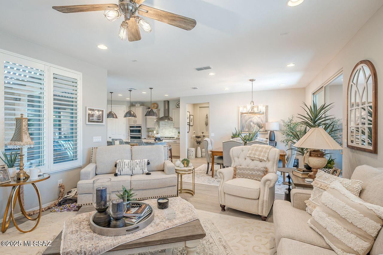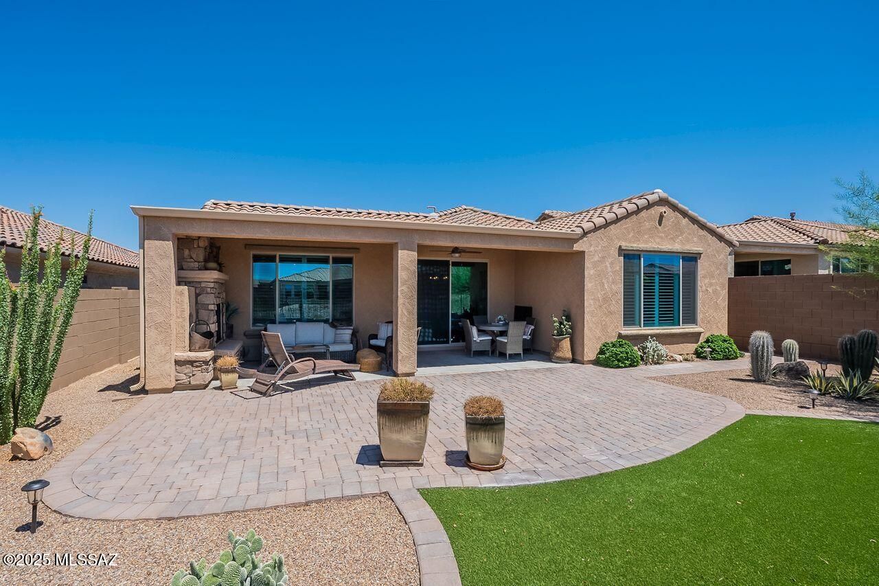 Step into refined desert living w/ this stunning 2-BD, 2-BA designer showcase home nestled in the heart of Del Webb Dove Mountain. Boasting 1,859 sq. ft. of thoughtfully designed space, this home blends modern elegance w/the warmth of a Sonoran landscape. Two generously sized BDRMS offer comfort & privacy. Flex Room: Perfect for a home office, creative studio, or cozy den. Open Concept Living: The kitchen, dining, & great room flow seamlessly--ideal for entertaining or relaxing. Owner's Suite Retreat: Features a walk-in closet & a luxurious en-suite bath w/dual separate sinks. Laundry Room is separate & easily accessible from the main hallway & garage. Washer/dryer/Refer included! Enjoy Arizona evenings on the covered patio, complete w/ a cozy FRPL. Plantation shutters thru out-Soft Water.