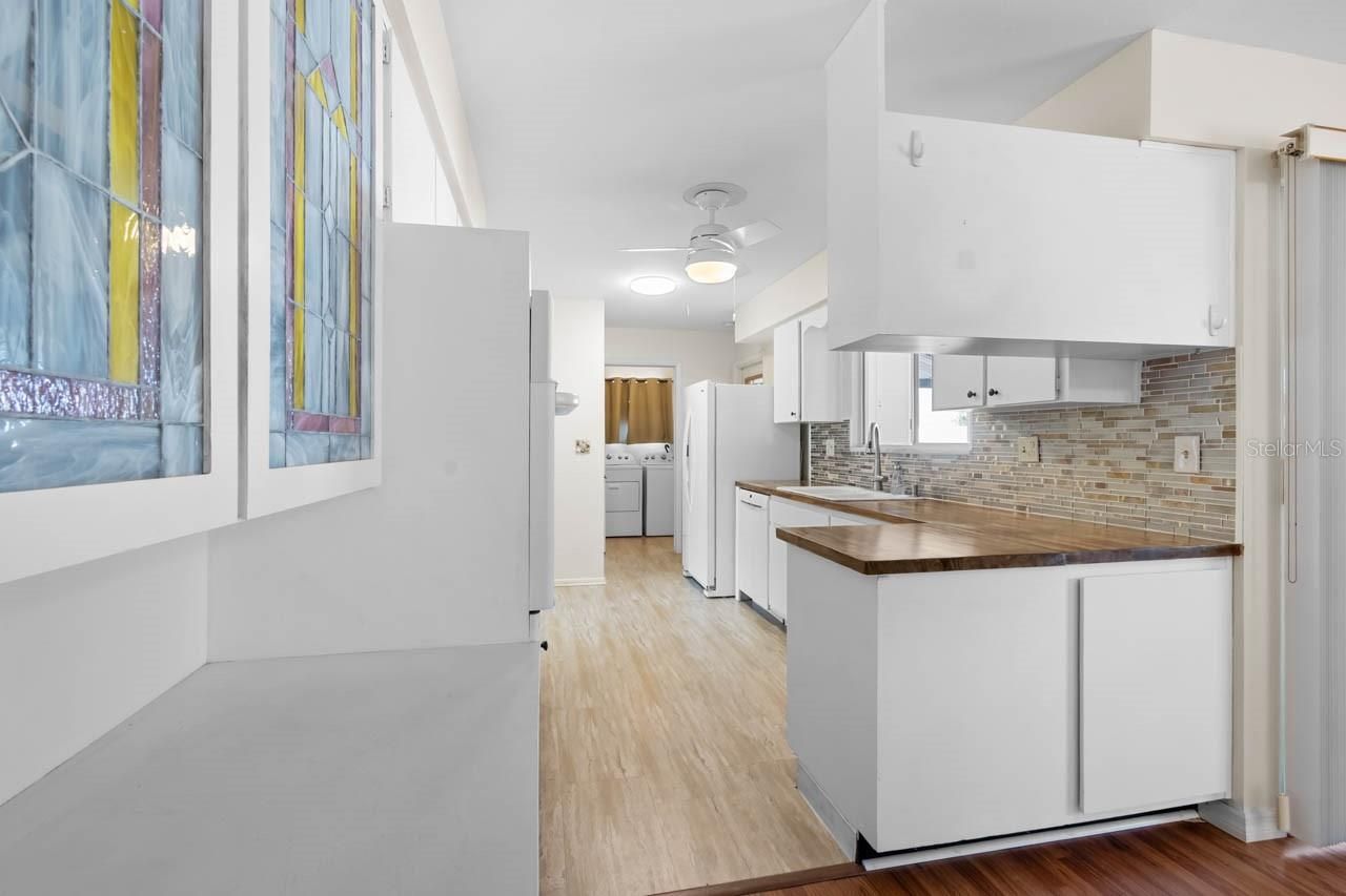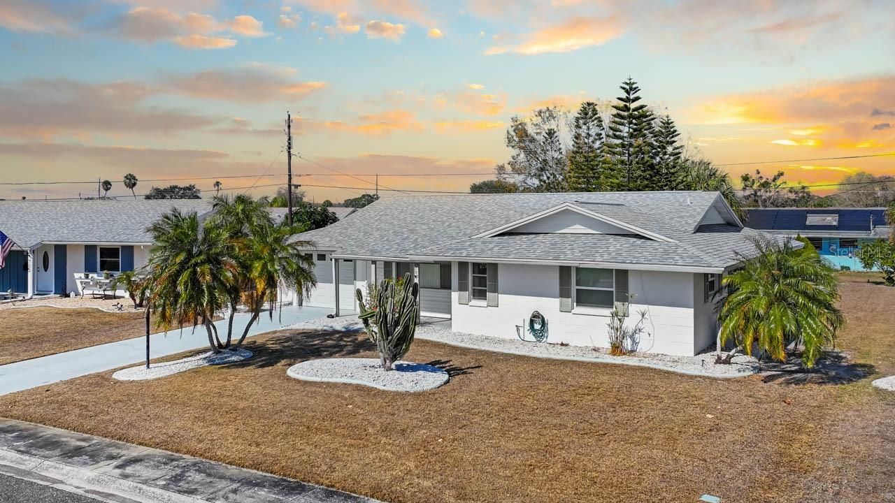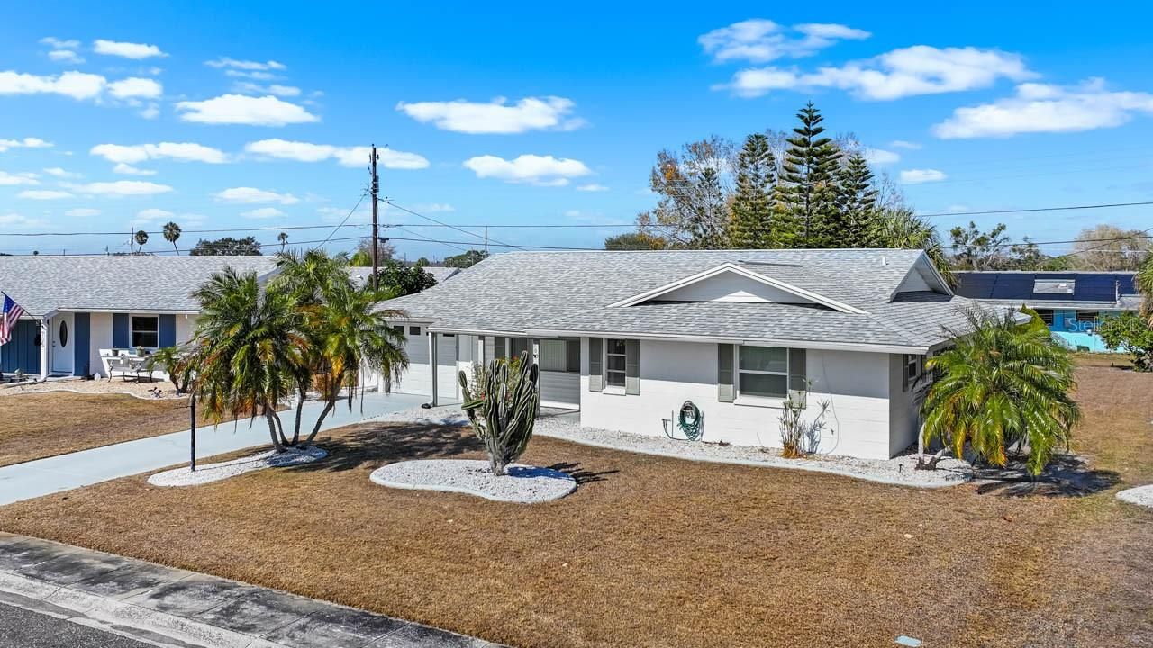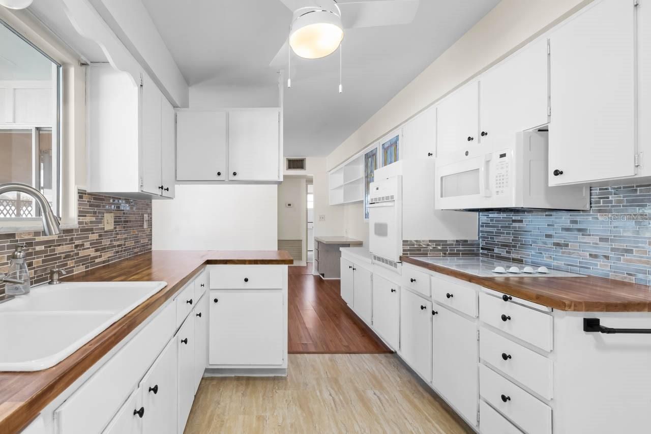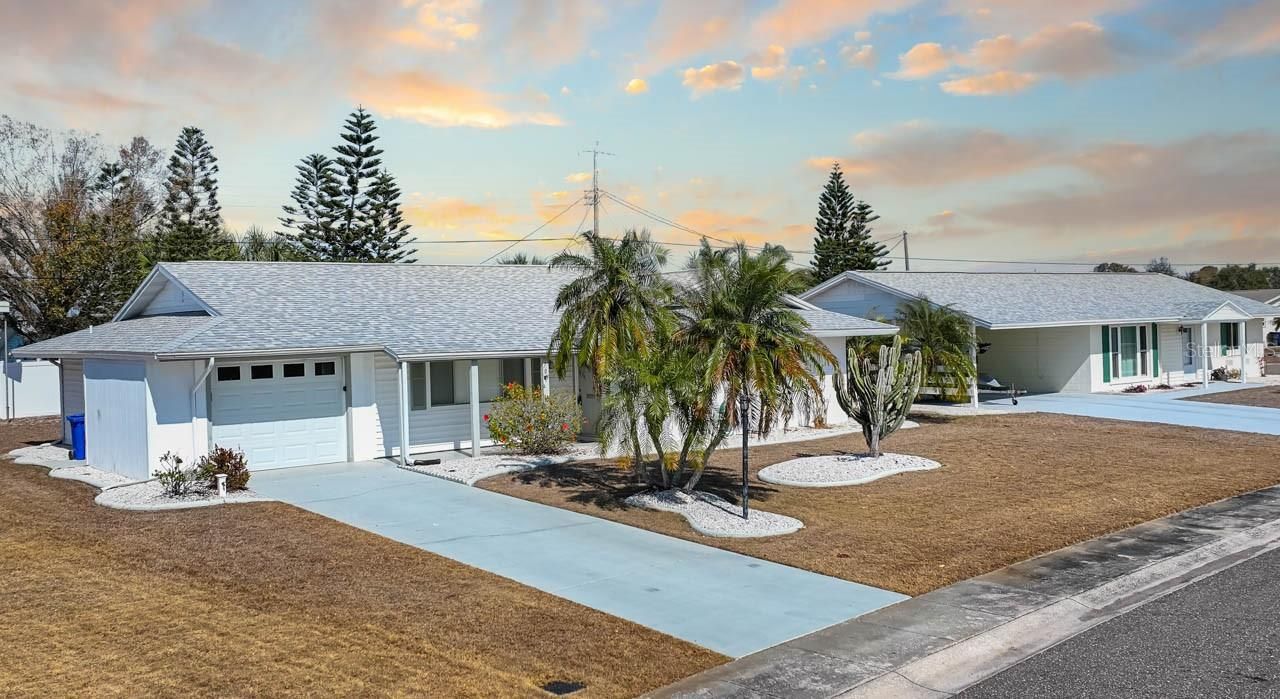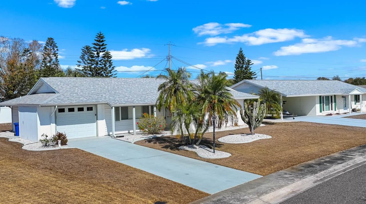 MOVE-IN READY 2-bed, 2-bath home in the active 55+ community of Sun City Center! NEW ROOF (2025), mature landscaping with curbing, WATER SOFTENER, covered front porch, COVERED & SCREENED LANAI, and NO CARPET! There is a spacious living room, a formal dining room with BUILD-INS and sliders to the lanai, and a fully-equipped kitchen outfitted with WOOD COUNTERTOPS, beautiful backsplash, and a WALL OVEN with separate cooktop. The primary suite features an oversized closet and an EN-SUITE BATHROOM complete with a single-sink vanity and shower stall. There is a second well-sized bedroom and a second full bathroom with single-sink vanity and shower stall. The interior laundry room eases the hassle of that chore, and there's even a 7X7 storage room! Sun City Center is a community designed with resident enjoyment in mind. Find peace and fun in this beautiful home and neighborhood. Schedule your showing today!