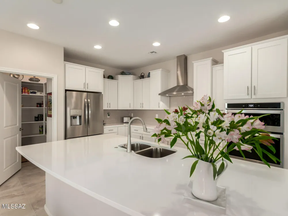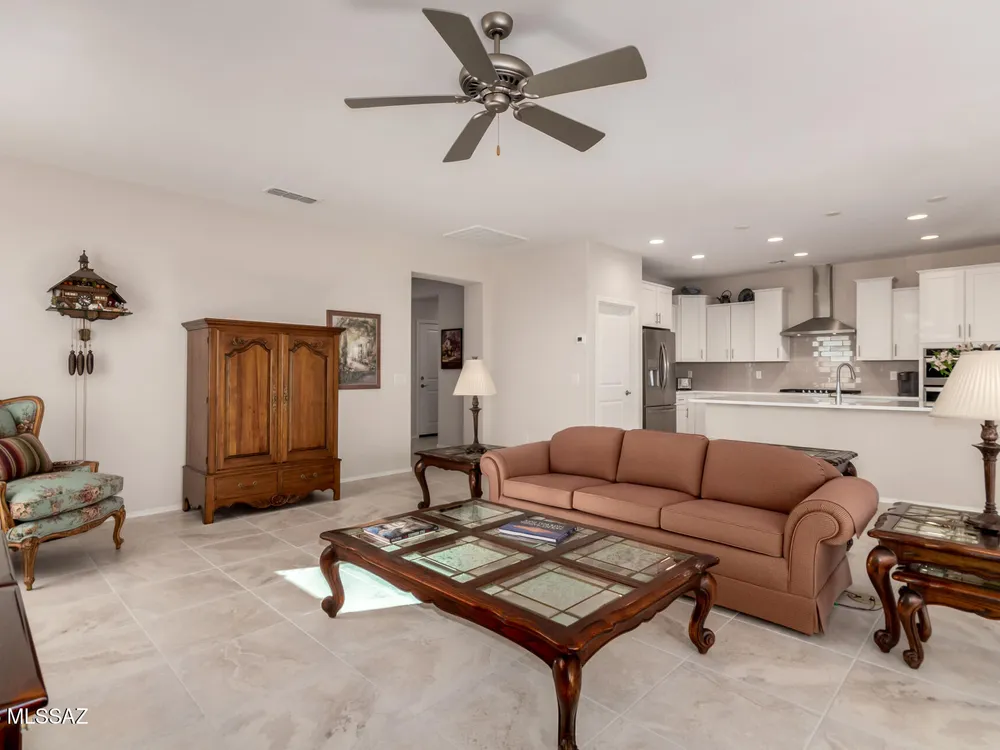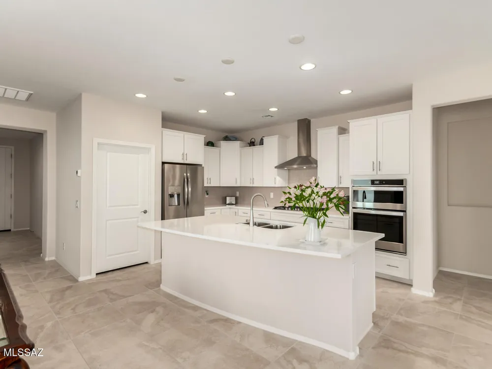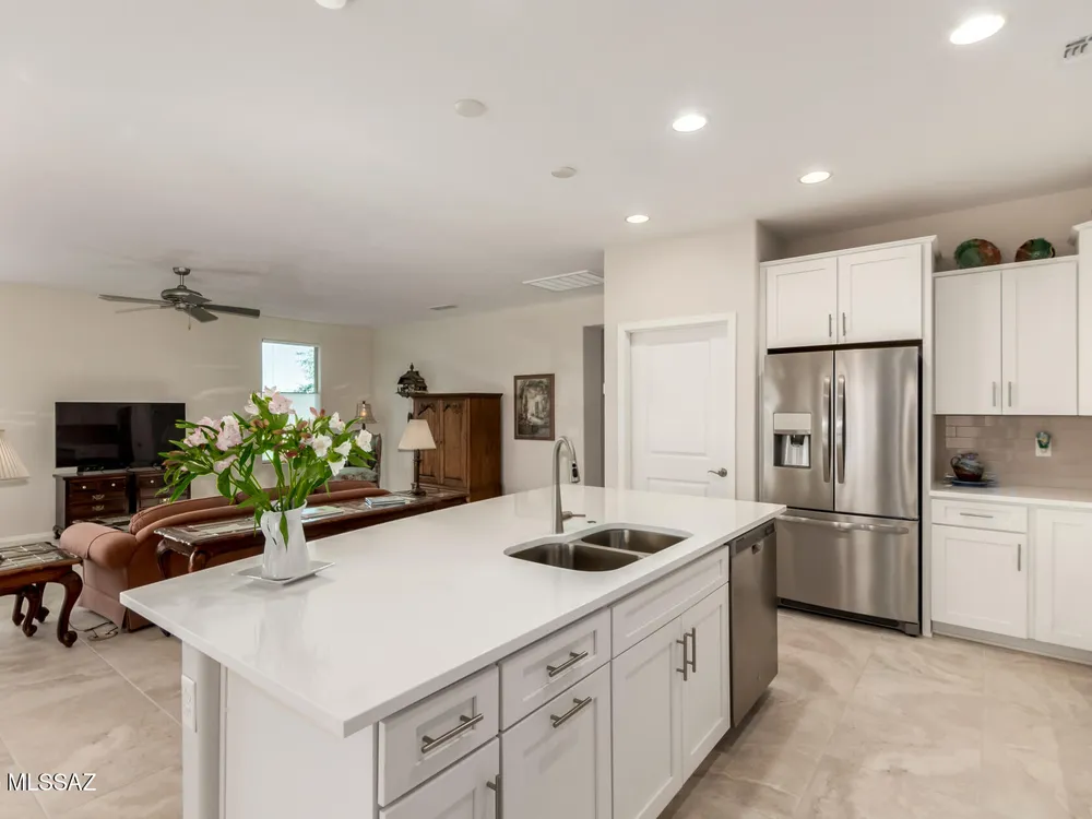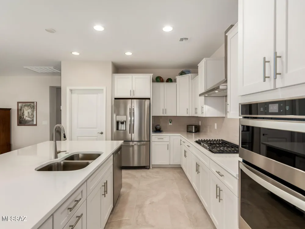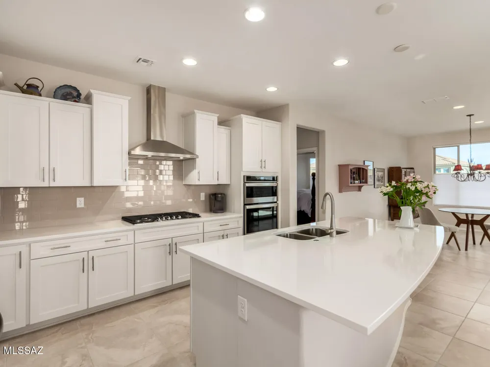 GORGEOUS Dove Mountain home located in the Del Webb community. Original owner immaculate expanded Sanctuary model. This stunning 1899 square foot 2 bedroom, den, 2 bath home boasts many high quality upgrades and features including an impressive open floor plan, neutral 20'' porcelain tile flooring with color sealed grout, 2-tone Egret white interior palette, bountiful natural light and both 8' and 12' sliding glass doors connecting the indoor and outdoor living spaces. The modern and timeless white on white chef kitchen with staggered Shaker cabinetry and Haku quartz countertops features built-in SS appliances, gas range top, 8' island with breakfast bar and a large walk-in pantry. The great room showcases the comforts of todays' living. The primary bedroom includes soft