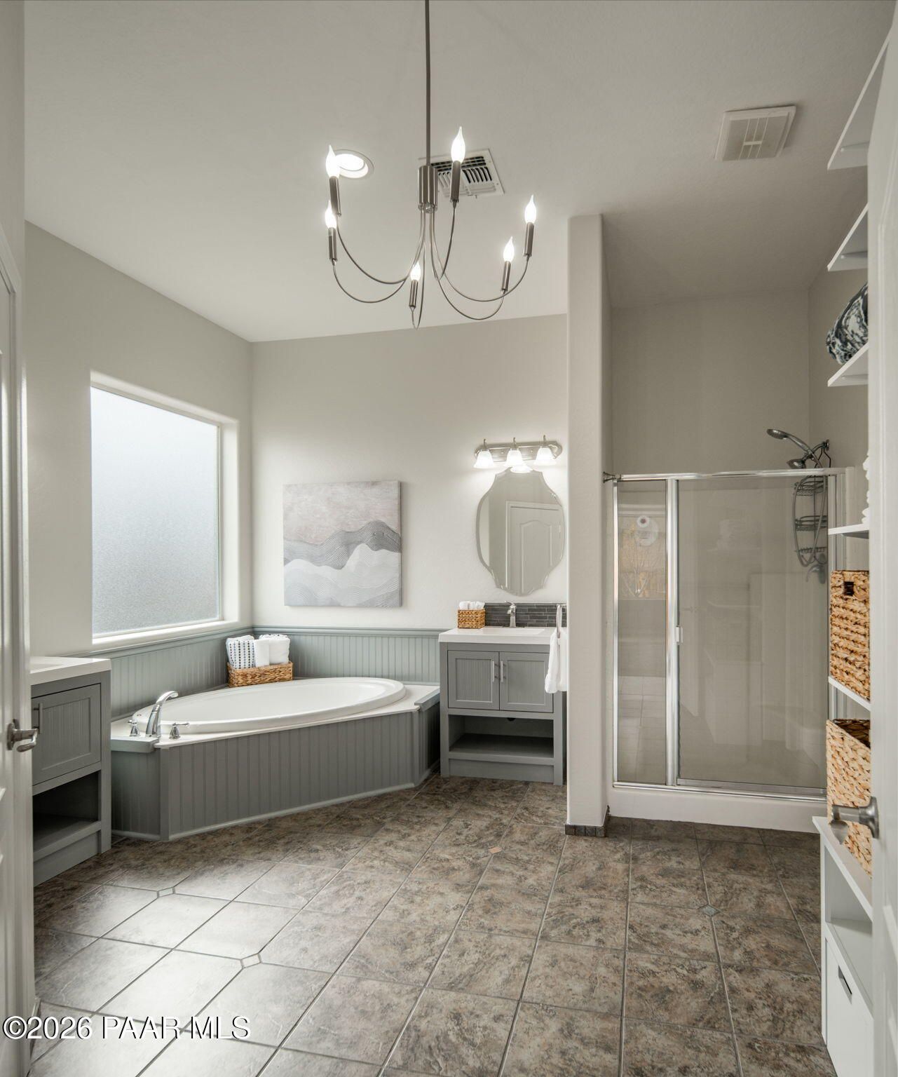 - Ceiling Fan(s), Eat-in Kitchen, Soaking Tub, Kitchen/Dining Combo, Kitchen Island, Living/Dining Room, Single Living Level, Primary Downstairs, Quartz Countertops, High Ceilings, Reverse Osmosis System, Wired for Sound, Walk-In Closet(s), Washer/Dryer Hookup