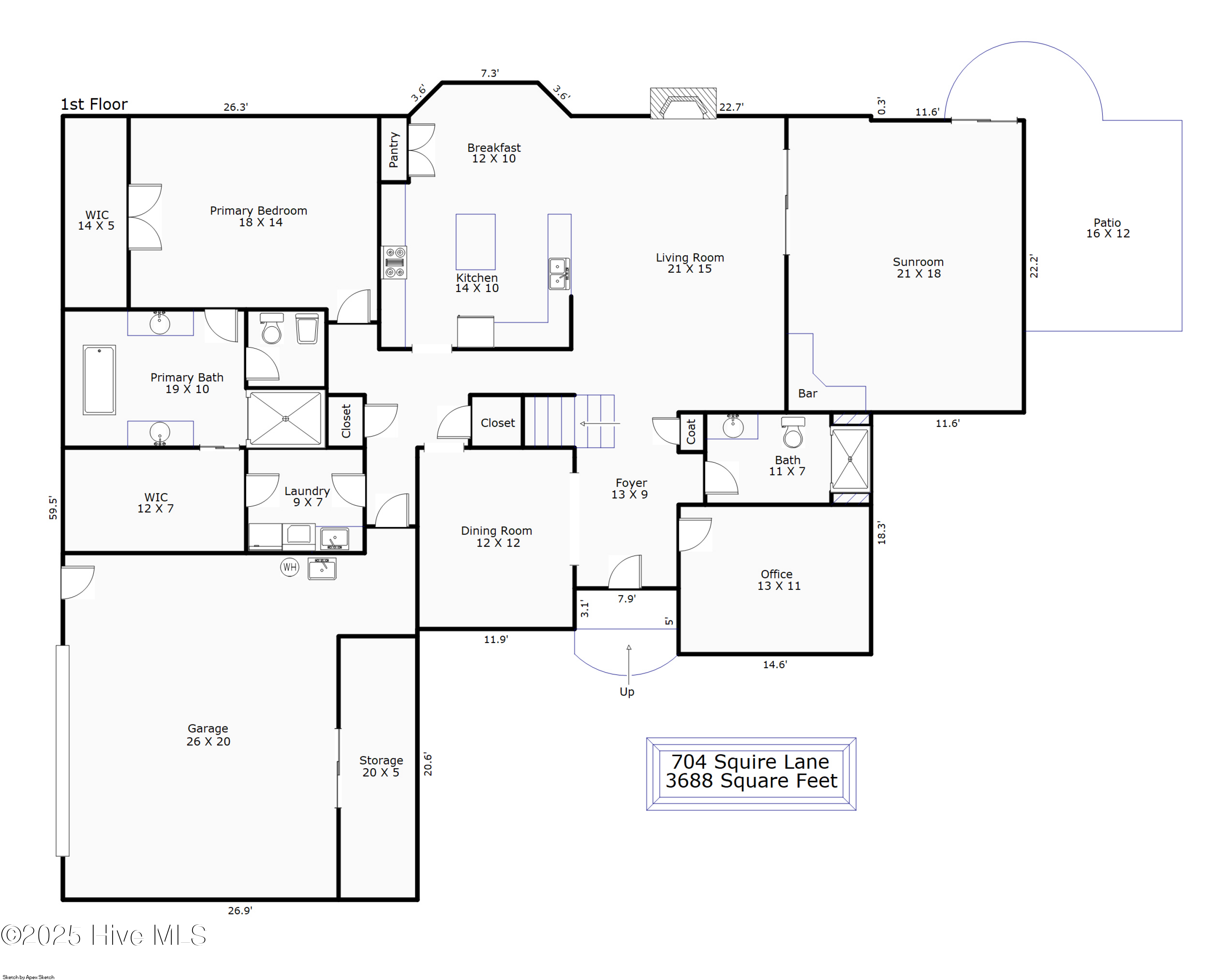 - Master Downstairs, Walk-In Closet(s), High Ceilings, Entrance Foyer, Kitchen Island, Ceiling Fan(s), Walk-In Shower, Blinds, Separate/Formal Dining Room