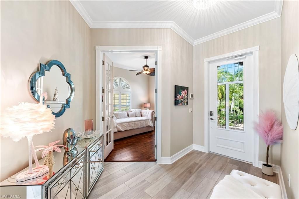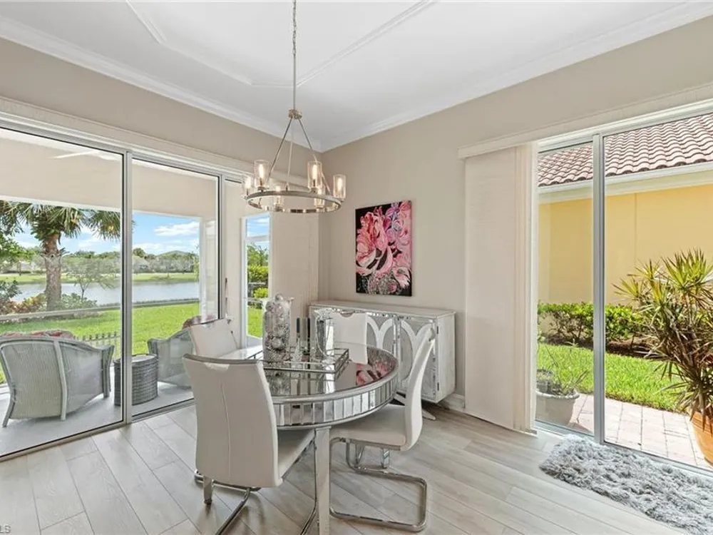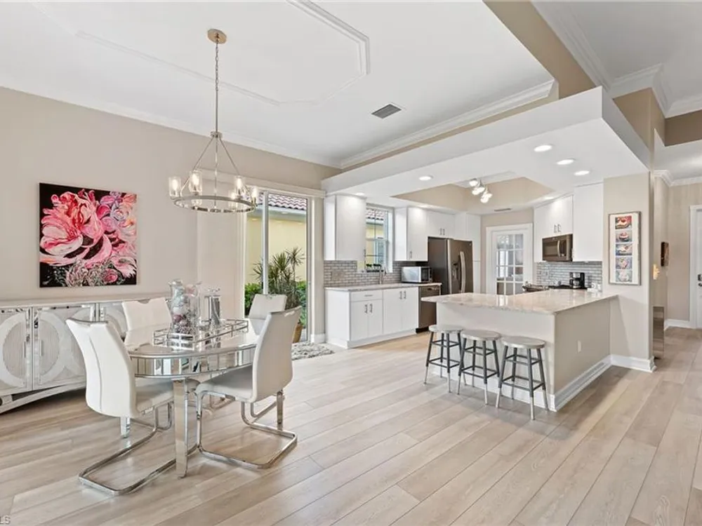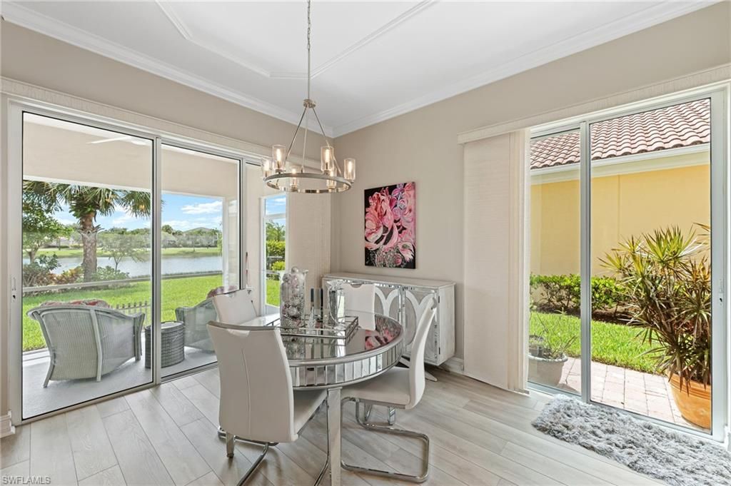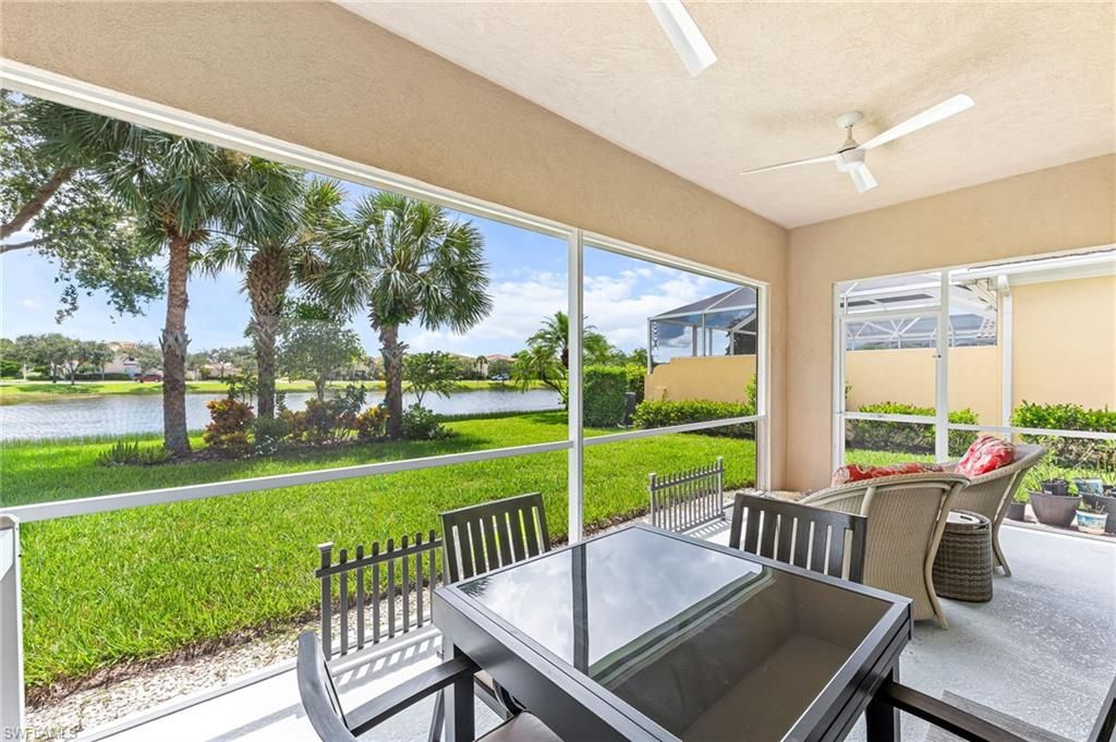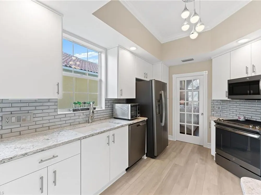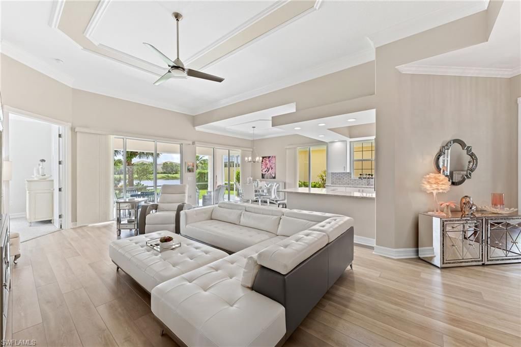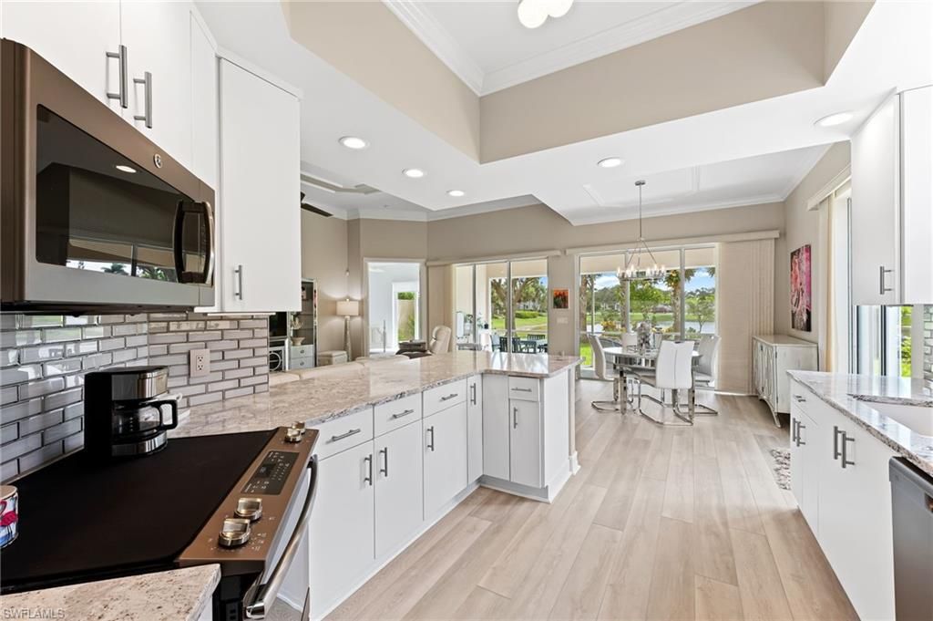 Welcome to the Oakmont model home in Verona Walk—a beautifully updated, move-in-ready residence you won’t want to miss. This home has been thoughtfully upgraded with features and finishes that add both style and function. Step inside to find gorgeous Plus Premium vinyl flooring that runs throughout the main living areas, complemented by new baseboards and newly installed crown molding & ceiling molding for a clean, modern touch. The kitchen was fully renovated in 2020 by Kitchen Solvers and features a sleek, modern backsplash that pairs perfectly with slate appliances (2017). The dishwasher was recently replaced in 2024, adding even more convenience. The den, accessible through new French doors, features rich Acadia wood flooring (2014) and is filled with natural light—making it an ideal space for a home office or guest room. The spacious master bedroom includes new carpet (2018) and a large en-suite bathroom. Both the bedroom and bathroom have been freshly painted. Throughout the home, you’ll find custom mirrors and upgraded lighting fixtures from Lighting First, enhancing both bathrooms and main living spaces.The two guest bedrooms are bright, spacious, and outfitted with the same premium vinyl flooring, offering comfort and style for family or visitors. The laundry room is clean and functional, complete with a utility sink.Additional updates include; water heater replaced in 2021, AC unit professionally serviced every six months andHurricane shutters installed in 2009 by AAA Hurricane Protection (electric shutters on the lanai, roll-down on all other openings). The community of Verona Walk is a vibrant and friendly community. You’ll enjoy access to a well-appointed Town Center featuring a café, ice cream shop, post office, gas station, salon, bank, and even a full-time activities director. Just minutes from downtown Naples, this home is close to white sand beaches, restaurants, and shopping. Don’t miss your chance to see this exceptional home—schedule a showing today!