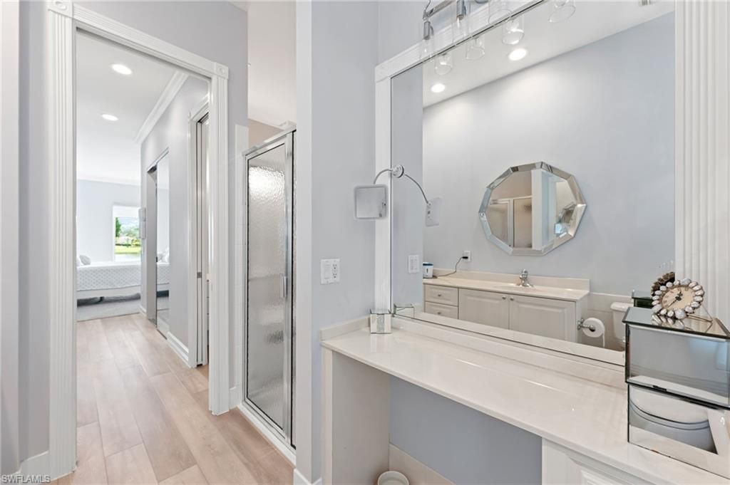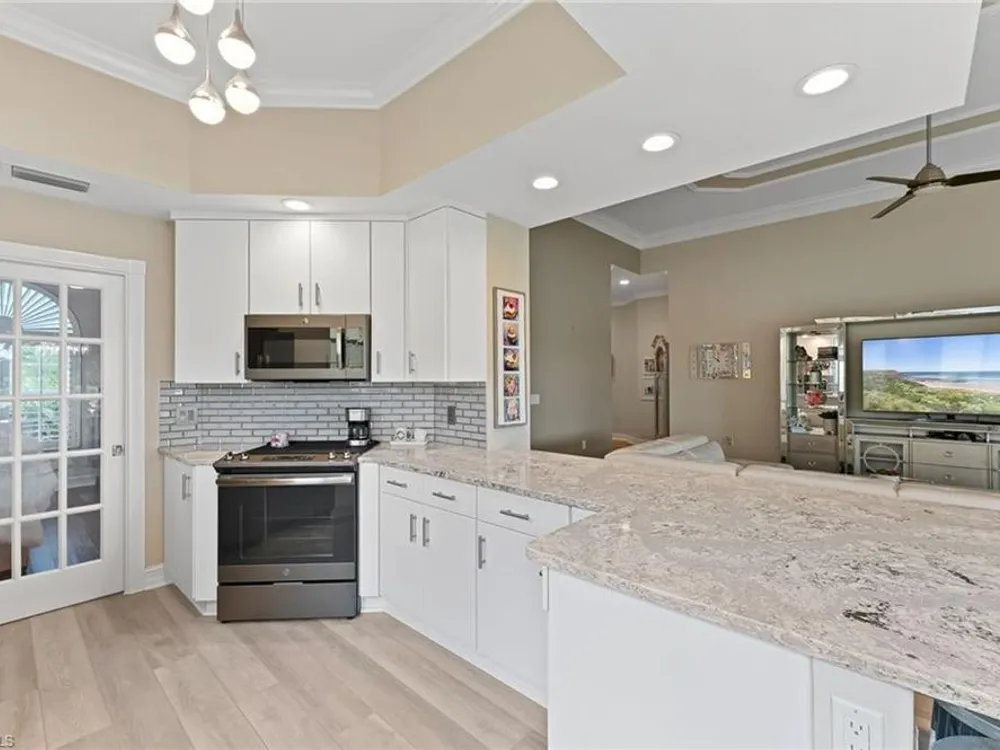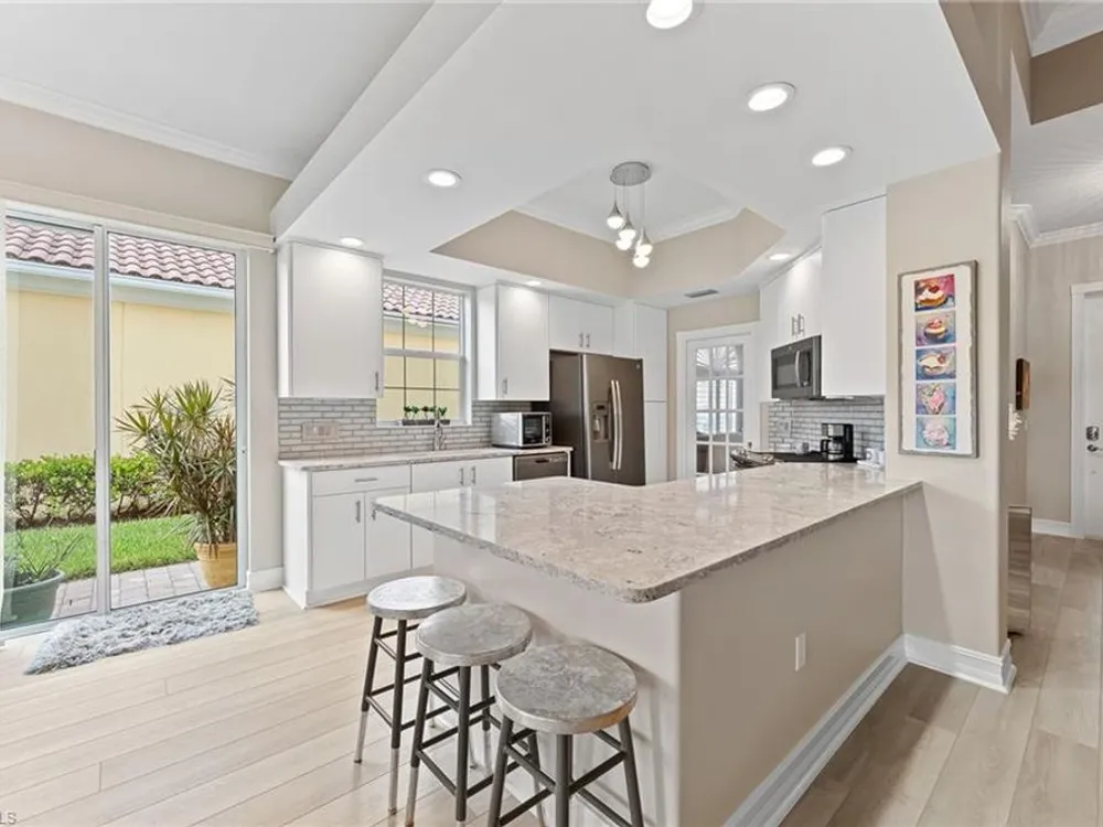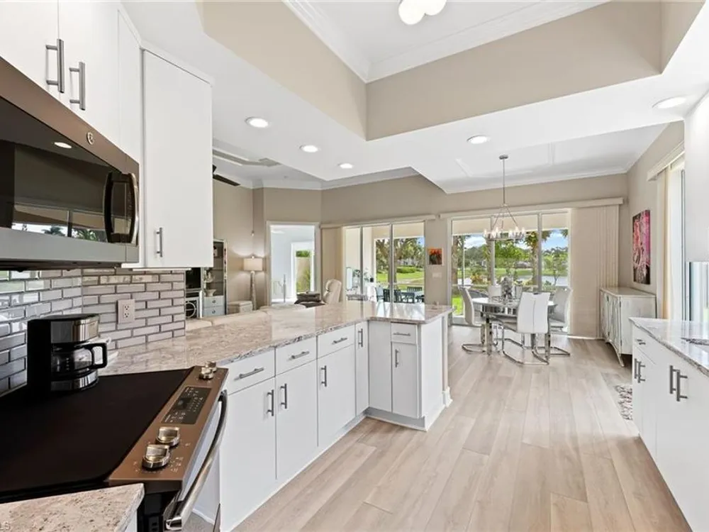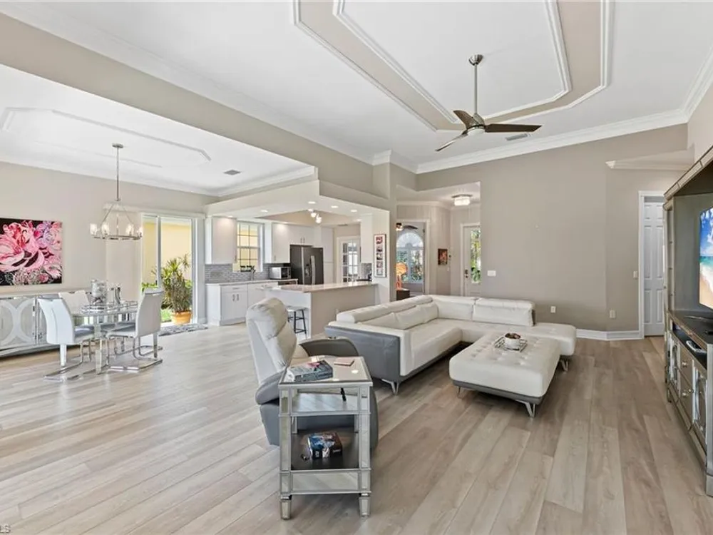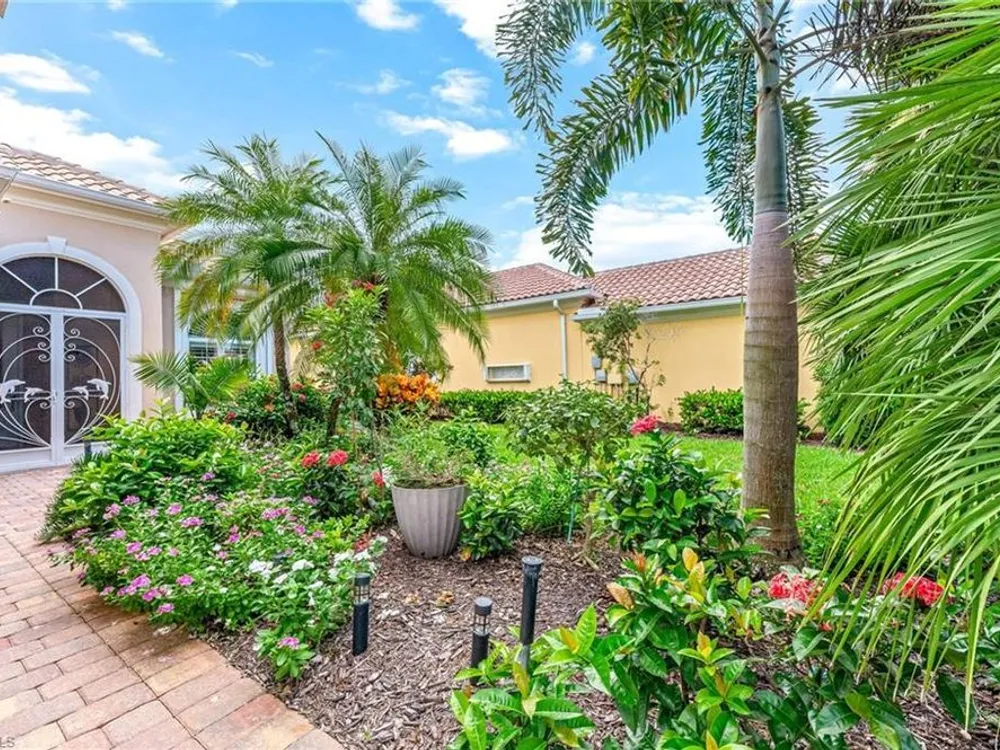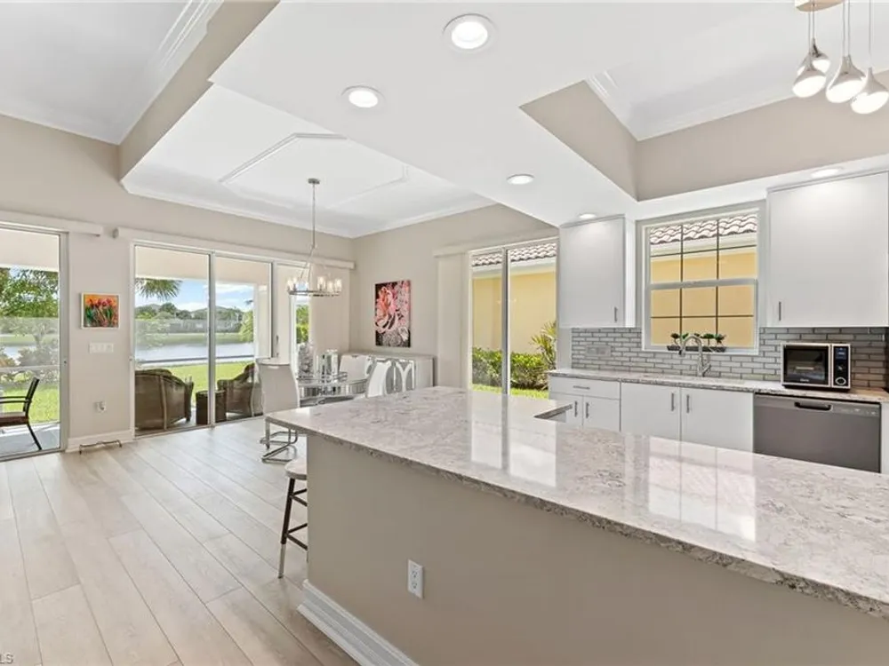 Welcome to the Oakmont model home in Verona Walk—a beautifully updated, move-in-ready residence you won’t want to miss. This home has been thoughtfully upgraded with features and finishes that add both style and function. Step inside to find gorgeous Plus Premium vinyl flooring that runs throughout the main living areas, complemented by new baseboards and newly installed crown molding & ceiling molding for a clean, modern touch. The kitchen was fully renovated in 2020 by Kitchen Solvers and features a sleek, modern backsplash that pairs perfectly with slate appliances (2017). The dishwasher was recently replaced in 2024, adding even more convenience. The den, accessible through new French doors, features rich Acadia wood flooring (2014) and is filled with natural light—making it an ideal space for a home office or guest room. The spacious master bedroom includes new carpet (2018) and a large en-suite bathroom. Both the bedroom and bathroom have been freshly painted. Throughout the home, you’ll find custom mirrors and upgraded lighting fixtures from Lighting First, enhancing both bathrooms and main living spaces.The two guest bedrooms are bright, spacious, and outfitted with the same premium vinyl flooring, offering comfort and style for family or visitors. The laundry room is clean and functional, complete with a utility sink.Additional updates include; water heater replaced in 2021, AC unit professionally serviced every six months andHurricane shutters installed in 2009 by AAA Hurricane Protection (electric shutters on the lanai, roll-down on all other openings). The community of Verona Walk is a vibrant and friendly community. You’ll enjoy access to a well-appointed Town Center featuring a café, ice cream shop, post office, gas station, salon, bank, and even a full-time activities director. Just minutes from downtown Naples, this home is close to white sand beaches, restaurants, and shopping. Don’t miss your chance to see this exceptional home—schedule a showing today!
