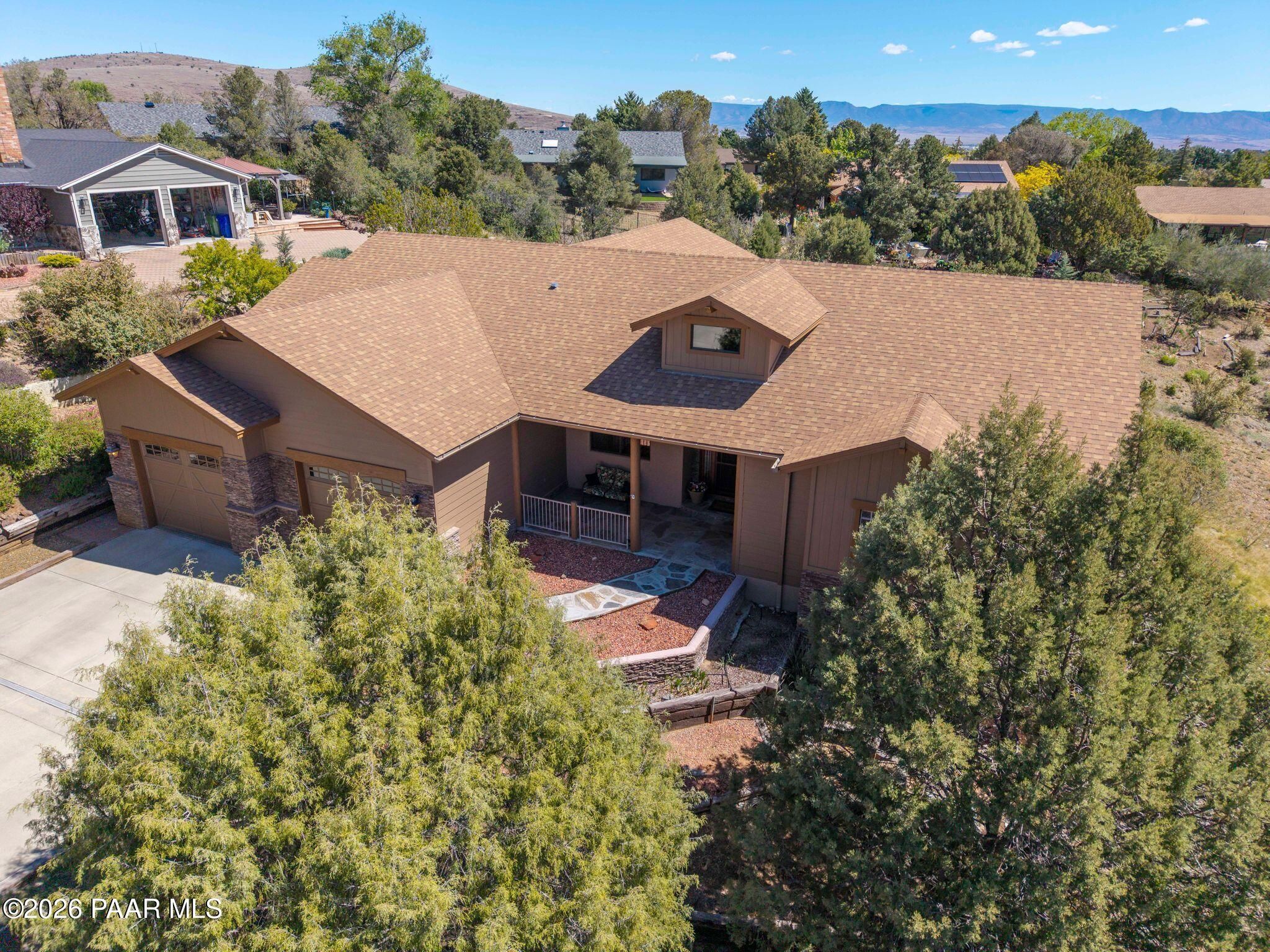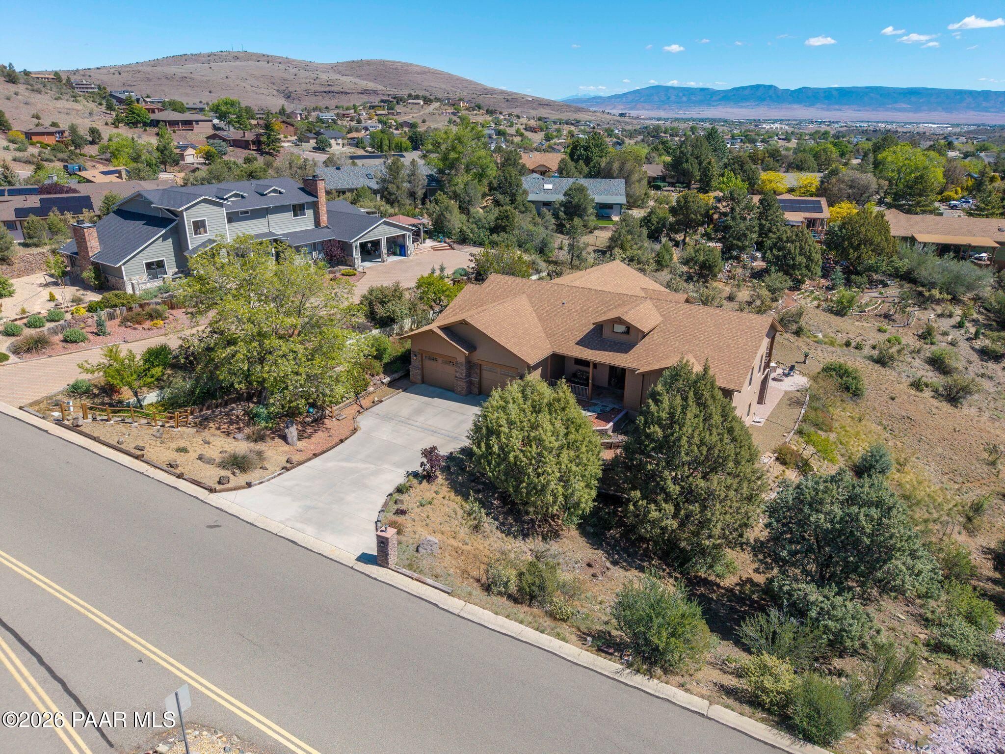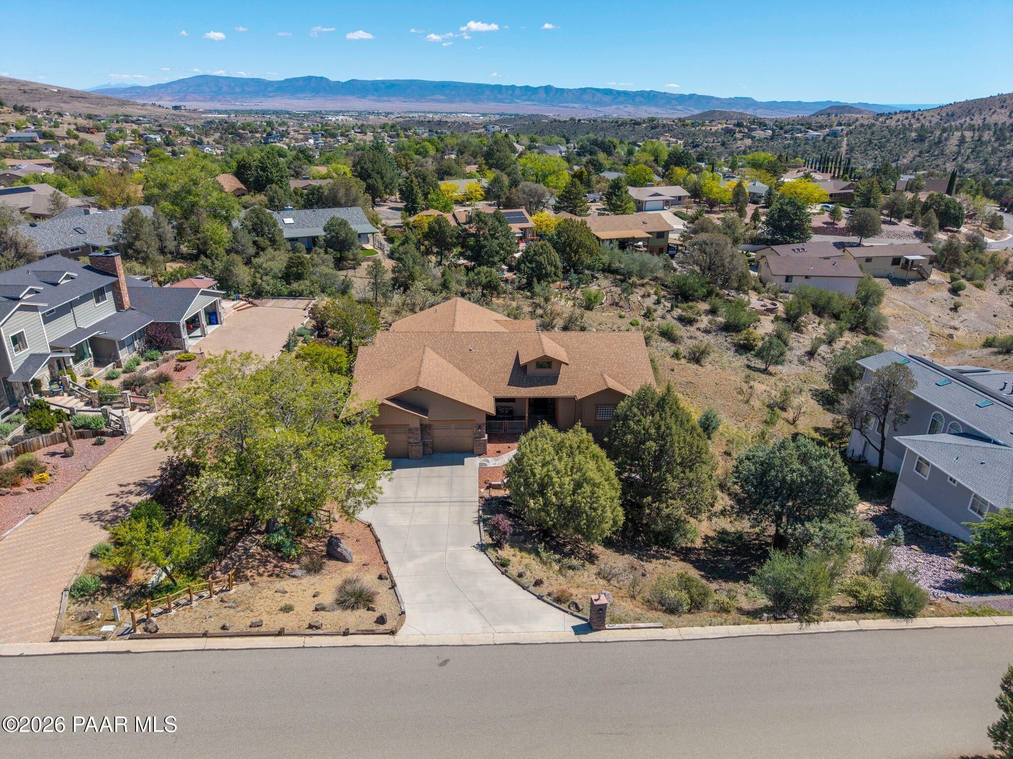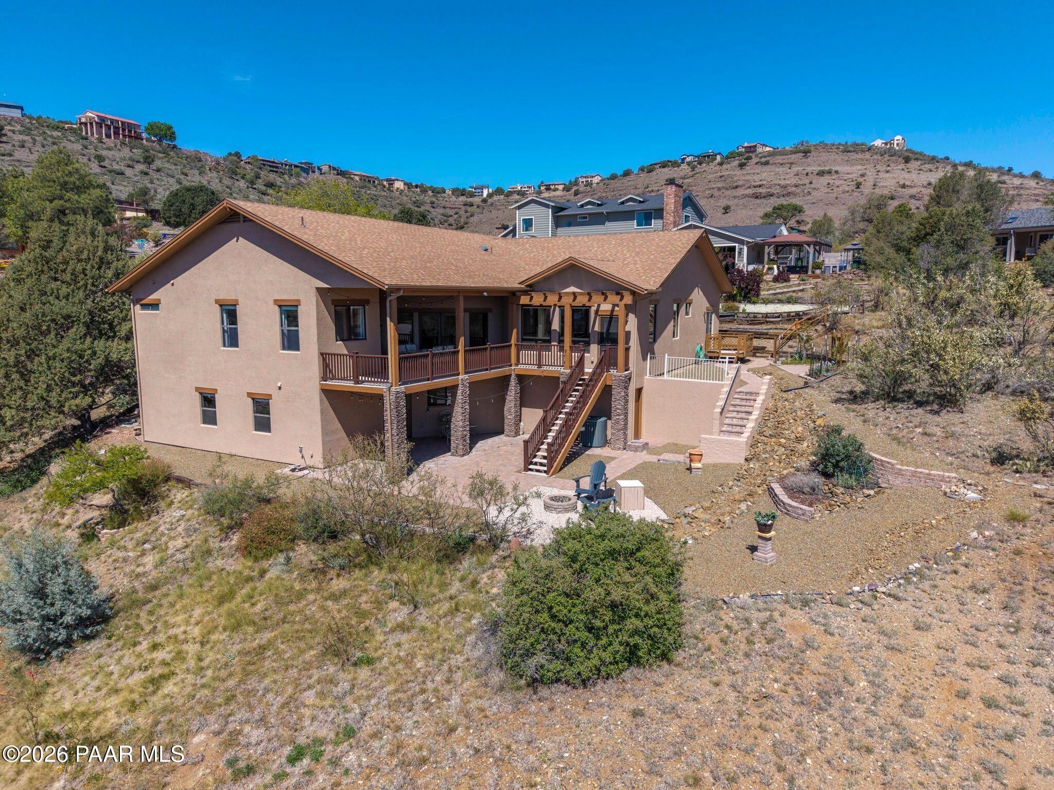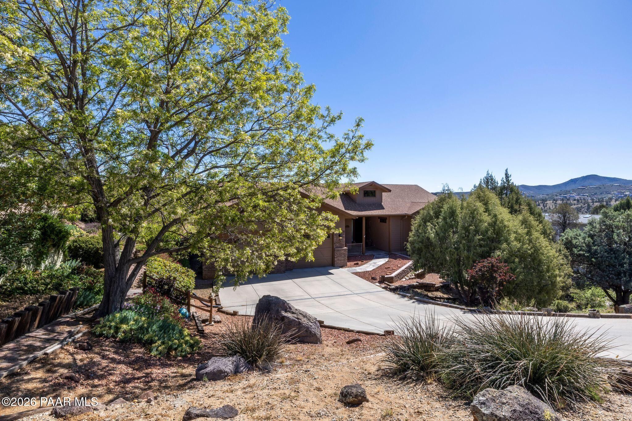 Exceptional living in the sought-after Yavapai Hills community, where comfort, versatility, and stunning mountain views come together. This beautifully maintained home offers main level living with a desirable split floor plan featuring wood floors, four bedrooms, and three baths, plus a spacious lower level ideal for multi-generational living with a guest suite, office or potential bedroom, and a media or hobby room. The kitchen is designed to impress with knotty alder cabinetry, granite countertops, a breakfast bar, walk-in pantry, and picturesque views from the sink, along with newer appliances. The private master suite is thoughtfully separated, featuring a large walk-in closet, French doors to the deck, and a spacious bath with dual vanities, granite finishes, a soaker tub and separate shower. Enjoy indoor-outdoor living with a covered Trex deck showcasing amazing views, multiple covered patios, a private guest deck, level backyard with pavers and firepit, and added privacy with common area on two sides. Additional highlights include two wet bars, abundant storage, an oversized 24' x 30' garage, fire suppression system, newer roof (2021), exterior paint (2025), water heater (2021), and mature landscaping with cherry and peach trees. This all-electric home offers the perfect blend of space, privacy, and functionality in one of Prescott's most desirable neighborhoods. Currently all electric with gas plumbed and available for easy conversion. See feature sheet for more info.