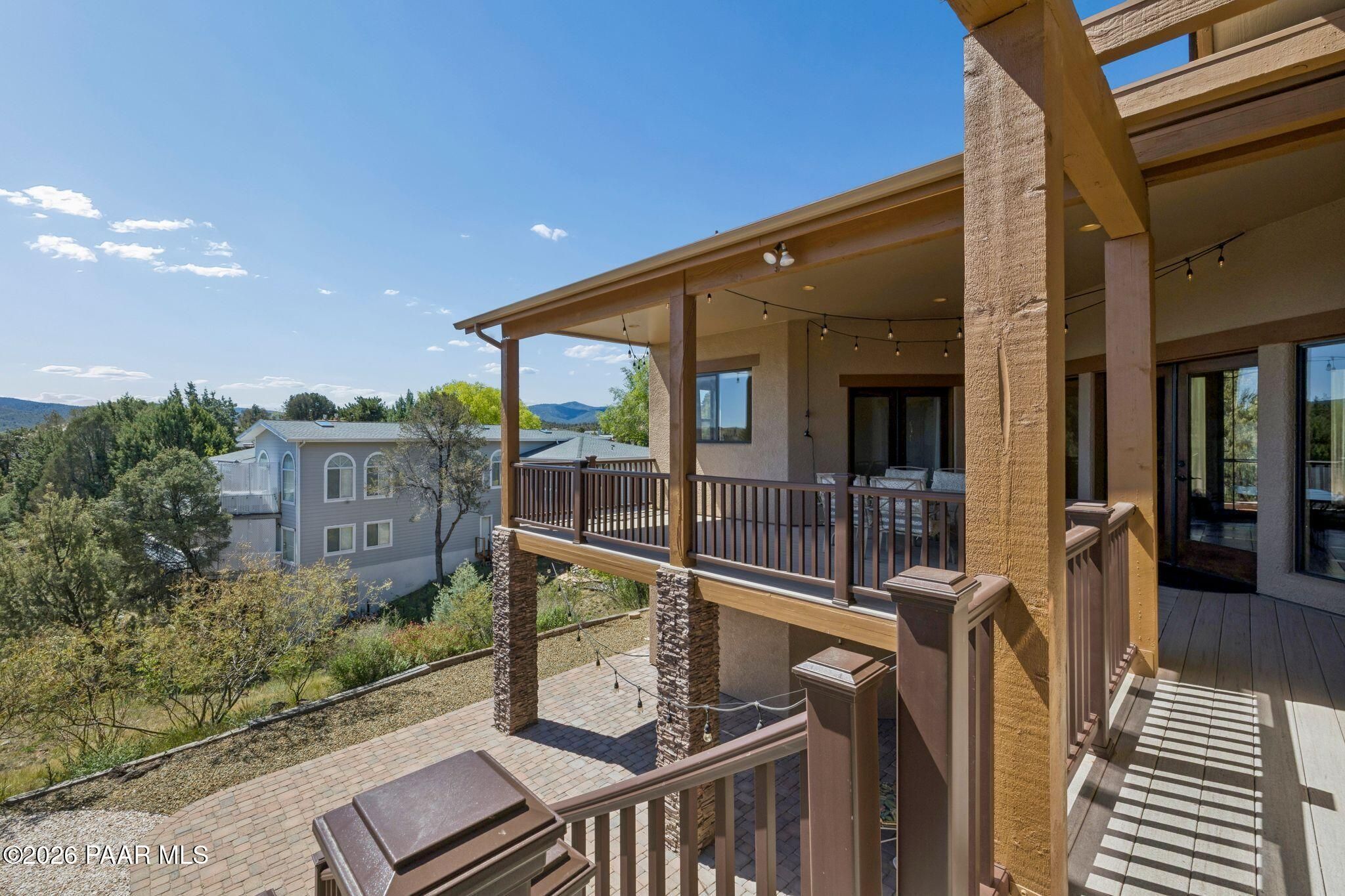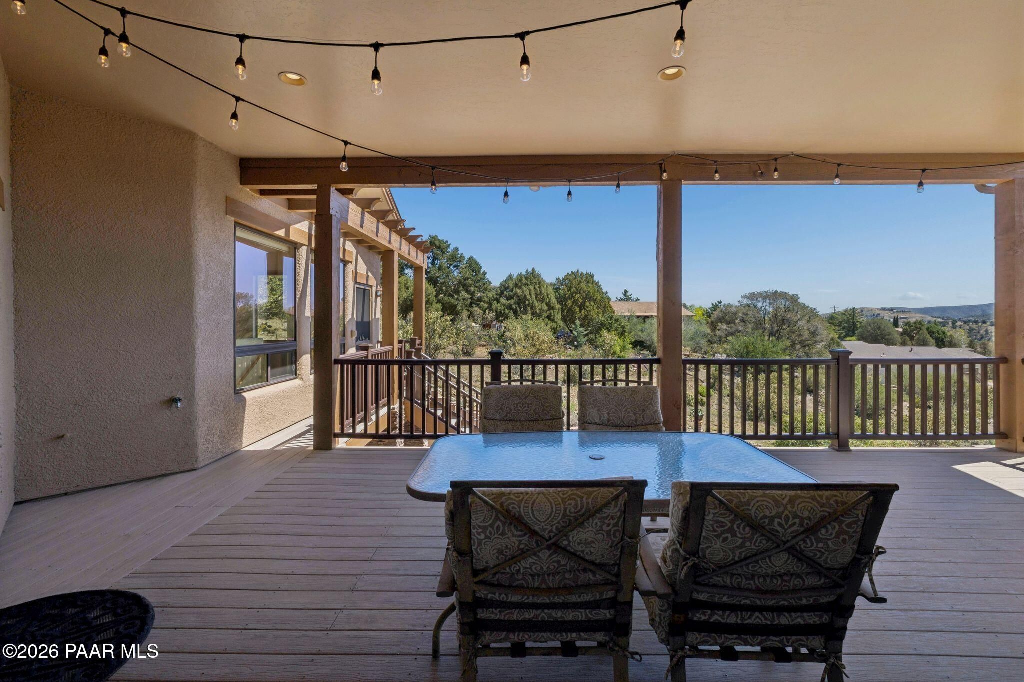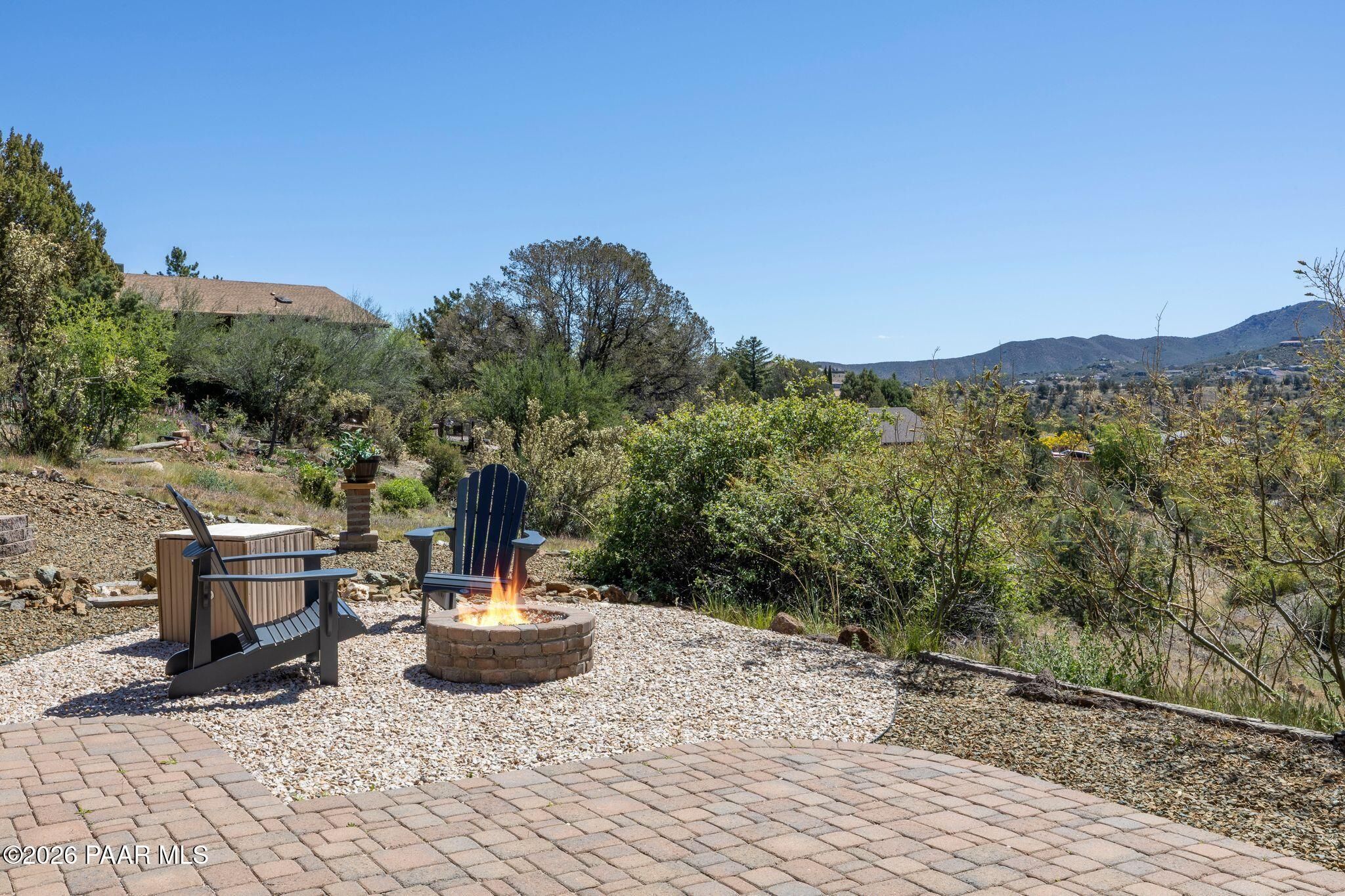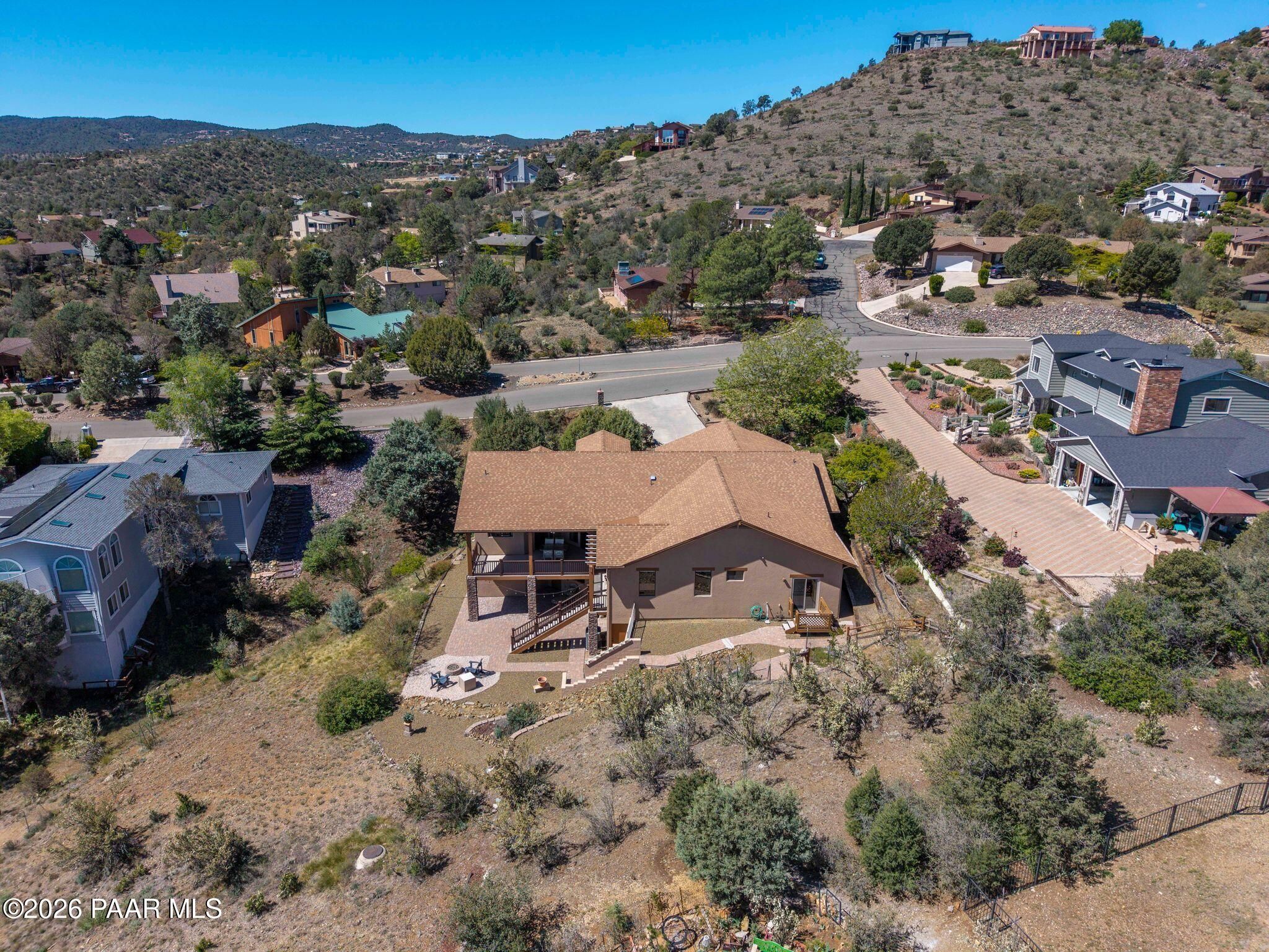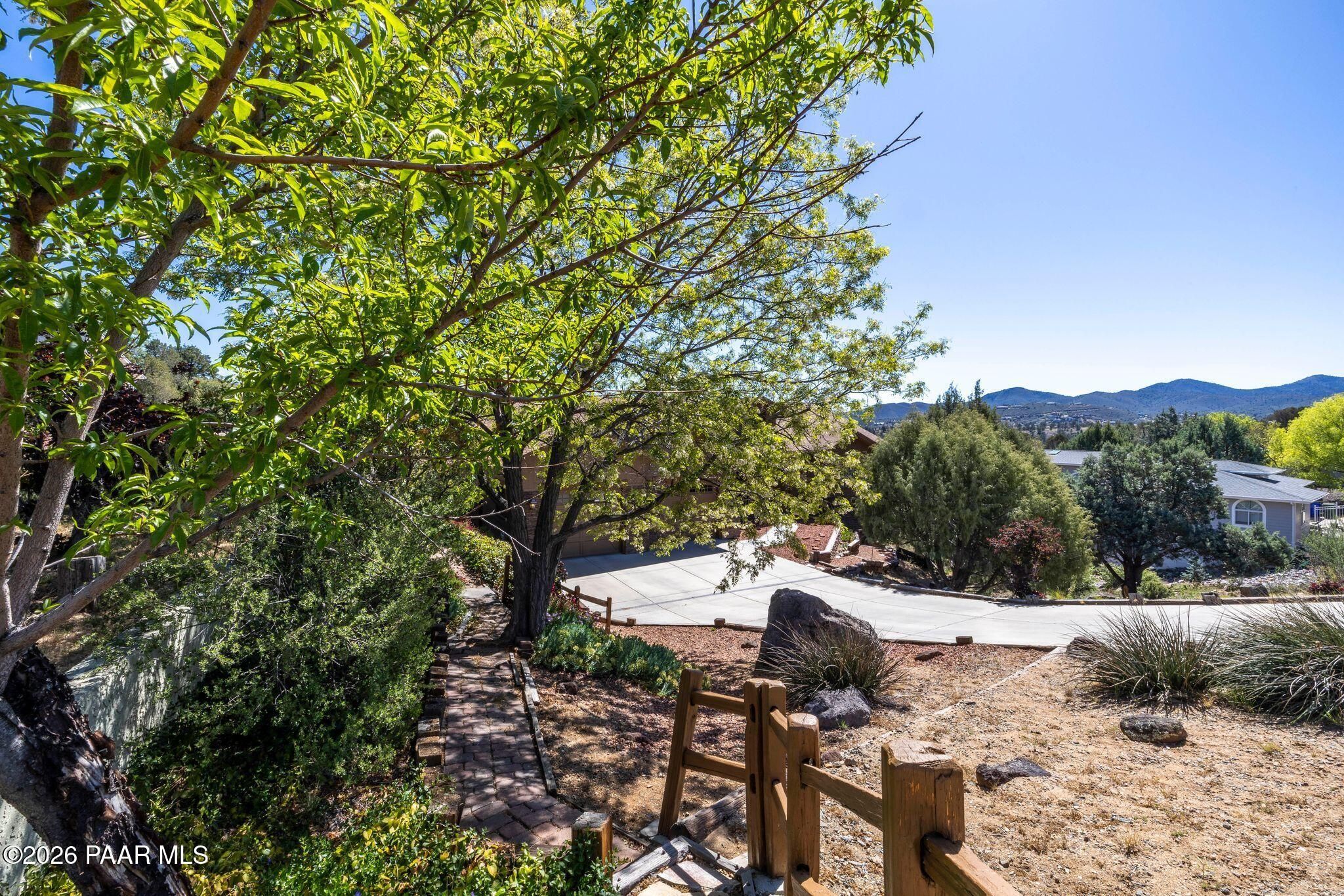 Exceptional living in the sought-after Yavapai Hills community, where comfort, versatility, and stunning mountain views come together. This beautifully maintained home offers main level living with a desirable split floor plan featuring wood floors, four bedrooms, and three baths, plus a spacious lower level ideal for multi-generational living with a guest suite, office or potential bedroom, and a media or hobby room. The kitchen is designed to impress with knotty alder cabinetry, granite countertops, a breakfast bar, walk-in pantry, and picturesque views from the sink, along with newer appliances. The private master suite is thoughtfully separated, featuring a large walk-in closet, French doors to the deck, and a spacious bath with dual vanities, granite finishes, a soaker tub and separate shower. Enjoy indoor-outdoor living with a covered Trex deck showcasing amazing views, multiple covered patios, a private guest deck, level backyard with pavers and firepit, and added privacy with common area on two sides. Additional highlights include two wet bars, abundant storage, an oversized 24' x 30' garage, fire suppression system, newer roof (2021), exterior paint (2025), water heater (2021), and mature landscaping with cherry and peach trees. This all-electric home offers the perfect blend of space, privacy, and functionality in one of Prescott's most desirable neighborhoods. Currently all electric with gas plumbed and available for easy conversion. See feature sheet for more info.