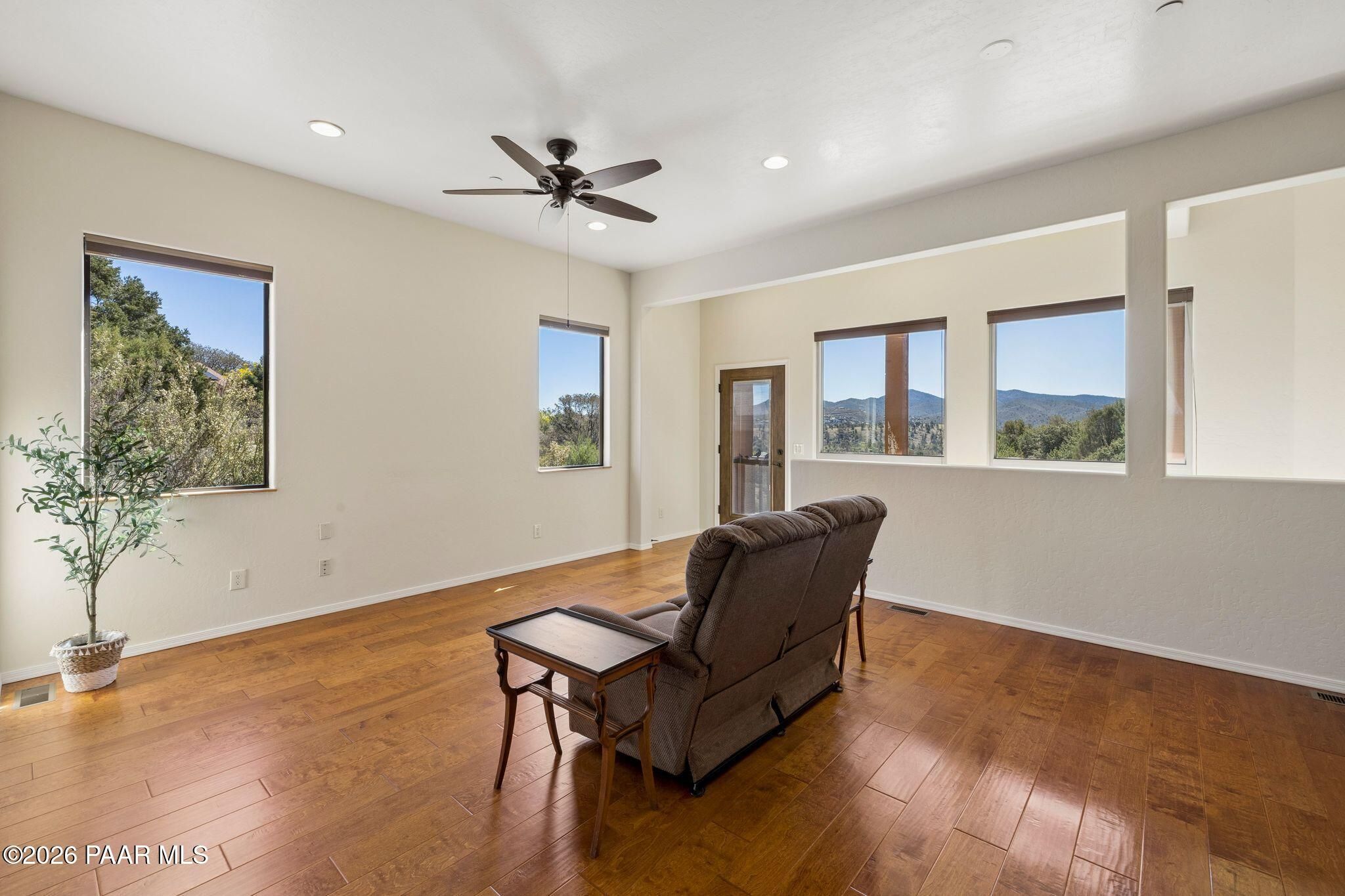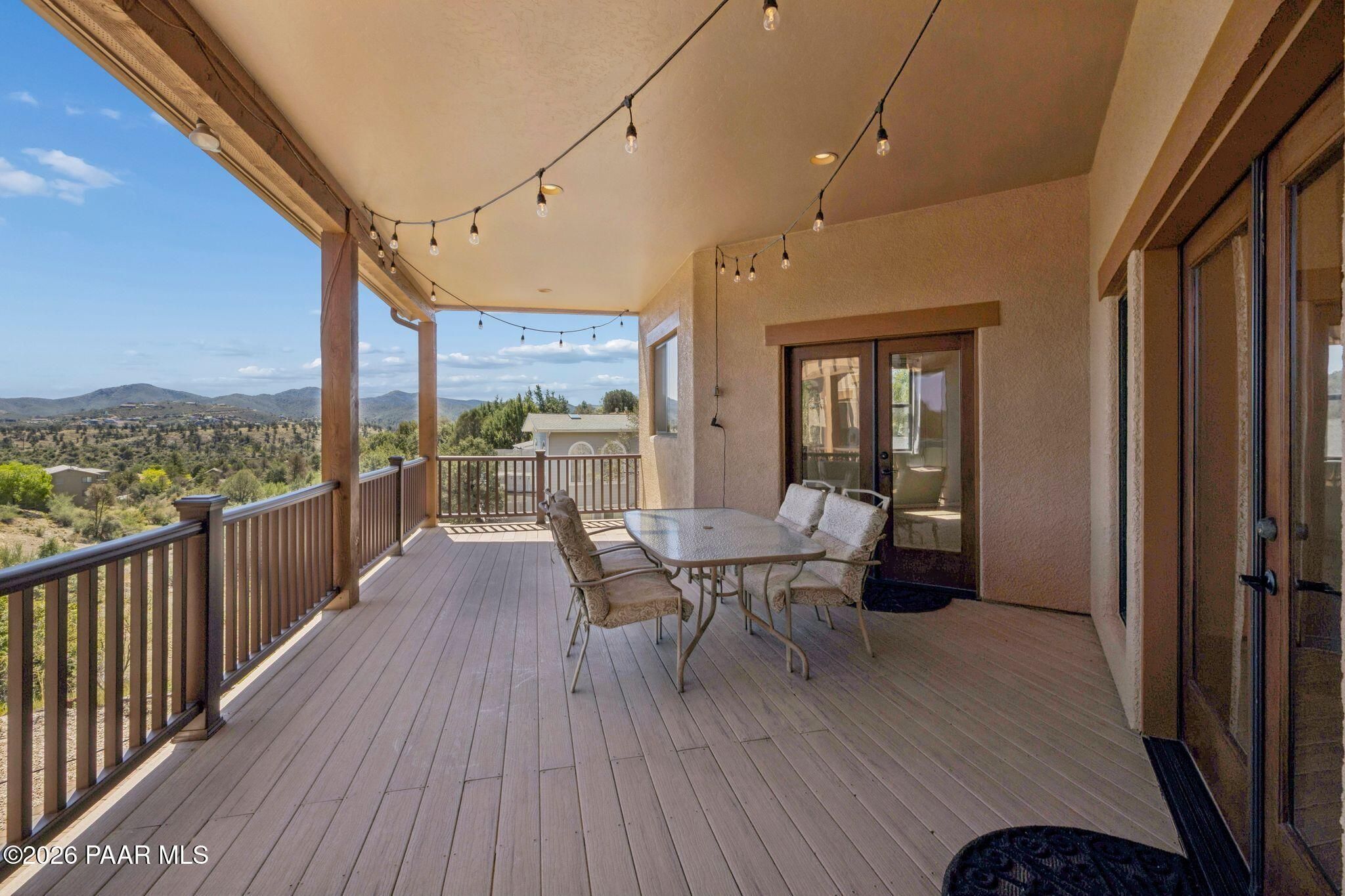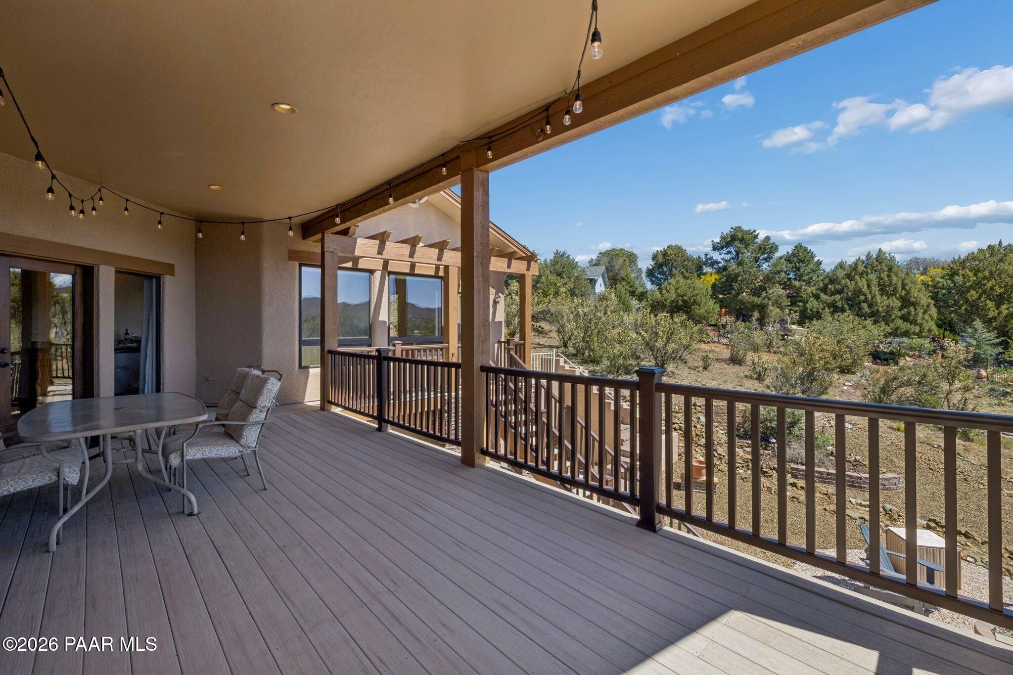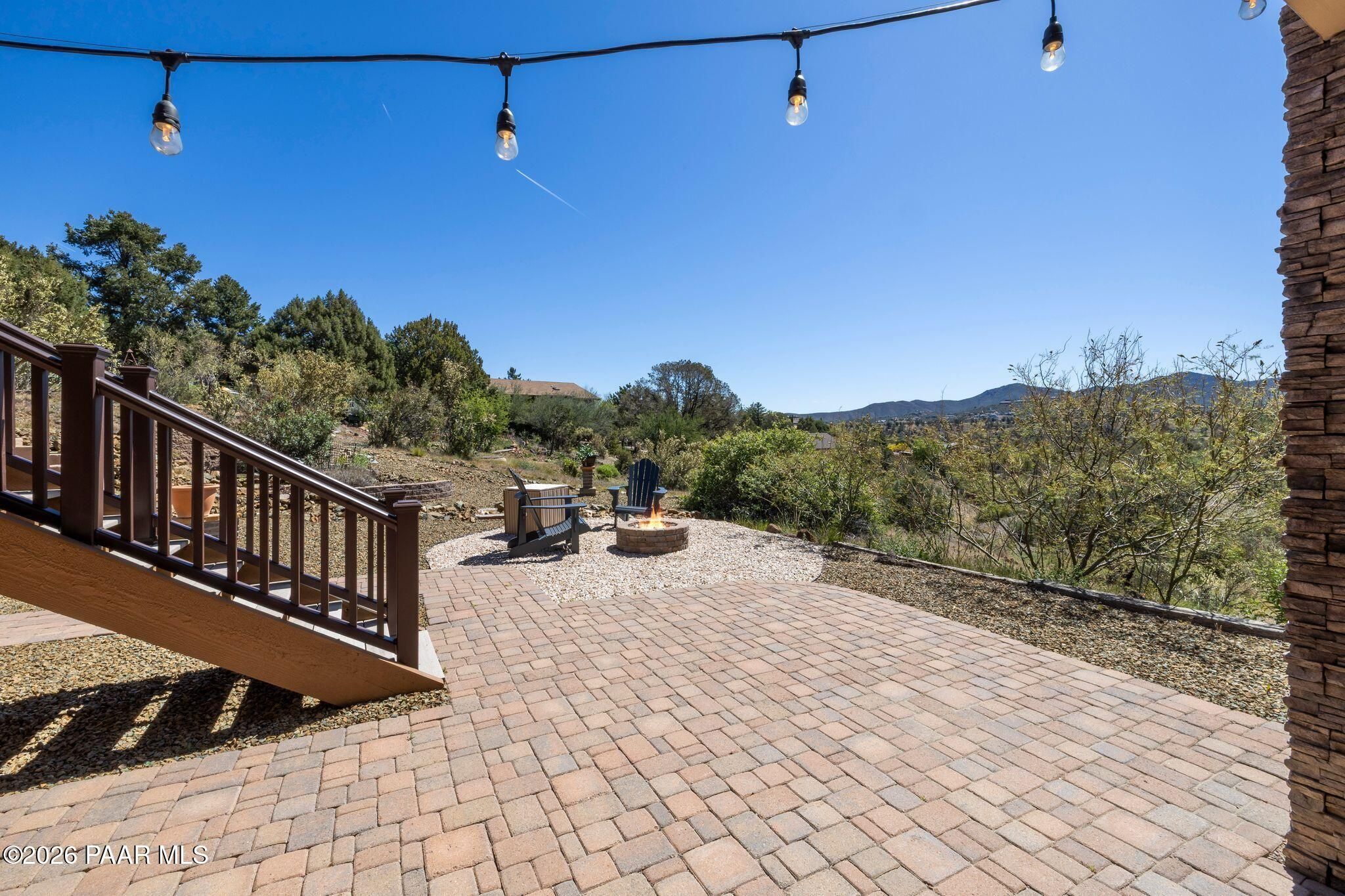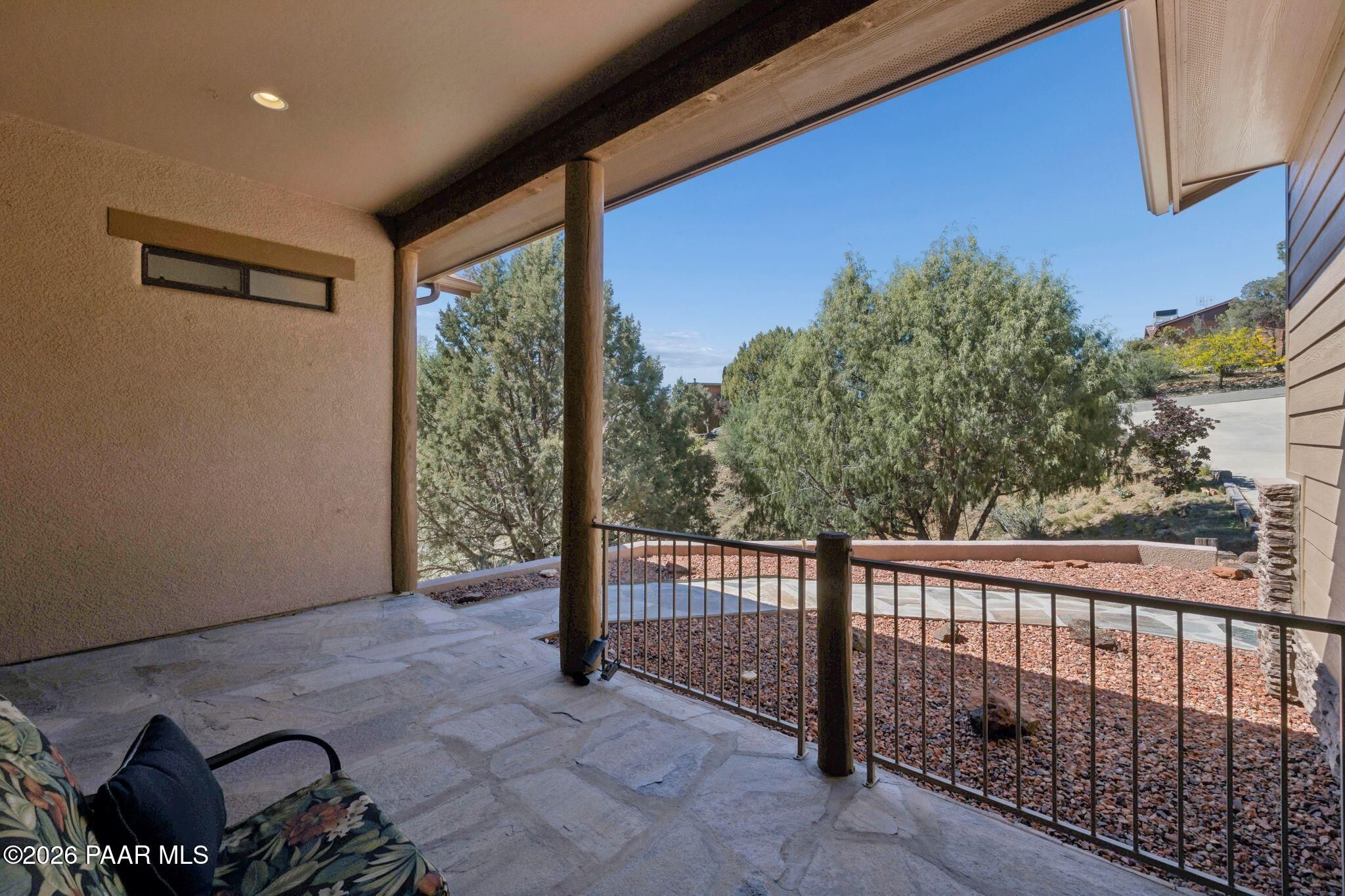 Exceptional living in the sought-after Yavapai Hills community, where comfort, versatility, and stunning mountain views come together. This beautifully maintained home offers main level living with a desirable split floor plan featuring wood floors, four bedrooms, and three baths, plus a spacious lower level ideal for multi-generational living with a guest suite, office or potential bedroom, and a media or hobby room. The kitchen is designed to impress with knotty alder cabinetry, granite countertops, a breakfast bar, walk-in pantry, and picturesque views from the sink, along with newer appliances. The private master suite is thoughtfully separated, featuring a large walk-in closet, French doors to the deck, and a spacious bath with dual vanities, granite finishes, a soaker tub and separate shower. Enjoy indoor-outdoor living with a covered Trex deck showcasing amazing views, multiple covered patios, a private guest deck, level backyard with pavers and firepit, and added privacy with common area on two sides. Additional highlights include two wet bars, abundant storage, an oversized 24' x 30' garage, fire suppression system, newer roof (2021), exterior paint (2025), water heater (2021), and mature landscaping with cherry and peach trees. This all-electric home offers the perfect blend of space, privacy, and functionality in one of Prescott's most desirable neighborhoods. Currently all electric with gas plumbed and available for easy conversion. See feature sheet for more info.