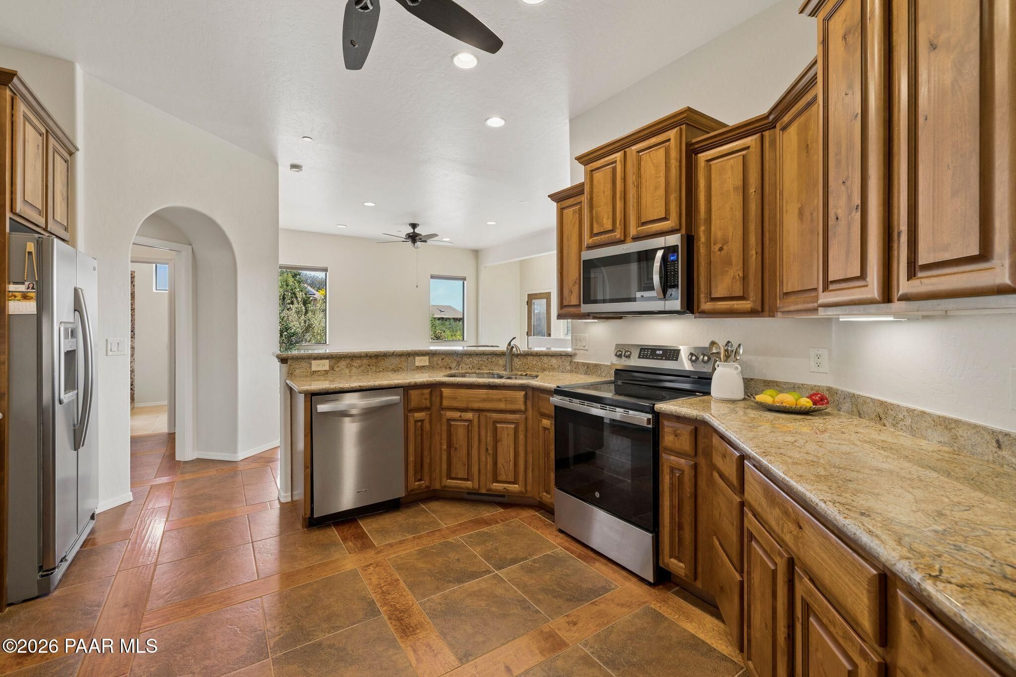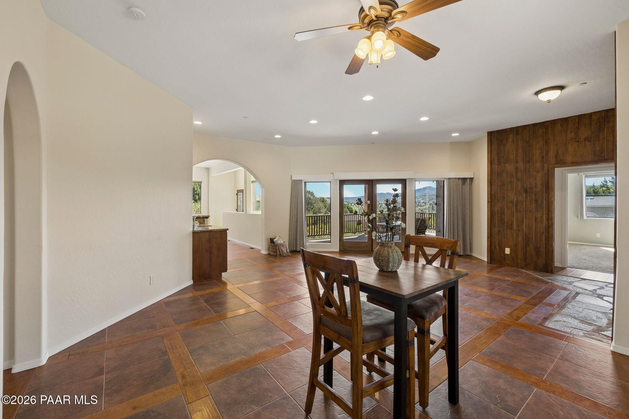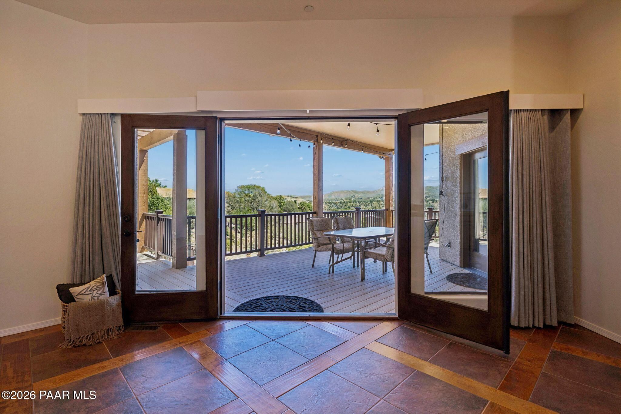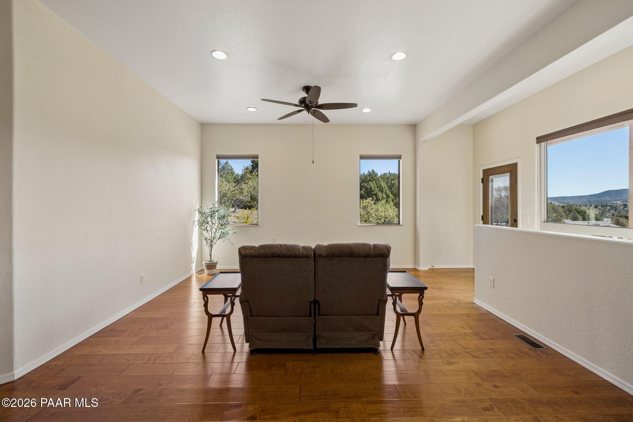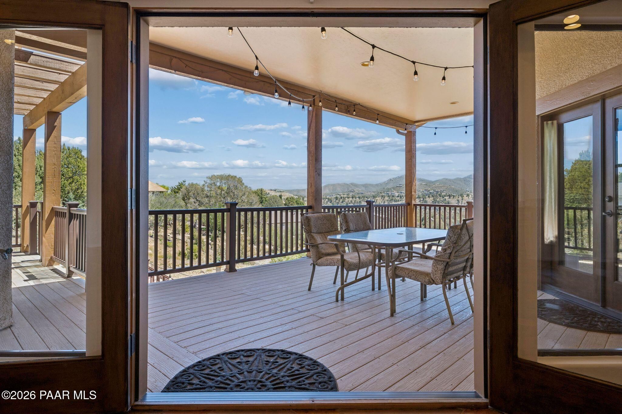 Exceptional living in the sought-after Yavapai Hills community, where comfort, versatility, and stunning mountain views come together. This beautifully maintained home offers main level living with a desirable split floor plan featuring wood floors, four bedrooms, and three baths, plus a spacious lower level ideal for multi-generational living with a guest suite, office or potential bedroom, and a media or hobby room. The kitchen is designed to impress with knotty alder cabinetry, granite countertops, a breakfast bar, walk-in pantry, and picturesque views from the sink, along with newer appliances. The private master suite is thoughtfully separated, featuring a large walk-in closet, French doors to the deck, and a spacious bath with dual vanities, granite finishes, a soaker tub and separate shower. Enjoy indoor-outdoor living with a covered Trex deck showcasing amazing views, multiple covered patios, a private guest deck, level backyard with pavers and firepit, and added privacy with common area on two sides. Additional highlights include two wet bars, abundant storage, an oversized 24' x 30' garage, fire suppression system, newer roof (2021), exterior paint (2025), water heater (2021), and mature landscaping with cherry and peach trees. This all-electric home offers the perfect blend of space, privacy, and functionality in one of Prescott's most desirable neighborhoods. Currently all electric with gas plumbed and available for easy conversion. See feature sheet for more info.