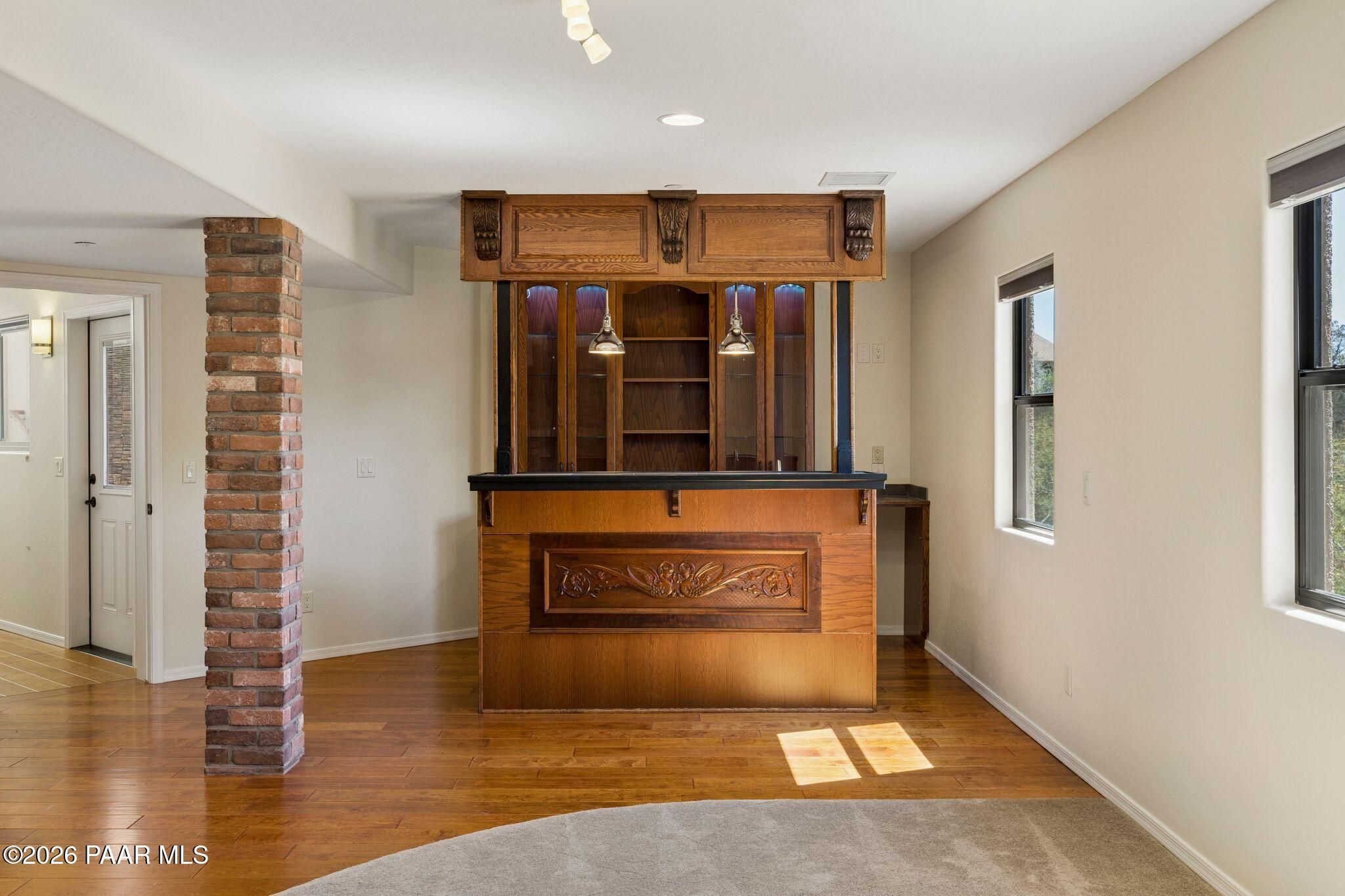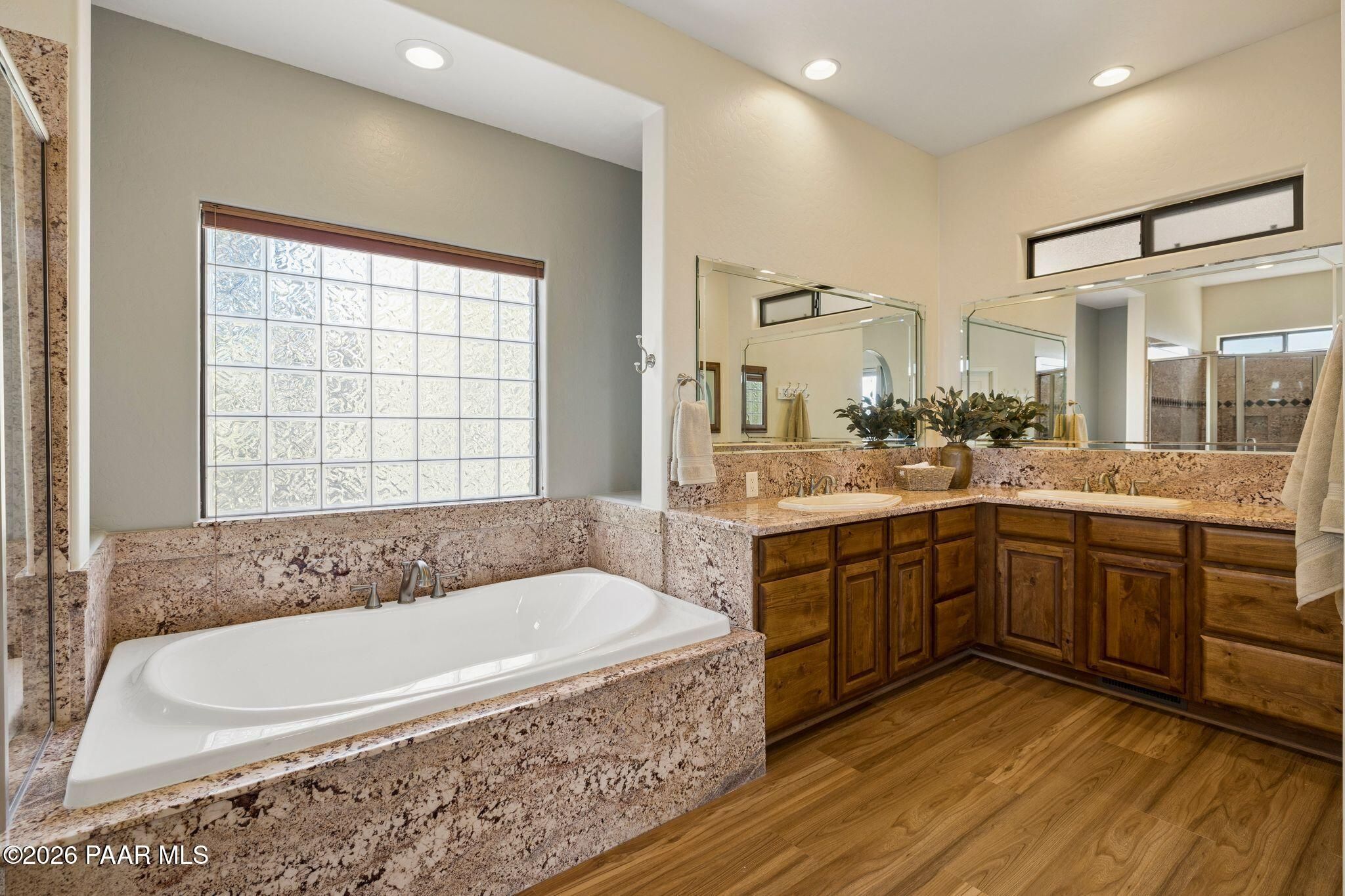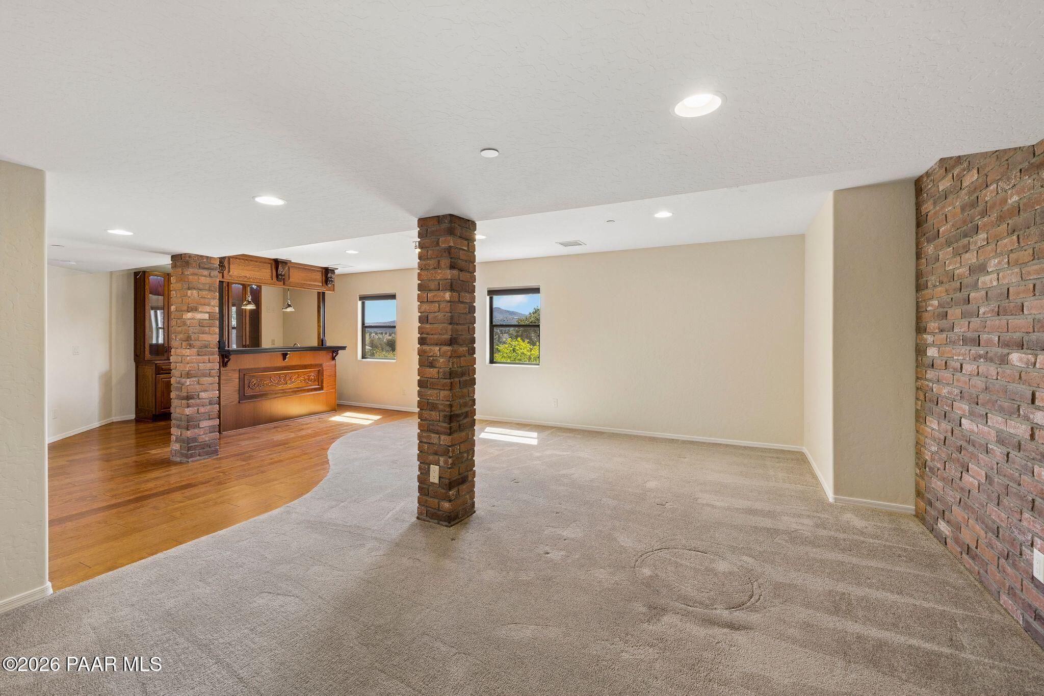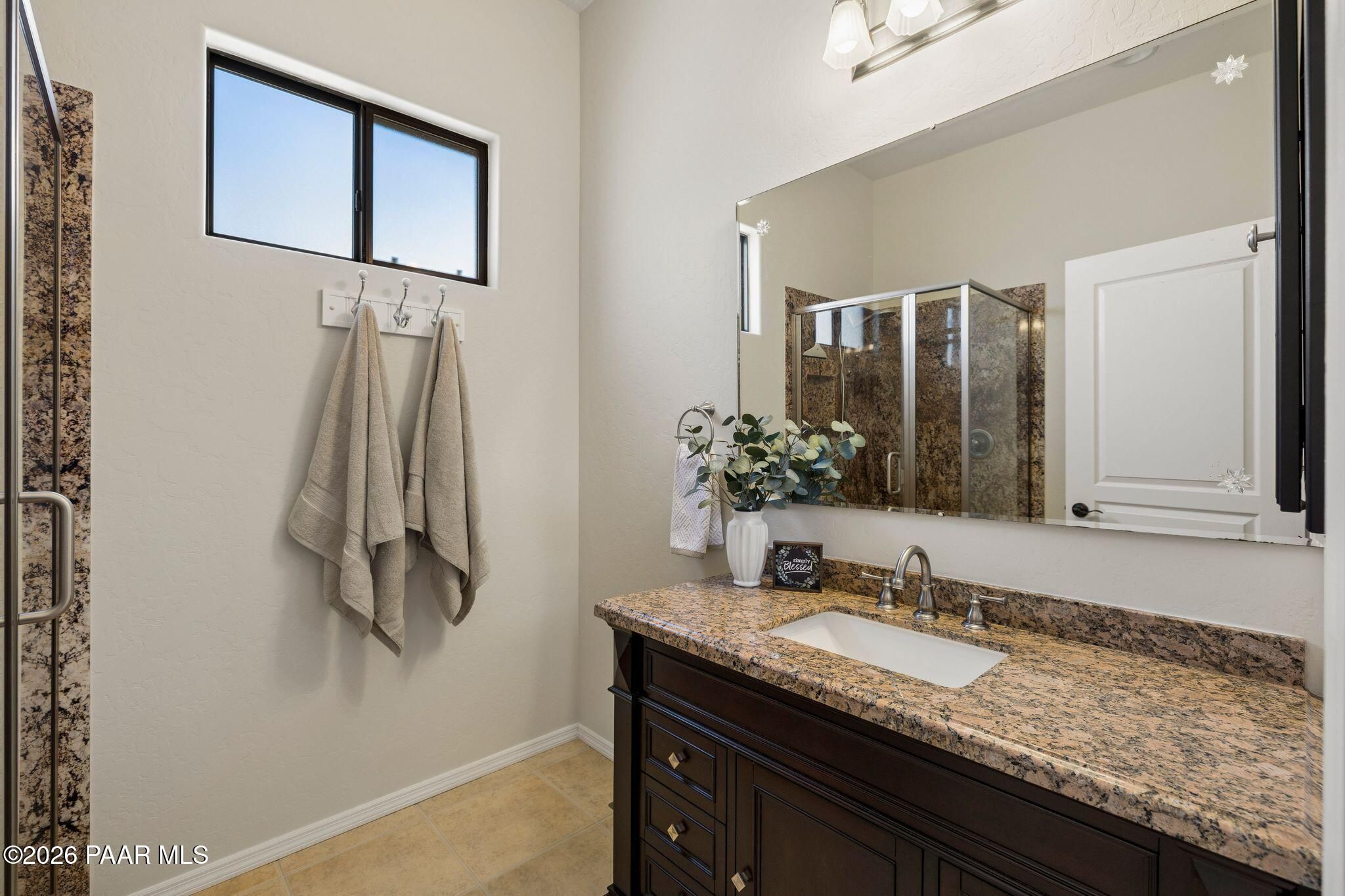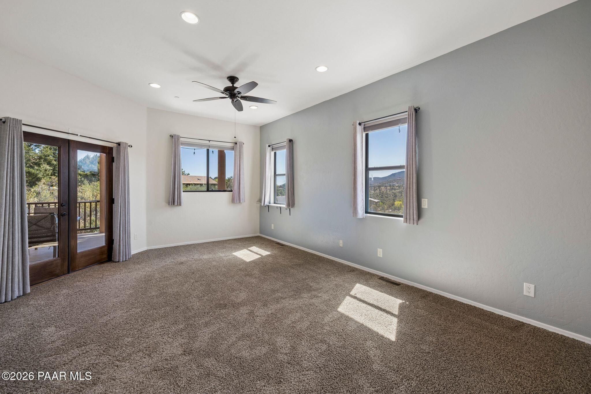 Exceptional living in the sought-after Yavapai Hills community, where comfort, versatility, and stunning mountain views come together. This beautifully maintained home offers main level living with a desirable split floor plan featuring wood floors, four bedrooms, and three baths, plus a spacious lower level ideal for multi-generational living with a guest suite, office or potential bedroom, and a media or hobby room. The kitchen is designed to impress with knotty alder cabinetry, granite countertops, a breakfast bar, walk-in pantry, and picturesque views from the sink, along with newer appliances. The private master suite is thoughtfully separated, featuring a large walk-in closet, French doors to the deck, and a spacious bath with dual vanities, granite finishes, a soaker tub and separate shower. Enjoy indoor-outdoor living with a covered Trex deck showcasing amazing views, multiple covered patios, a private guest deck, level backyard with pavers and firepit, and added privacy with common area on two sides. Additional highlights include two wet bars, abundant storage, an oversized 24' x 30' garage, fire suppression system, newer roof (2021), exterior paint (2025), water heater (2021), and mature landscaping with cherry and peach trees. This all-electric home offers the perfect blend of space, privacy, and functionality in one of Prescott's most desirable neighborhoods. Currently all electric with gas plumbed and available for easy conversion. See feature sheet for more info.