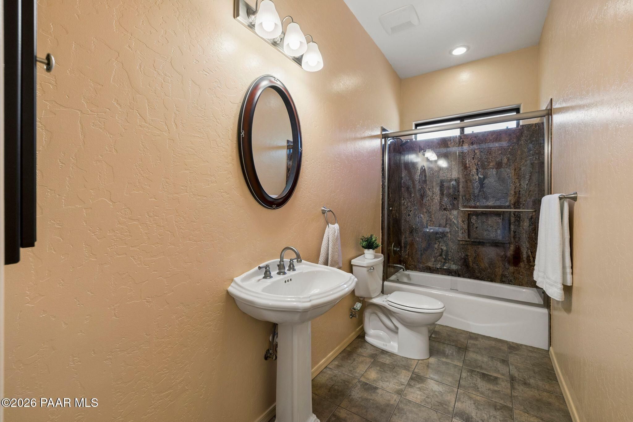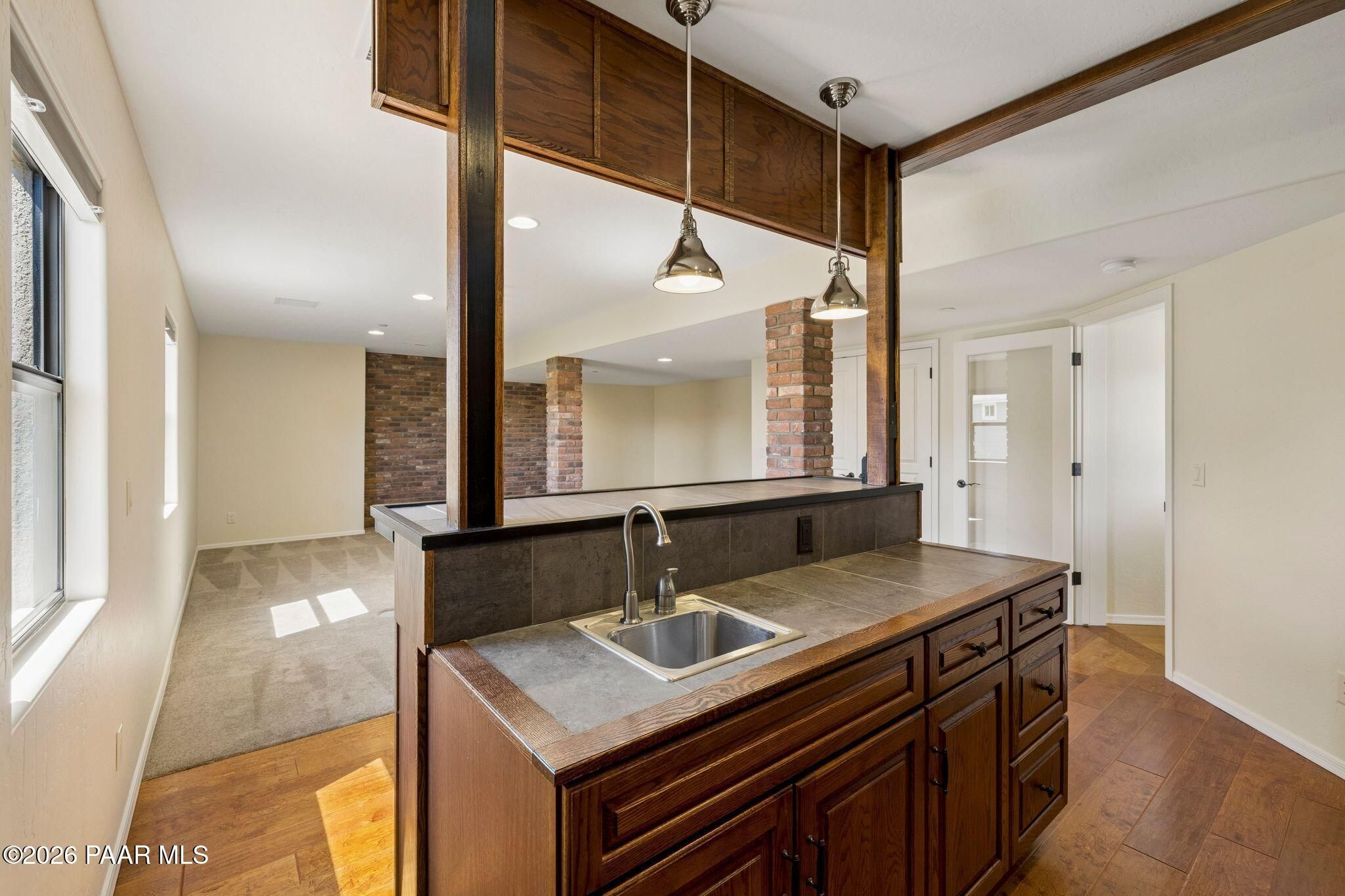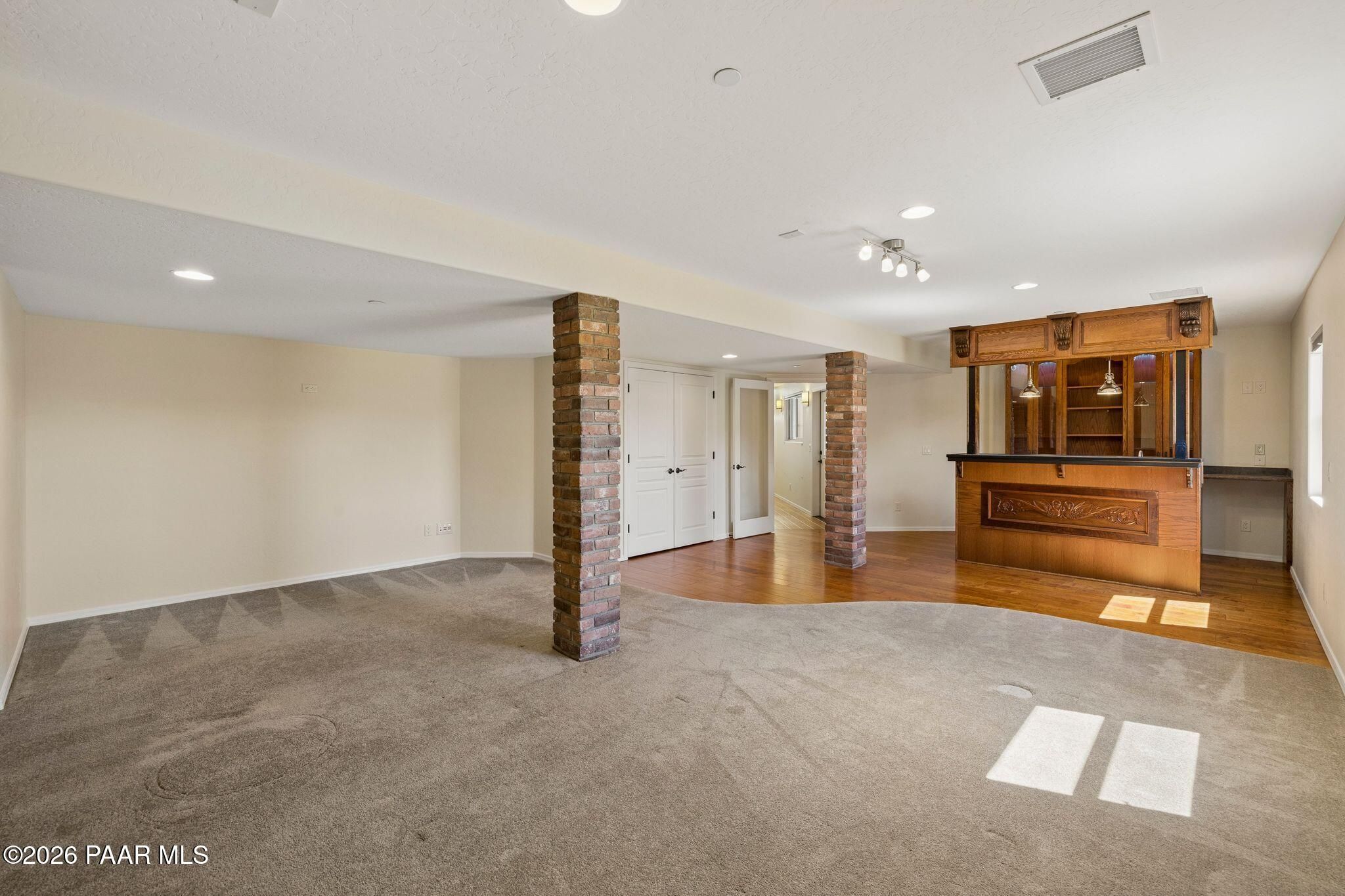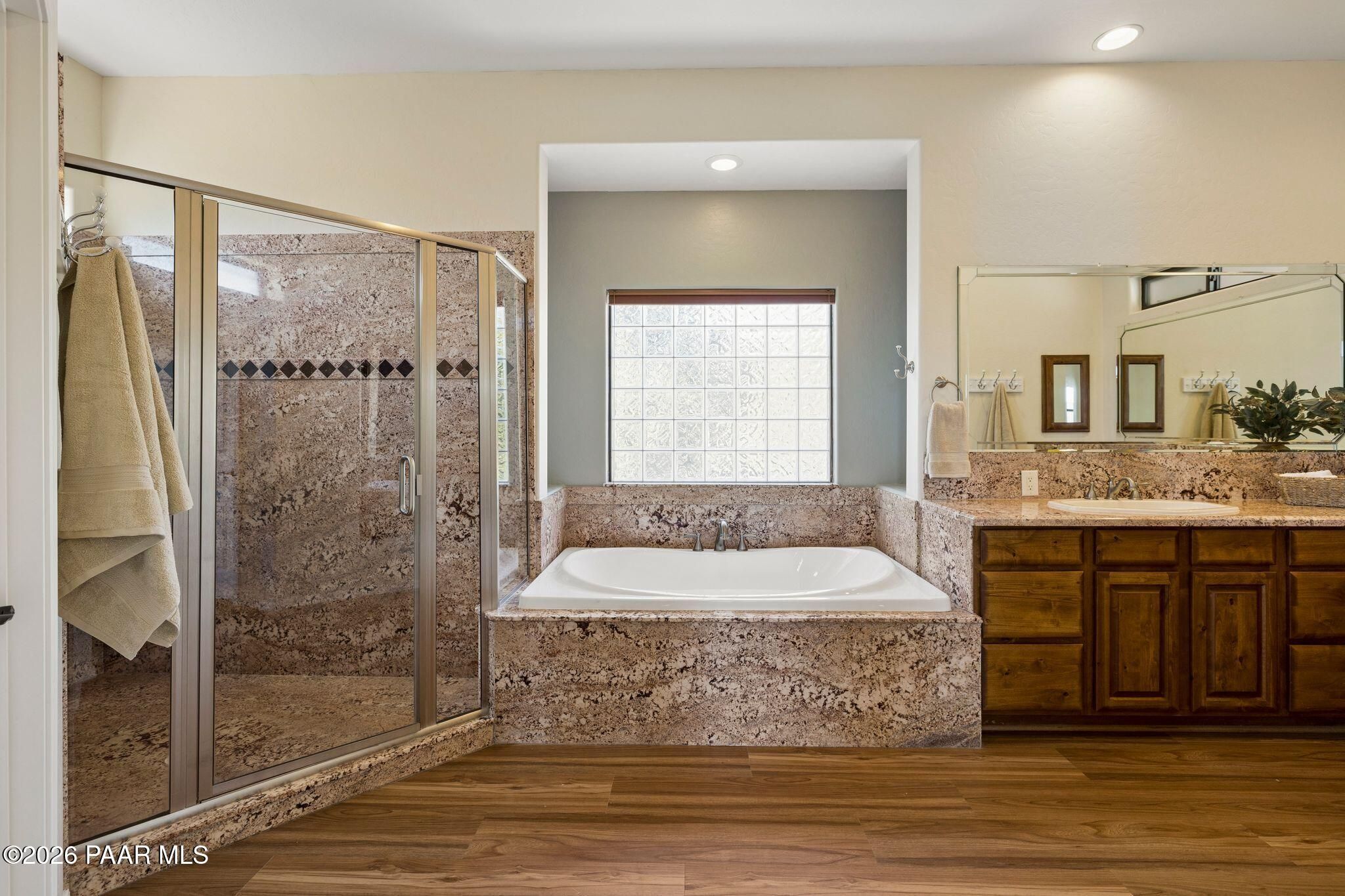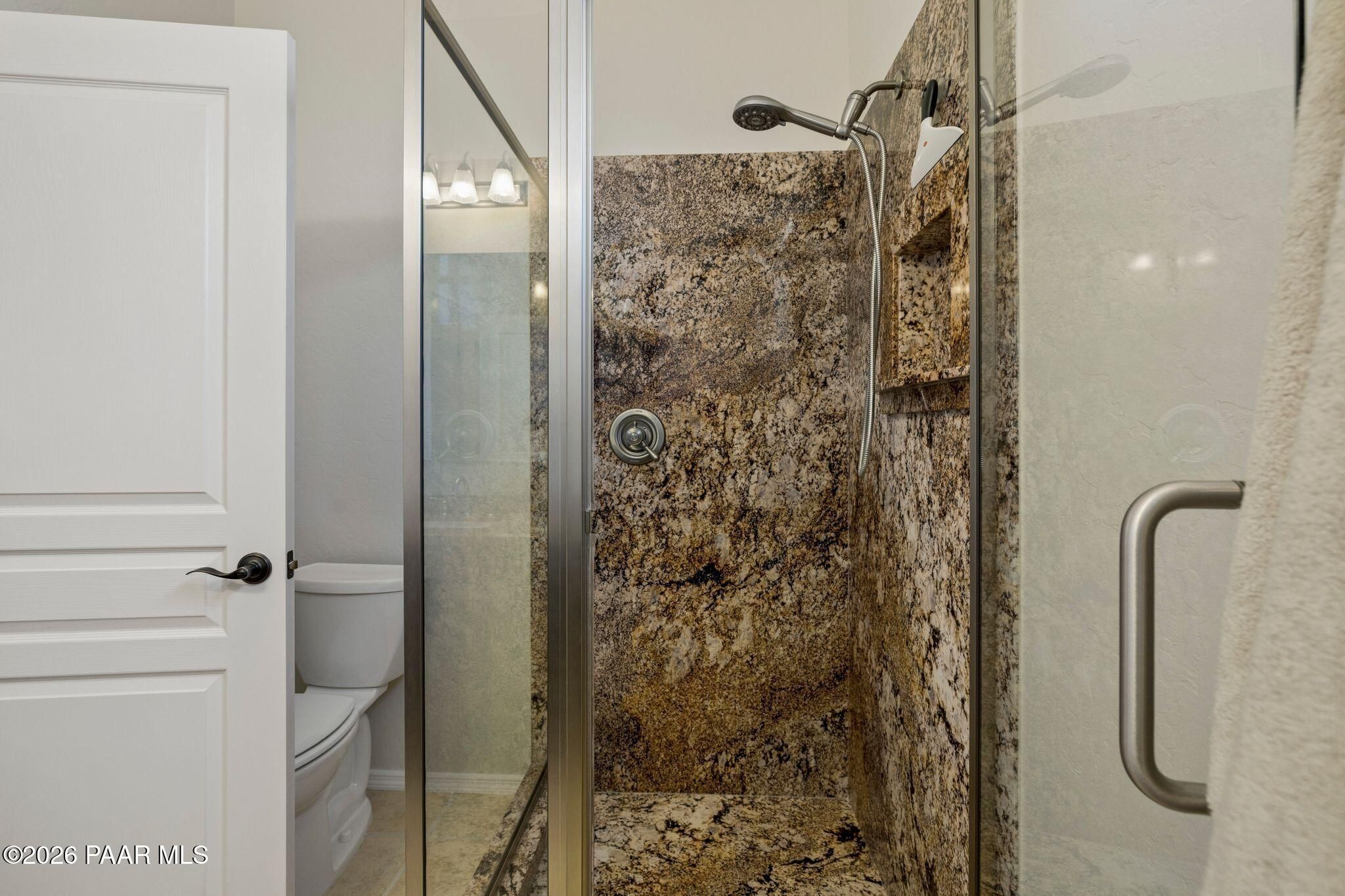 Exceptional living in the sought-after Yavapai Hills community, where comfort, versatility, and stunning mountain views come together. This beautifully maintained home offers main level living with a desirable split floor plan featuring wood floors, four bedrooms, and three baths, plus a spacious lower level ideal for multi-generational living with a guest suite, office or potential bedroom, and a media or hobby room. The kitchen is designed to impress with knotty alder cabinetry, granite countertops, a breakfast bar, walk-in pantry, and picturesque views from the sink, along with newer appliances. The private master suite is thoughtfully separated, featuring a large walk-in closet, French doors to the deck, and a spacious bath with dual vanities, granite finishes, a soaker tub and separate shower. Enjoy indoor-outdoor living with a covered Trex deck showcasing amazing views, multiple covered patios, a private guest deck, level backyard with pavers and firepit, and added privacy with common area on two sides. Additional highlights include two wet bars, abundant storage, an oversized 24' x 30' garage, fire suppression system, newer roof (2021), exterior paint (2025), water heater (2021), and mature landscaping with cherry and peach trees. This all-electric home offers the perfect blend of space, privacy, and functionality in one of Prescott's most desirable neighborhoods. Currently all electric with gas plumbed and available for easy conversion. See feature sheet for more info.