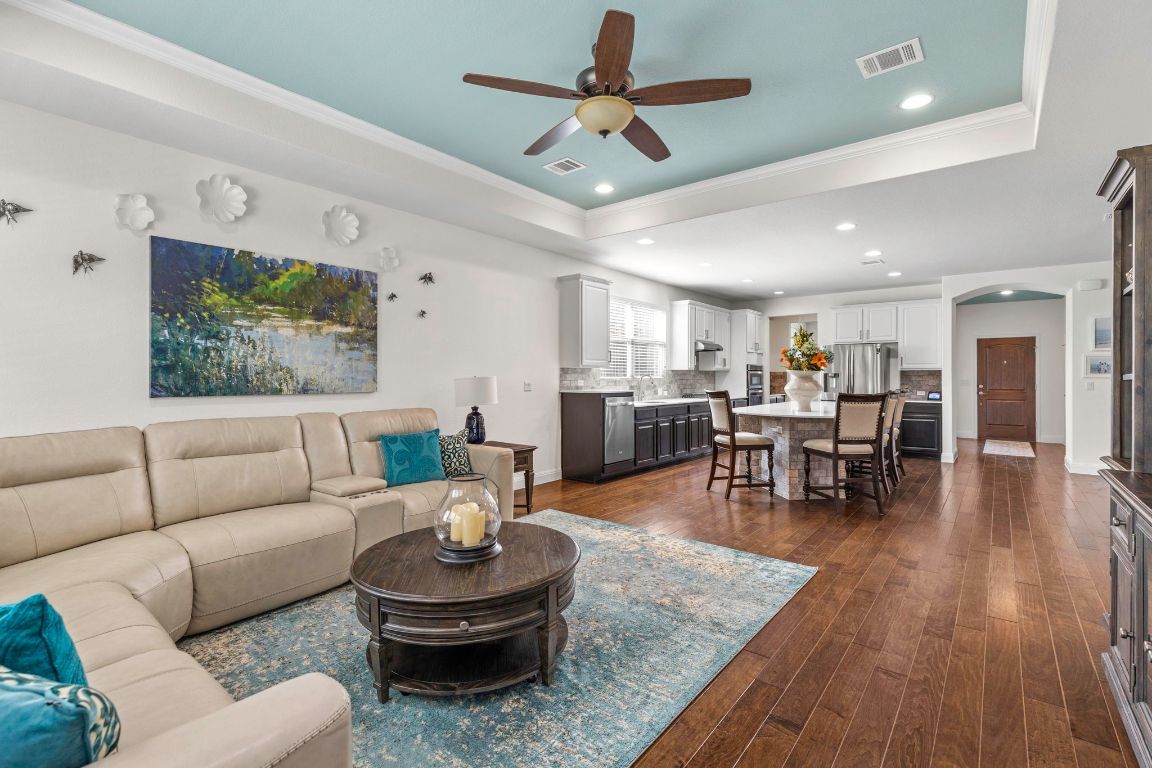 Come and live the good life in Sun City Texas—an acclaimed 55+ community in scenic Georgetown, Texas. This impeccably maintained single-story home is nestled among mature landscaping and features masonry on all four sides, expansive front and back patios, and a charming covered porch. Ideally located just a short walk or golf cart ride to the golf course and community amenities. Inside, you'll find a light-filled open floor plan with two bedrooms, two full baths, and a versatile flex space—ideal for a formal dining room, home office, or quiet retreat. Rich hardwood floors, recessed lighting, and elegant tray ceilings with crown molding elevate the atmosphere. The showpiece gourmet kitchen boasts a large curved island with seating, quartz countertops, stainless steel appliances, a walk-in pantry, and a butler’s pantry area with a café counter and showcase glass cabinetry. The serene primary suite features a spacious ensuite and walk-in closet. Step outside to a tranquil, fenced backyard with a covered patio and extended hardscaping—perfect for relaxing or entertaining. Sun City offers an unmatched lifestyle with 3 golf courses, 4 fitness centers, 8 pools, 26 miles of trails, and courts for tennis, pickleball, and bocce. Additional amenities include craft studios, woodshop, computer lab, gardens, fishing ponds, along with a vast array of social clubs and activities. Just minutes to Lake Georgetown, historic downtown, and 37 miles to Austin. Don’t miss out on a home of this caliber at such a fantastic price point – schedule your showing today!