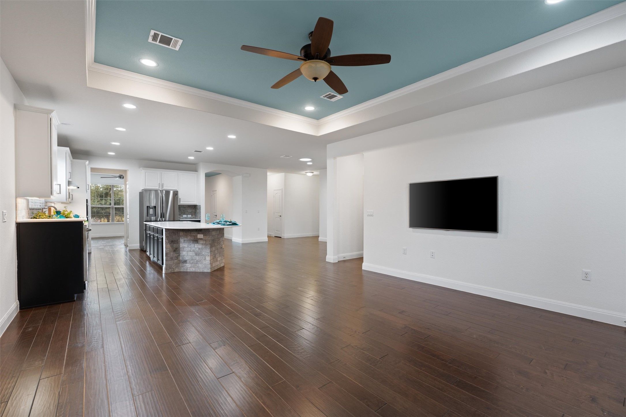 - Breakfast Bar, Tray Ceiling(s), Ceiling Fan(s), Double Vanity, Entrance Foyer, High Ceilings, Kitchen Island, Main Level Primary, Open Floorplan, Pantry, Quartz Countertops, Recessed Lighting, Storage, Study, Walk-In Closet(s)