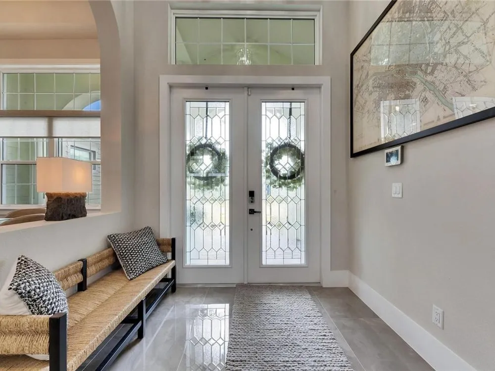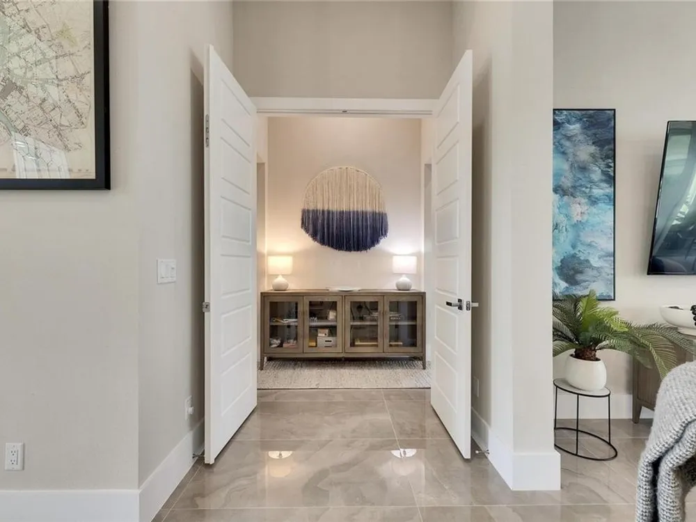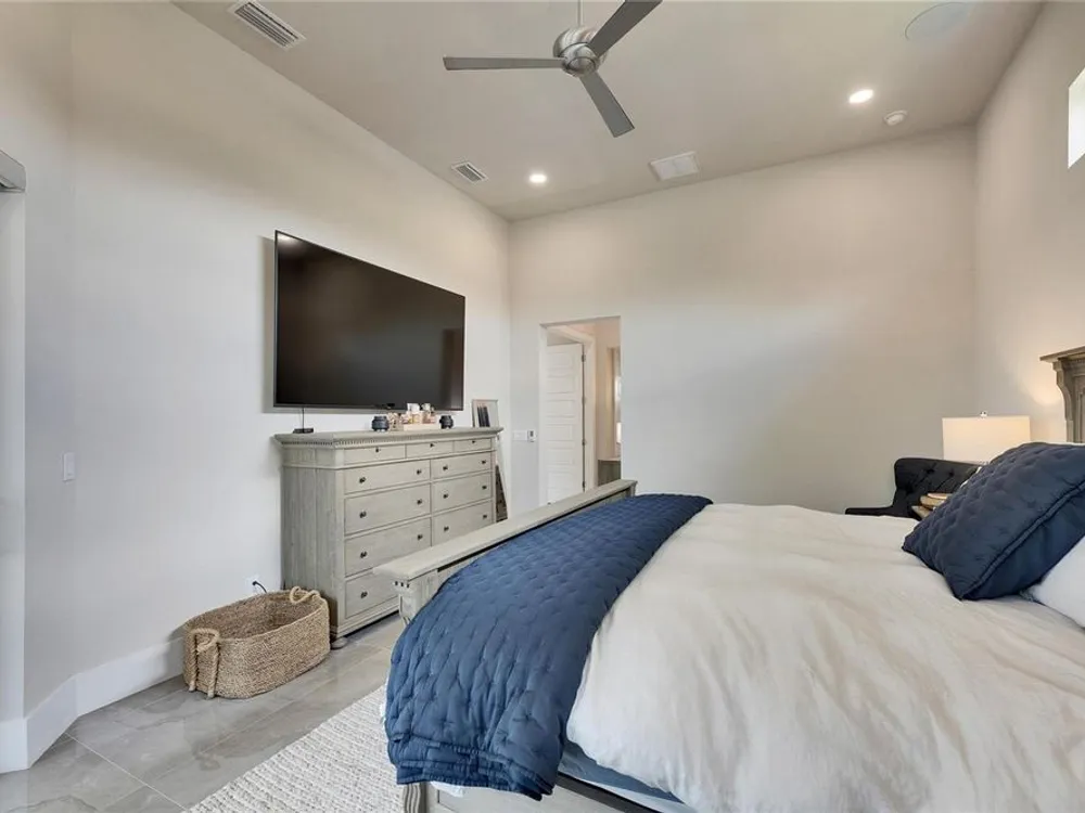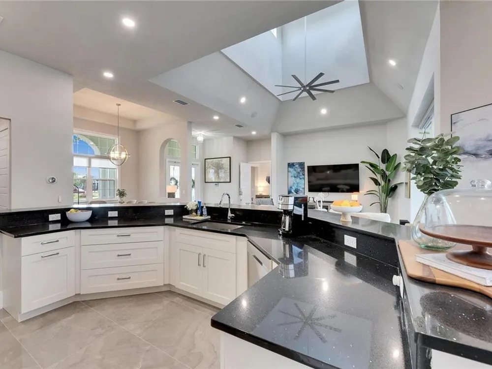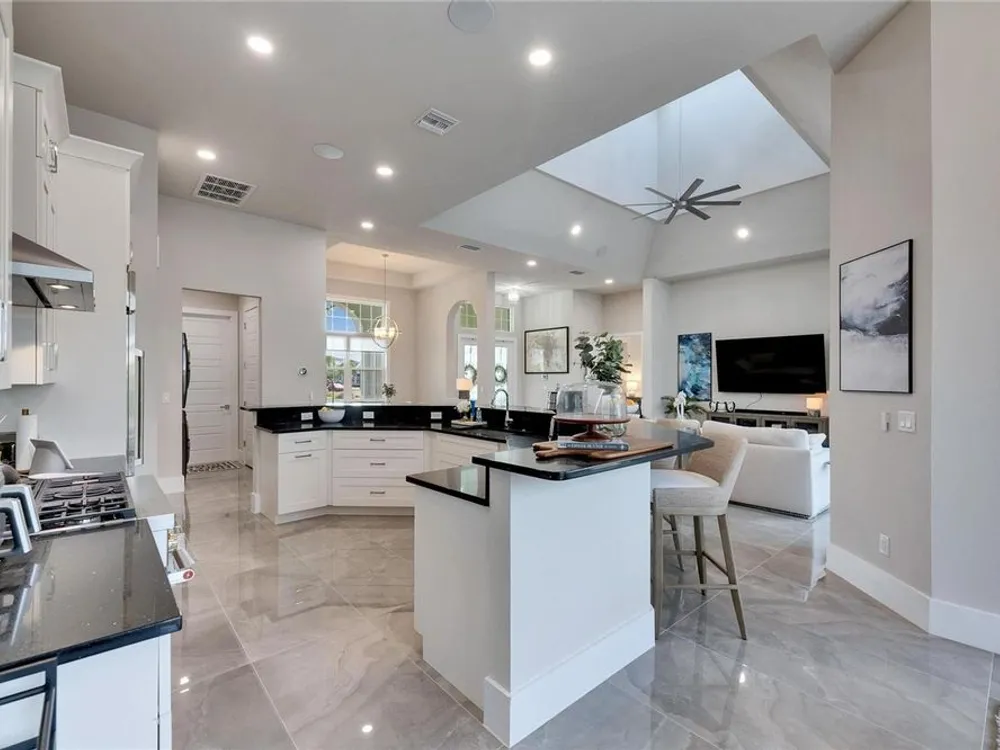 - Cathedral Ceiling(s), Ceiling Fan(s), Coffered Ceiling(s), Crown Molding, High Ceilings, Kitchen/Family Room Combo, L-Shaped Dining Room, Living/Dining Room, Open Floorplan, Main Level Primary, Solid-Wood Cabinets, Split Bedrooms, Stone Counters, Thermostat, Tray Ceiling(s), Walk-In Closet(s), Window Treatments