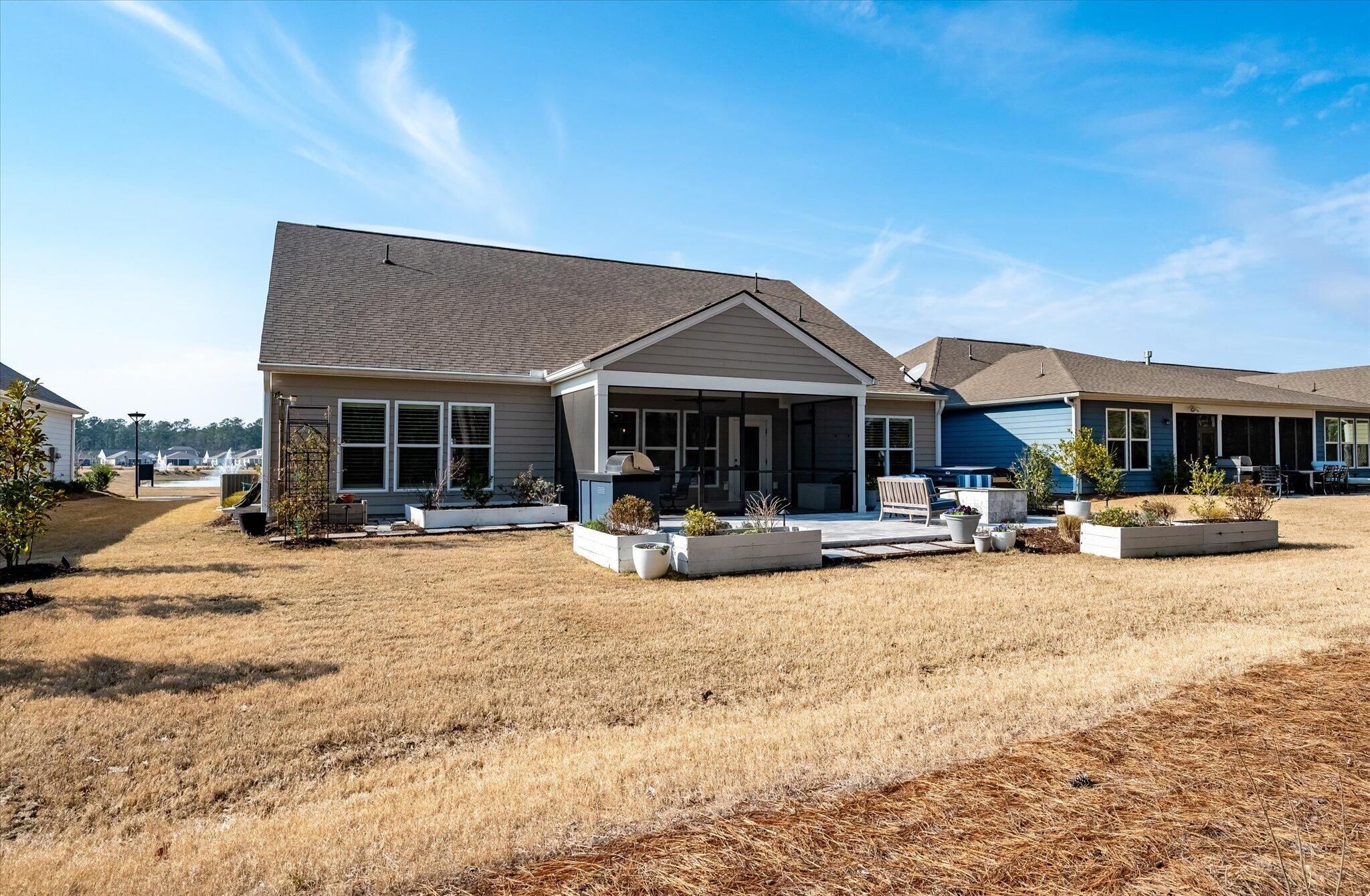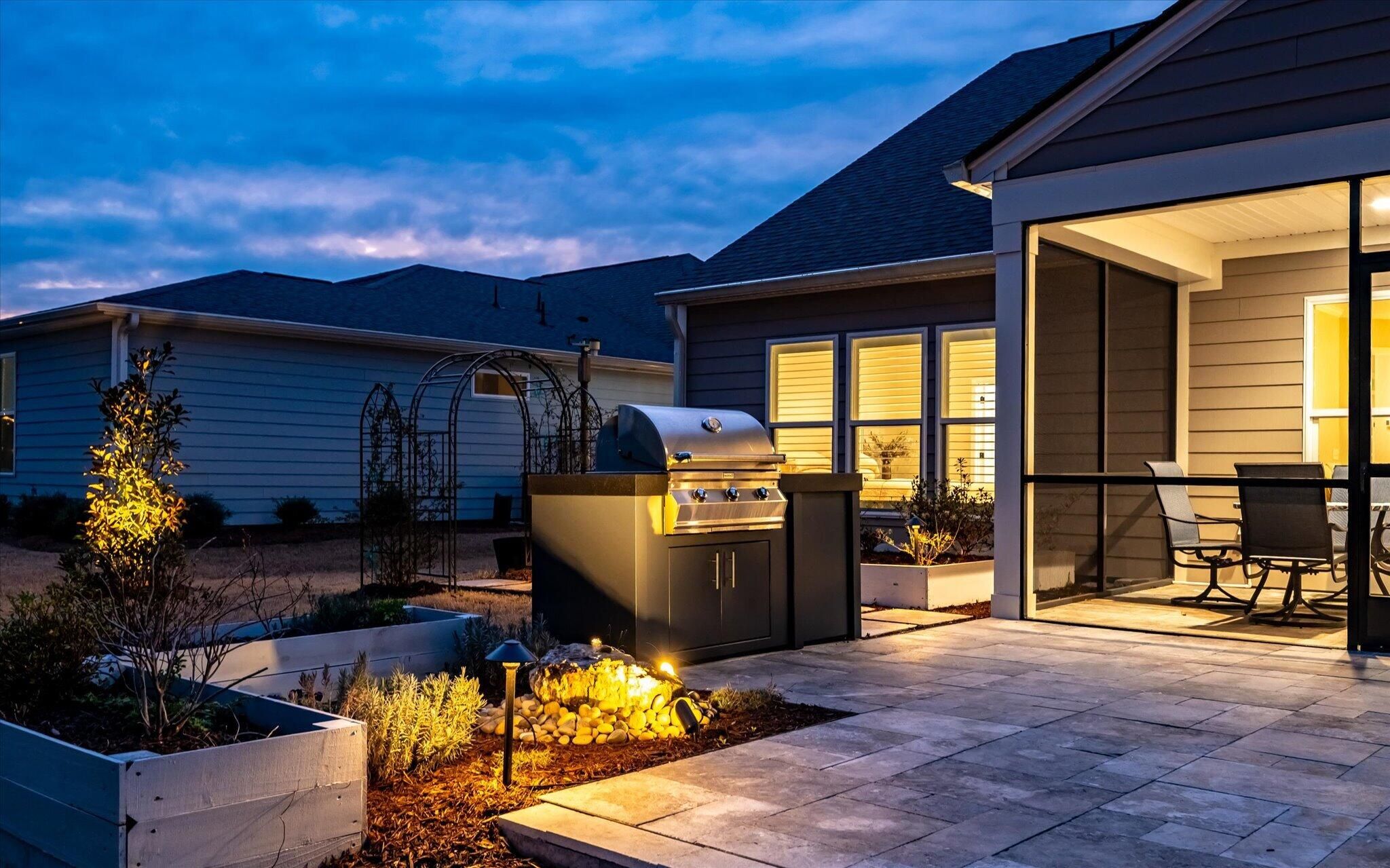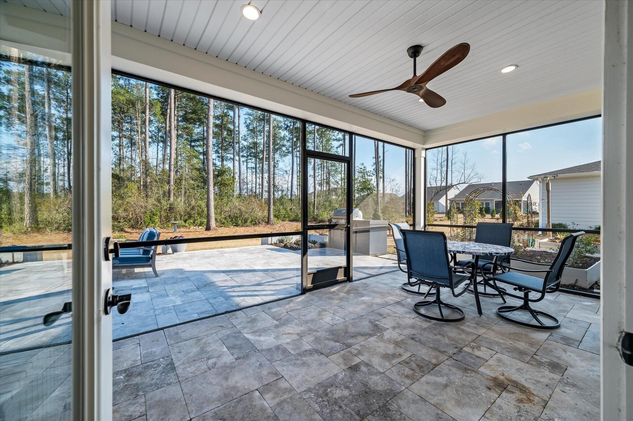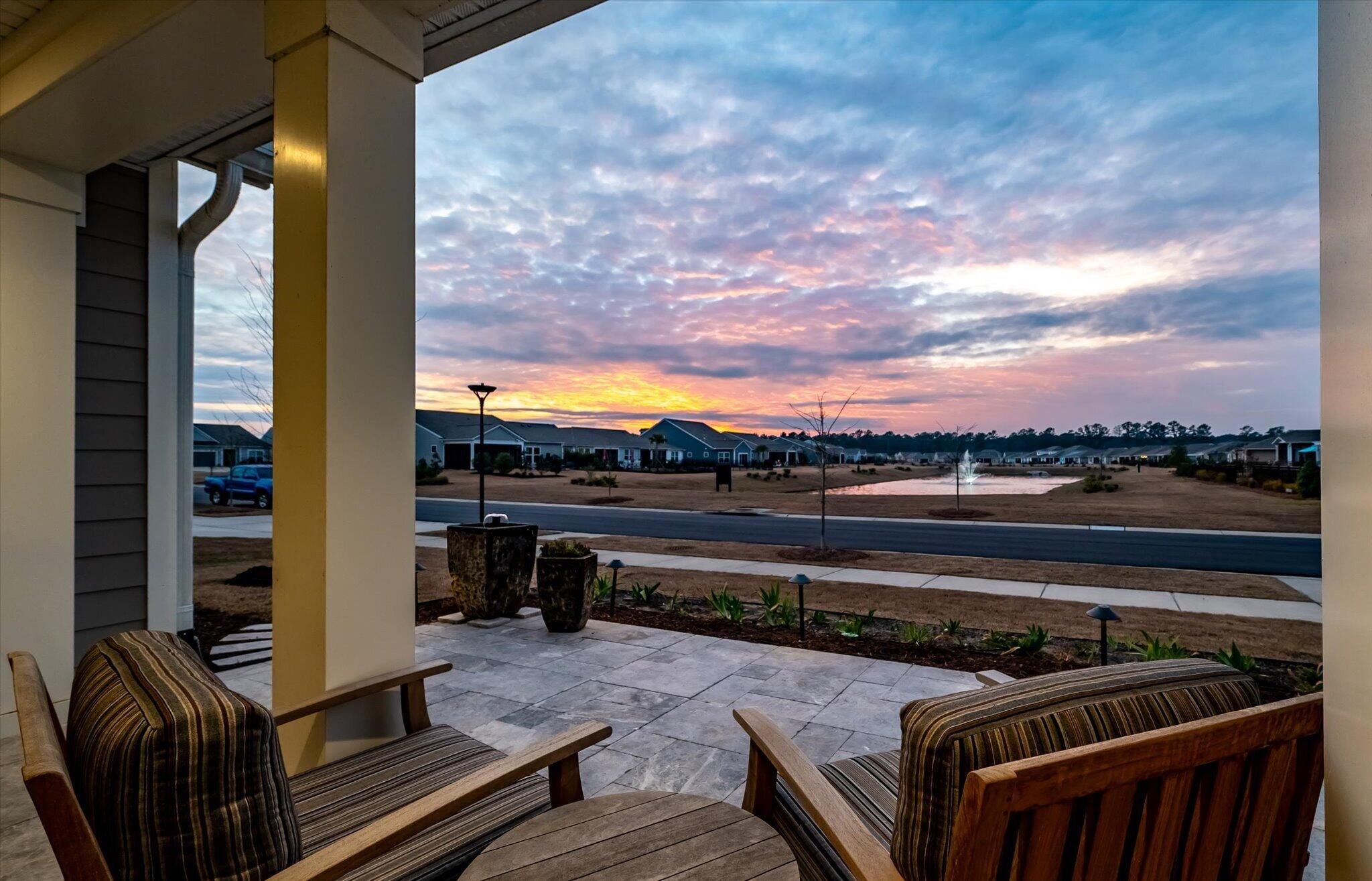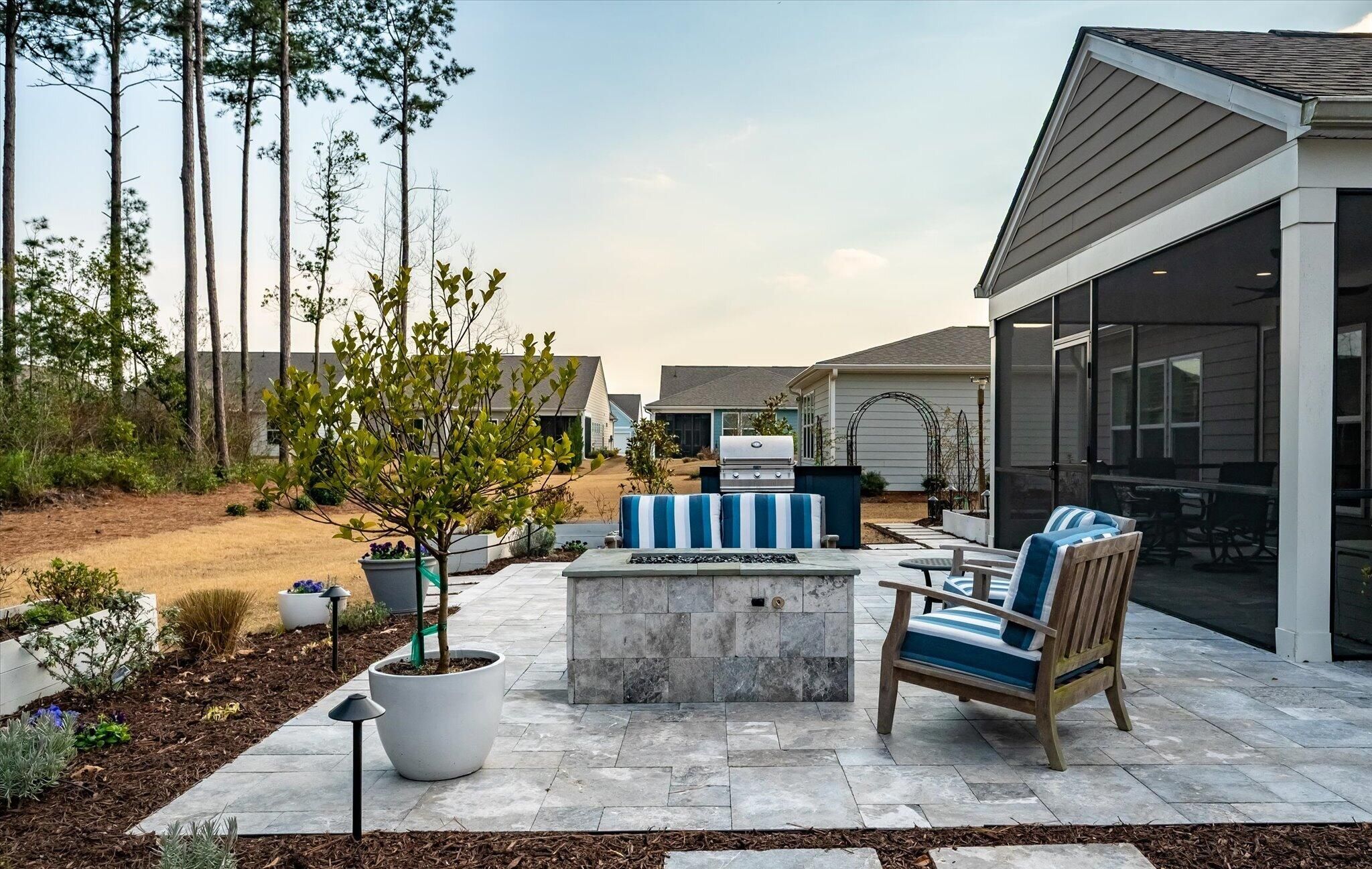 Ready for a lifestyle reboot? Welcome to resort-style living in the highly sought-after Del Webb Nexton active adult community. This desirable one-story Sonoma Cove model is a rare find with this floorplan no longer being offered in the new phases. This beautifully maintained 3 bedroom, 3 bath home offers the perfect blend of comfort, flexibility and low-maintenance living. Step inside to discover the open-concept layout is bathed in natural light and LV wood planks extending throughout the home, which is ideal for both everyday living and entertaining. Located off the foyer, through a set of French doors, is a flex room currently used as a home office/study and to the left is the dining room that flows right into the heart of the home. The spacious gourmet kitchen features generousquartz counter space, cabinets with soft close doors, pull-out shelves, designer copper backsplash, modern kitchen appliances, under cabinet LED lighting, abundant cabinetry, an island and breakfast bar seating overlooking the dining and spacious living areas. Right off the kitchen you'll find the large walk-in pantry and drop zone off the garage. The spacious master bedroom features a tray ceiling, crown molding, plantation shutters, and a private ensuite bathroom with ceramic tile flooring, a dual quartz vanity, and a zero-entry walk-in tile shower with built-in bench and glass enclosure. The walk-in closet has direct access to the laundry room featuring granite countertop with sink, upper cabinets, and storage closet, plus the GE Smart washer & dryer. A secondary guest suite with private bath provides ideal accommodations for visitors, while the third bedroom with attached full bath offers flexibility as a media room, in home gym, or additional guest space that is down their own hallway, providing ample privacy for guests. Off the family room you will access the screened-in lanai and see all the exterior features the owners have added to make this home one of a kind. The front and backyard landscaping and hardscaping have been architecturally designed to include marble pavers, built-in gas fire pit, gas grill with custom cabinet, custom fountains, path lights, uplighting on all trees and has the added bonus of a new Cal Spa Saltwater Hot Tub. Additional highlights include interior paint throughout the home, crown molding in the common areas, new Bosch Refrigerator/Freezer, whole house gutters with gutter guards, raised bed planters, recently upgraded landscape drip system, 2+ car garage with utility sink and pull down attic stairs to access the large lighted storage area. All this on a prime wooded lot and also perfectly positioned to overlook a serene pond from your front porch. Beyond your doorstep, Del Webb Nexton offers resort-caliber amenities including a designer clubhouse, state-of-the-art fitness center, resort-style pool, pickleball courts, and curated social experiences tailored to an active adult lifestyle and coming soon, its own bar and grill restaurant. Del Webb is located minutes from grocery stores, shops, Charleston's best restaurants, and historic downtown Summerville. Skip the wait for new construction and move directly into luxury, convenience, and community. Come see your new home TODAY!