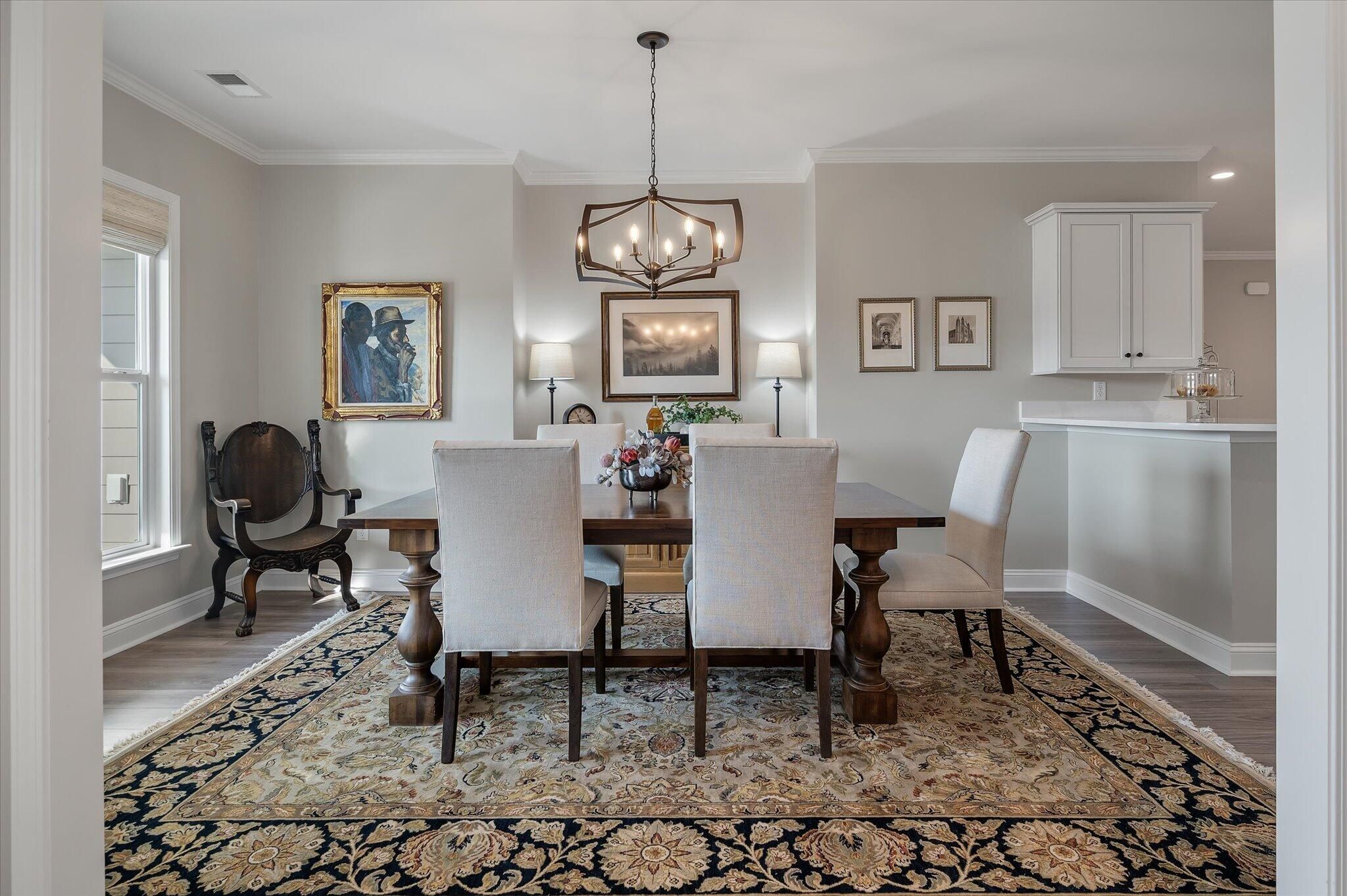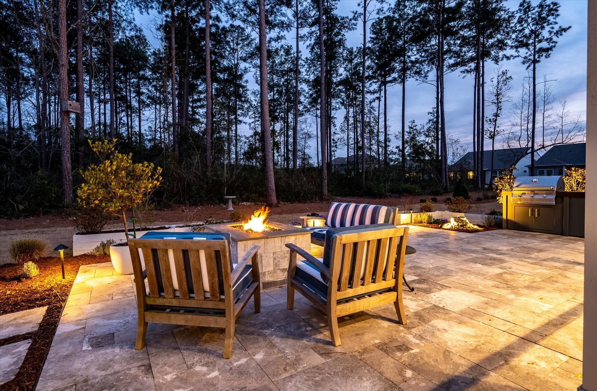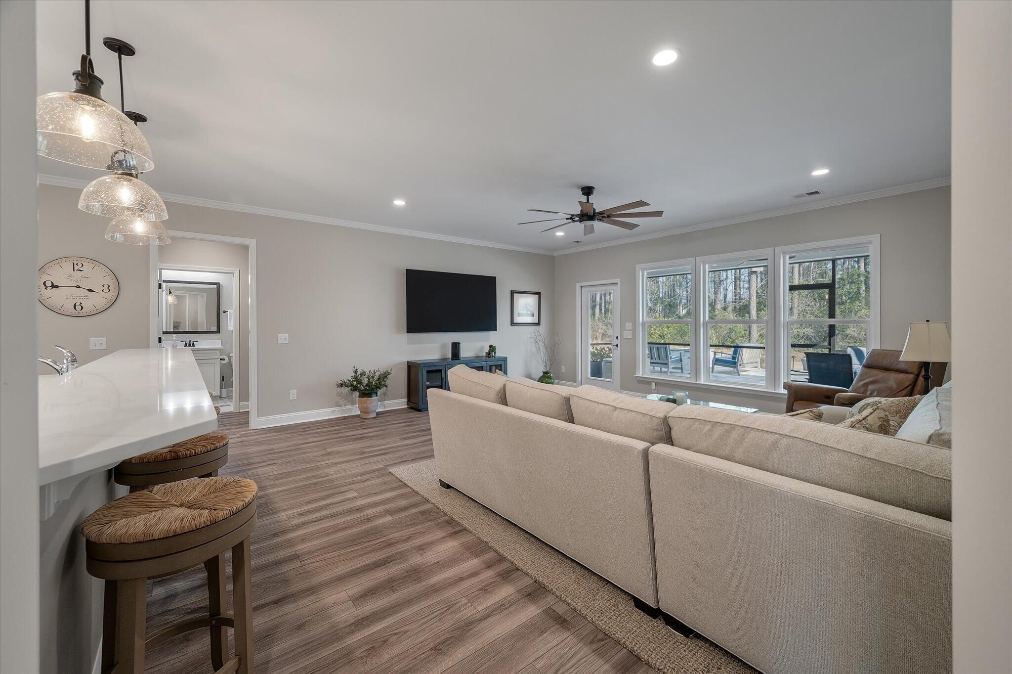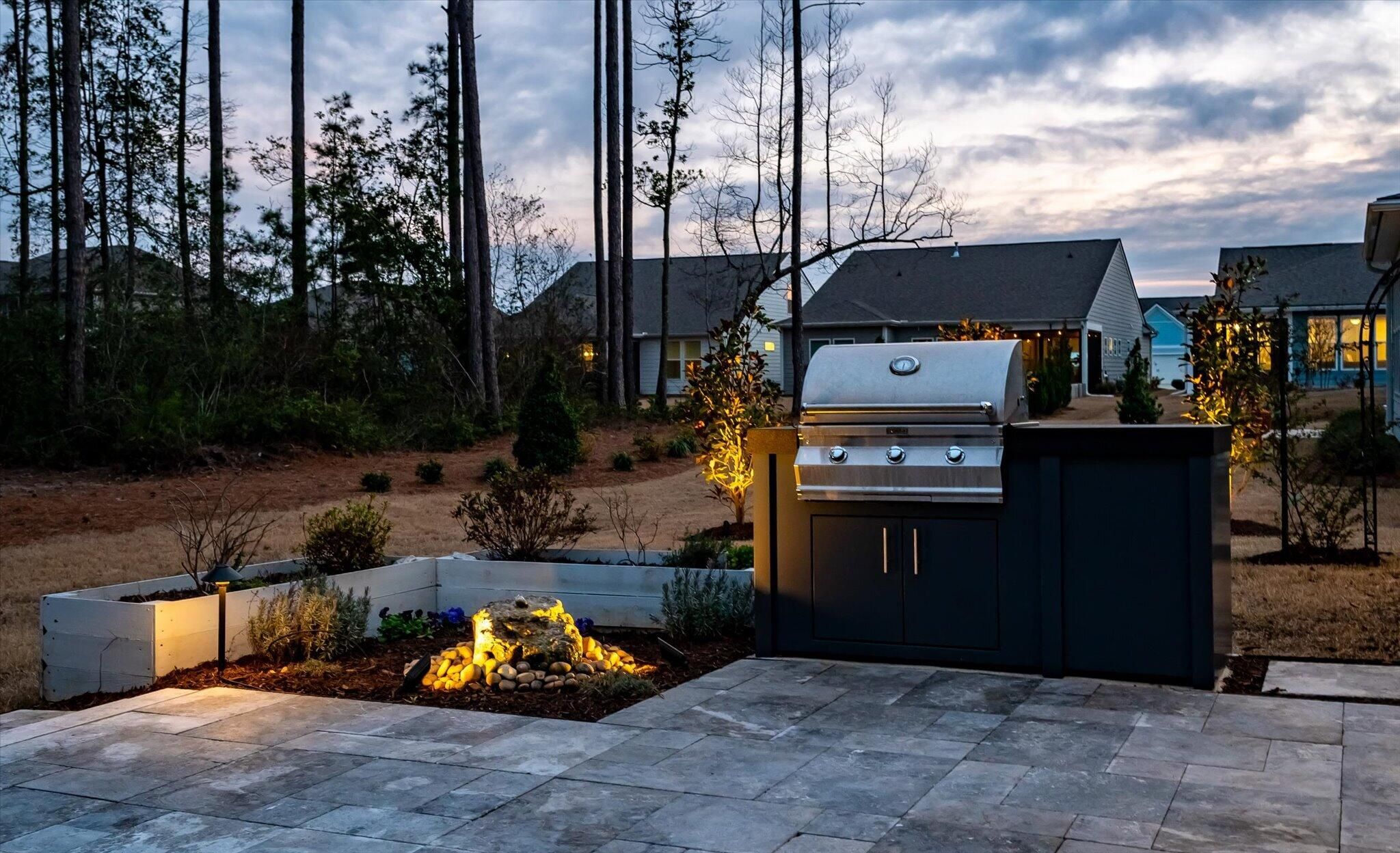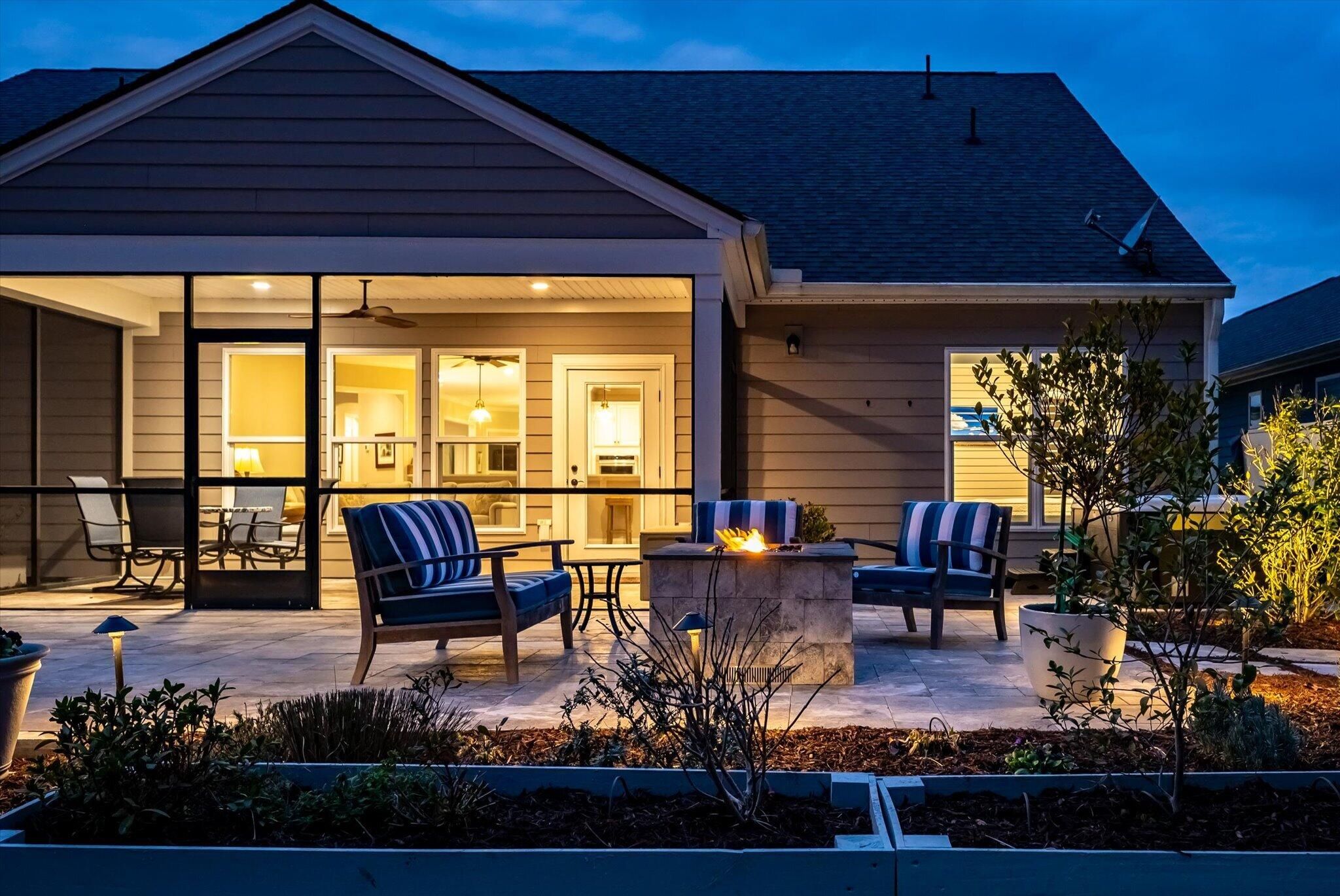 Ready for a lifestyle reboot? Welcome to resort-style living in the highly sought-after Del Webb Nexton active adult community. This desirable one-story Sonoma Cove model is a rare find with this floorplan no longer being offered in the new phases. This beautifully maintained 3 bedroom, 3 bath home offers the perfect blend of comfort, flexibility and low-maintenance living. Step inside to discover the open-concept layout is bathed in natural light and LV wood planks extending throughout the home, which is ideal for both everyday living and entertaining. Located off the foyer, through a set of French doors, is a flex room currently used as a home office/study and to the left is the dining room that flows right into the heart of the home. The spacious gourmet kitchen features generousquartz counter space, cabinets with soft close doors, pull-out shelves, designer copper backsplash, modern kitchen appliances, under cabinet LED lighting, abundant cabinetry, an island and breakfast bar seating overlooking the dining and spacious living areas. Right off the kitchen you'll find the large walk-in pantry and drop zone off the garage. The spacious master bedroom features a tray ceiling, crown molding, plantation shutters, and a private ensuite bathroom with ceramic tile flooring, a dual quartz vanity, and a zero-entry walk-in tile shower with built-in bench and glass enclosure. The walk-in closet has direct access to the laundry room featuring granite countertop with sink, upper cabinets, and storage closet, plus the GE Smart washer & dryer. A secondary guest suite with private bath provides ideal accommodations for visitors, while the third bedroom with attached full bath offers flexibility as a media room, in home gym, or additional guest space that is down their own hallway, providing ample privacy for guests. Off the family room you will access the screened-in lanai and see all the exterior features the owners have added to make this home one of a kind. The front and backyard landscaping and hardscaping have been architecturally designed to include marble pavers, built-in gas fire pit, gas grill with custom cabinet, custom fountains, path lights, uplighting on all trees and has the added bonus of a new Cal Spa Saltwater Hot Tub. Additional highlights include interior paint throughout the home, crown molding in the common areas, new Bosch Refrigerator/Freezer, whole house gutters with gutter guards, raised bed planters, recently upgraded landscape drip system, 2+ car garage with utility sink and pull down attic stairs to access the large lighted storage area. All this on a prime wooded lot and also perfectly positioned to overlook a serene pond from your front porch. Beyond your doorstep, Del Webb Nexton offers resort-caliber amenities including a designer clubhouse, state-of-the-art fitness center, resort-style pool, pickleball courts, and curated social experiences tailored to an active adult lifestyle and coming soon, its own bar and grill restaurant. Del Webb is located minutes from grocery stores, shops, Charleston's best restaurants, and historic downtown Summerville. Skip the wait for new construction and move directly into luxury, convenience, and community. Come see your new home TODAY!