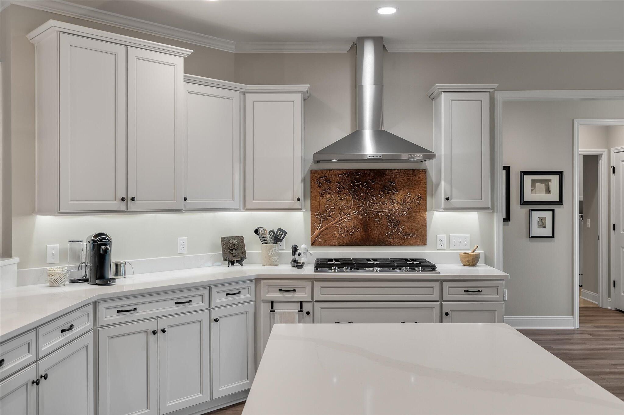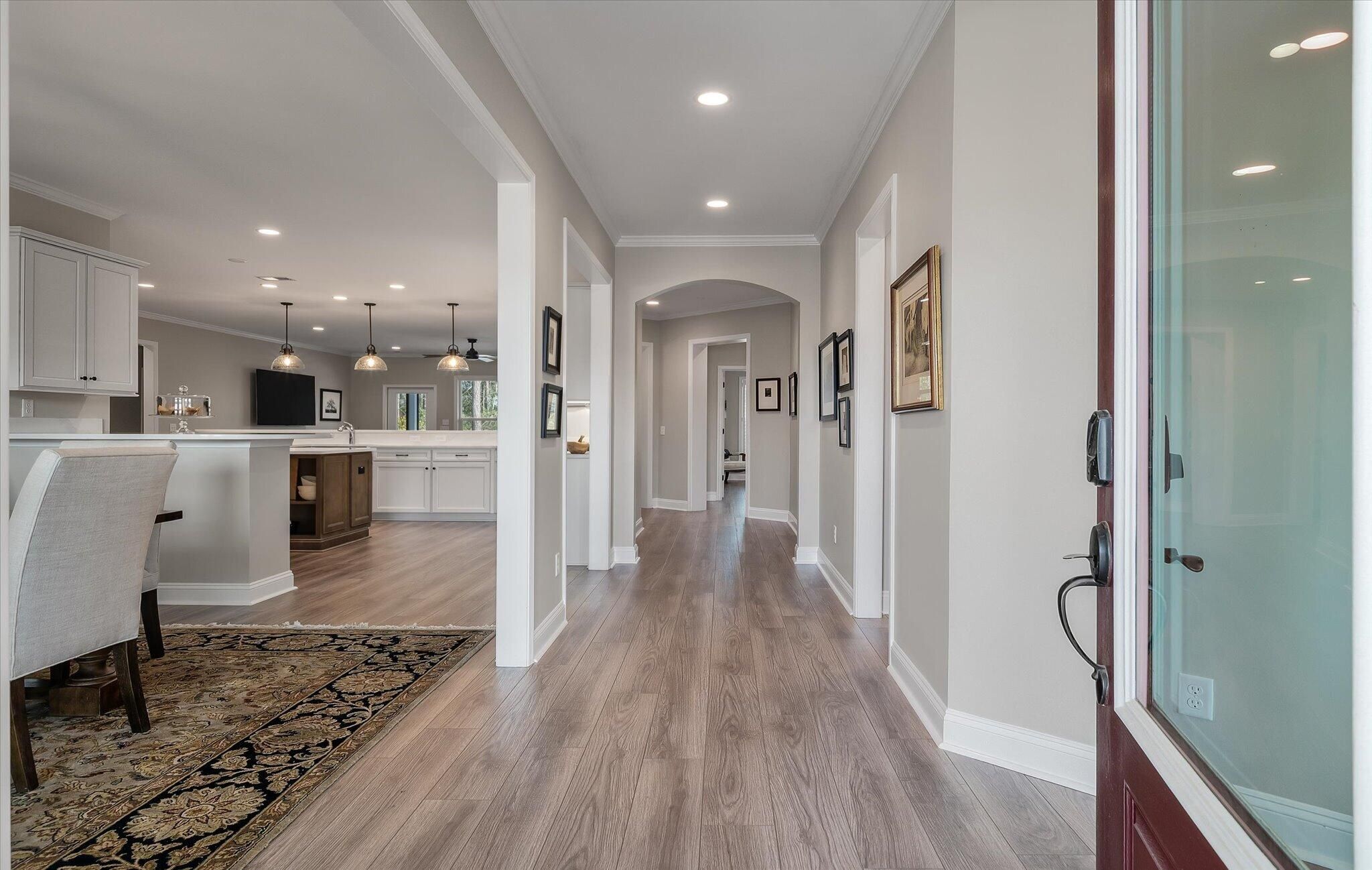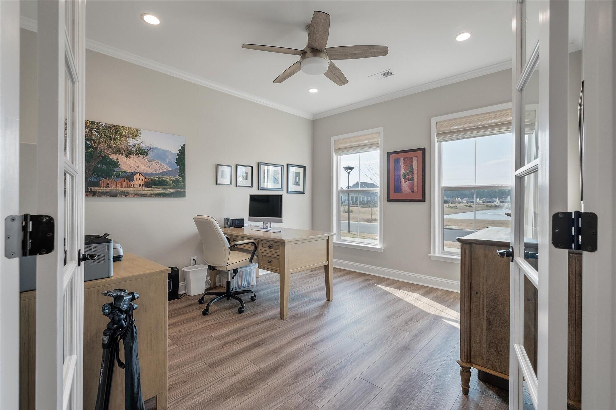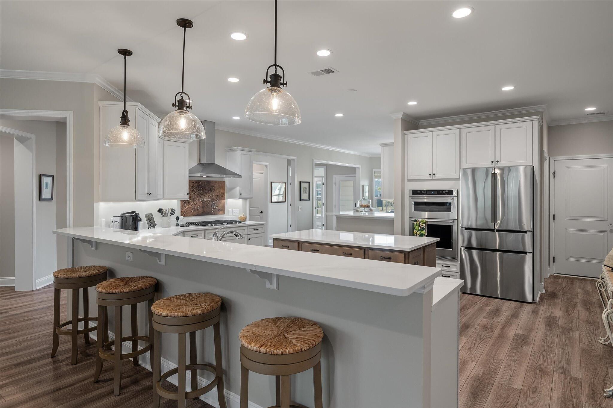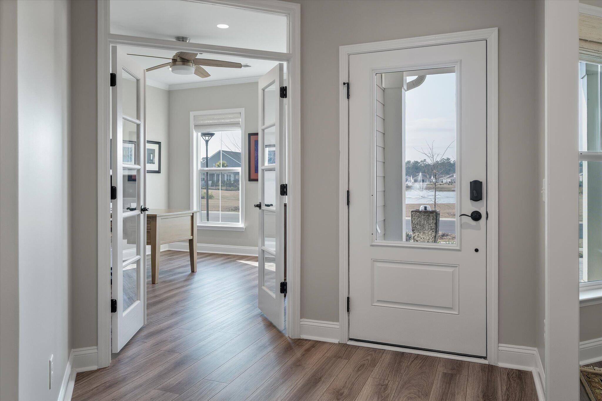 Ready for a lifestyle reboot? Welcome to resort-style living in the highly sought-after Del Webb Nexton active adult community. This desirable one-story Sonoma Cove model is a rare find with this floorplan no longer being offered in the new phases. This beautifully maintained 3 bedroom, 3 bath home offers the perfect blend of comfort, flexibility and low-maintenance living. Step inside to discover the open-concept layout is bathed in natural light and LV wood planks extending throughout the home, which is ideal for both everyday living and entertaining. Located off the foyer, through a set of French doors, is a flex room currently used as a home office/study and to the left is the dining room that flows right into the heart of the home. The spacious gourmet kitchen features generousquartz counter space, cabinets with soft close doors, pull-out shelves, designer copper backsplash, modern kitchen appliances, under cabinet LED lighting, abundant cabinetry, an island and breakfast bar seating overlooking the dining and spacious living areas. Right off the kitchen you'll find the large walk-in pantry and drop zone off the garage. The spacious master bedroom features a tray ceiling, crown molding, plantation shutters, and a private ensuite bathroom with ceramic tile flooring, a dual quartz vanity, and a zero-entry walk-in tile shower with built-in bench and glass enclosure. The walk-in closet has direct access to the laundry room featuring granite countertop with sink, upper cabinets, and storage closet, plus the GE Smart washer & dryer. A secondary guest suite with private bath provides ideal accommodations for visitors, while the third bedroom with attached full bath offers flexibility as a media room, in home gym, or additional guest space that is down their own hallway, providing ample privacy for guests. Off the family room you will access the screened-in lanai and see all the exterior features the owners have added to make this home one of a kind. The front and backyard landscaping and hardscaping have been architecturally designed to include marble pavers, built-in gas fire pit, gas grill with custom cabinet, custom fountains, path lights, uplighting on all trees and has the added bonus of a new Cal Spa Saltwater Hot Tub. Additional highlights include interior paint throughout the home, crown molding in the common areas, new Bosch Refrigerator/Freezer, whole house gutters with gutter guards, raised bed planters, recently upgraded landscape drip system, 2+ car garage with utility sink and pull down attic stairs to access the large lighted storage area. All this on a prime wooded lot and also perfectly positioned to overlook a serene pond from your front porch. Beyond your doorstep, Del Webb Nexton offers resort-caliber amenities including a designer clubhouse, state-of-the-art fitness center, resort-style pool, pickleball courts, and curated social experiences tailored to an active adult lifestyle and coming soon, its own bar and grill restaurant. Del Webb is located minutes from grocery stores, shops, Charleston's best restaurants, and historic downtown Summerville. Skip the wait for new construction and move directly into luxury, convenience, and community. Come see your new home TODAY!