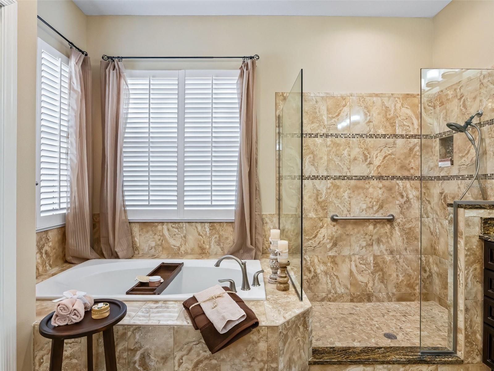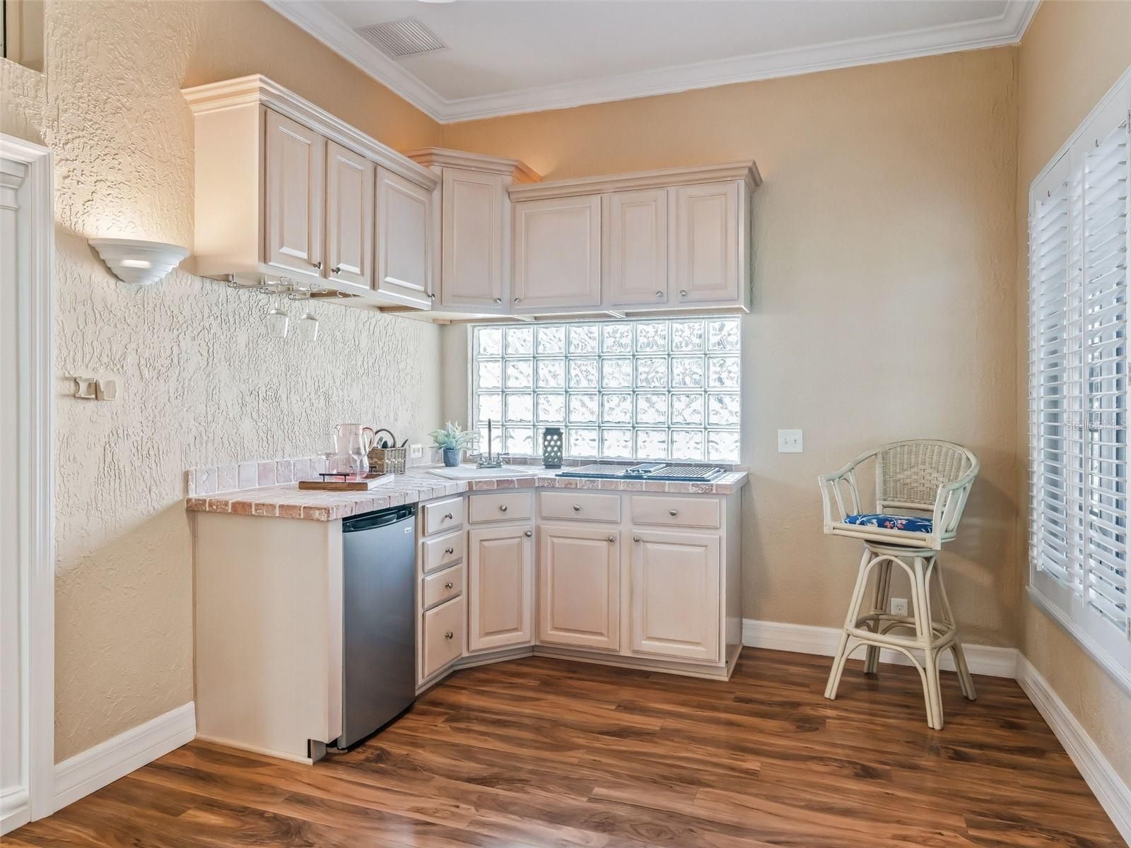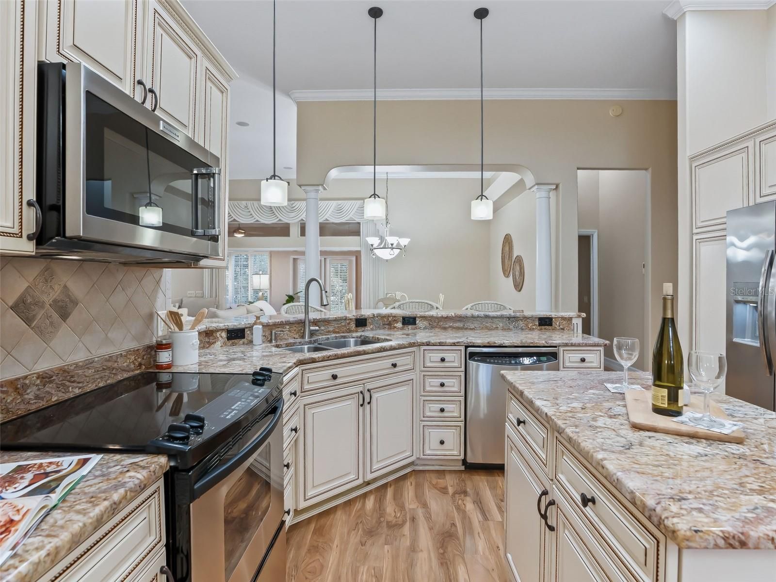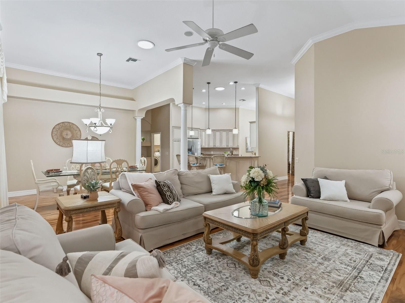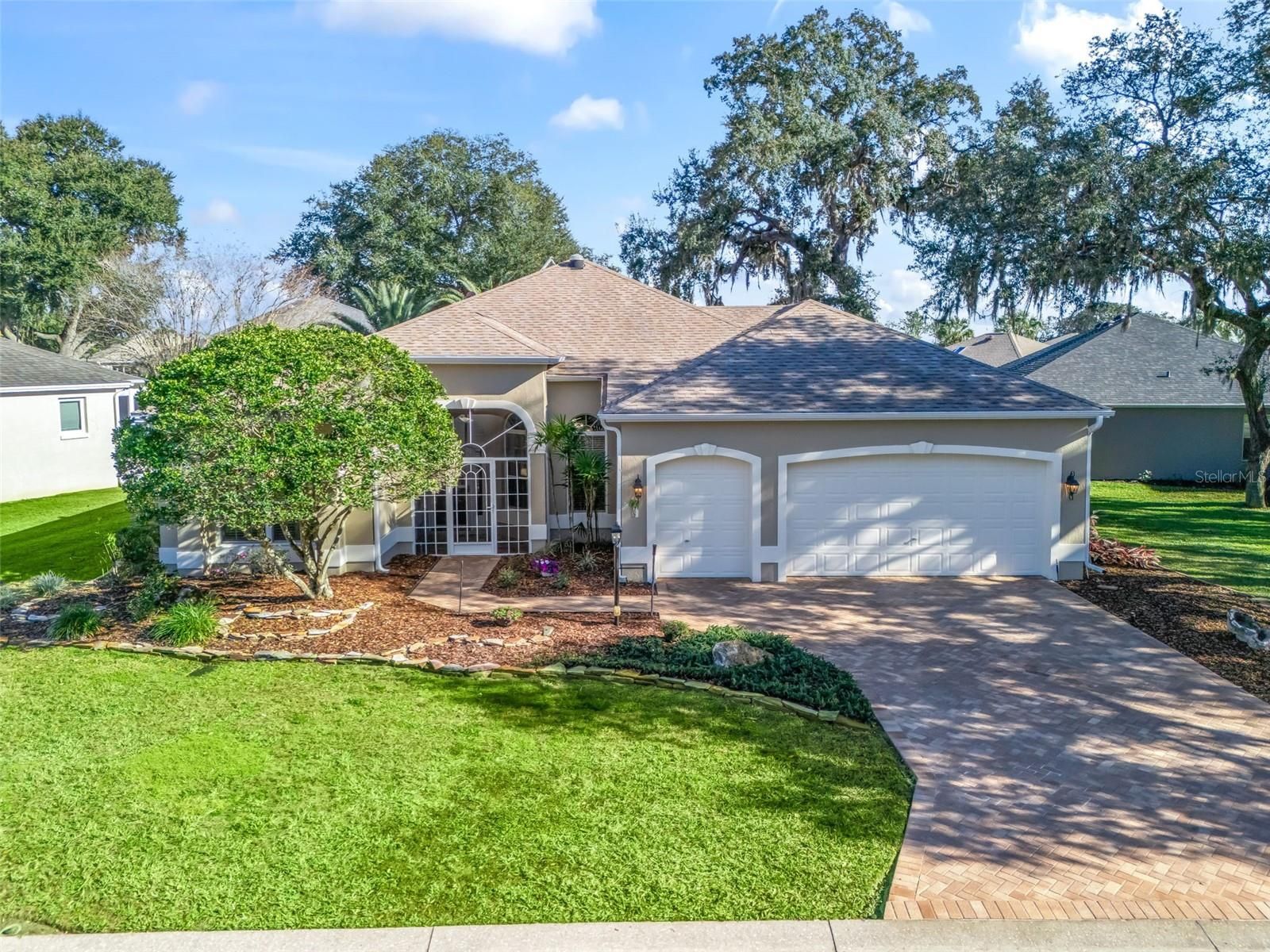 BOND PAID! PARK-LIKE SETTING! PREMIER-style residence offers close to 2,400 sf in the desirable all BLOCK & STUCCO NEIGHBORHOOD of the VILLAGE OF TIERRA DEL SOL! GREAT CURB APPEAL featuring professional landscaping, beautiful PAVER DRIVEWAY (sealed 12/2025), screened front patio, and beautiful mature trees. Notice the WOW!-HIGH 12’ CEILINGS!! ROUNDED DRYWALL CORNERS, CROWN MOLDING, TALLER INSULATED DOUBLE PANE WINDOWS, PLANTATION SHUTTERS, SOLAR TUBES, and a PROFESSIONALLY PAINTED INTERIOR & EXTERIOR (1/2026)!! Large, GORGEOUS Remodeled KITCHEN with new antique cabinetry with rope inlay, STAINLESS STEEL appliances, GRANITE countertops, an ISLAND, PENDANT LIGHTING, above cabinet lighting, UPGRADED LIGHT FIXTURES, plus a dinette and a large breakfast bar-ideal for both entertaining and everyday living. Enjoy the OPEN CONCEPT! Large Living room with a CUSTOM BUILT-IN WALL UNIT with an ELECTRIC FIREPLACE, TV, and an abundance of STORAGE CABINETS, and a spacious adjacent FORMAL DINING ROOM for hosting. EXPANDED for YEAR-ROUND COMFORT with a 28 X 11 FLORIDA ROOM featuring Custom casement windows and a SUMMER KITCHEN including a JennAir downdraft grill, cabinetry, refrigerator, and a sink, plus Master Suite Private Access. Both REMODELED BATHROOMS are STUNNING with high-end finishes! The master BATH has top-of-the-line PORCELAIN TILE, and the guest bath has TOP GRADE TRAVERTINE STONE! Both boast BEAUTIFUL UPGRADED SHOWERS, VANITIES, FIXTURES, MIRRORS, & LIGHTING! Master Ensuite is Exquisite—A MUST SEE!! Step outside through the rear French doors to a Beautiful 18' X 22' PERGOLA with new fan (1/2026) for a breeze over the beautiful newly laid brick PAVER PATIO (12/2025), enhanced by a water feature w/ new pump (1/2026) framed by peaceful, park-like privacy. ROOM FOR A small POOL or Large HOT TUB SPA! Additional highlights include CUSTOM DRAPERY, beautiful wood laminate flooring in main living areas and master bedroom. BRAND NEW carpeting (12/2025) located in the front bedroom/office and 2nd guest bedroom, whole house surge protection, seamless gutters, CUSTOM BUILT-IN hall WALL UNIT near Laundry Room, UPGRADED FANS with light kits, LARGE extra CLOSET PANTRY in the Laundry Room, a 2-car plus GOLF CART GARAGE that SHINES with suspending CEILING STORAGE units and BRAND NEW paint and EPOXY FLOOR (12/2025), and an INSIDE LAUNDRY ROOM w/built-in laundry sink, cabinets, folding table, large PANTRY CLOSET, Washer & Dryer. 2 minutes to Tierra Del Sol Country Club, CHAMPIONSHIP GOLF & RESTUARANT and the Tierra Del Sol Recreation Center w/TENNIS courts, PICKLE BALL, Bocci, Horse Shoes, Corn Hole, adult POOL & More! CLOSE TO SHOPPING & DINING & Entertainment. GREAT LOCATION! Between Spanish Springs & Lake Sumter Landing Town Squares! (2.8mi either direction!) FURNITURE INCLUDED! ROOF 2020
