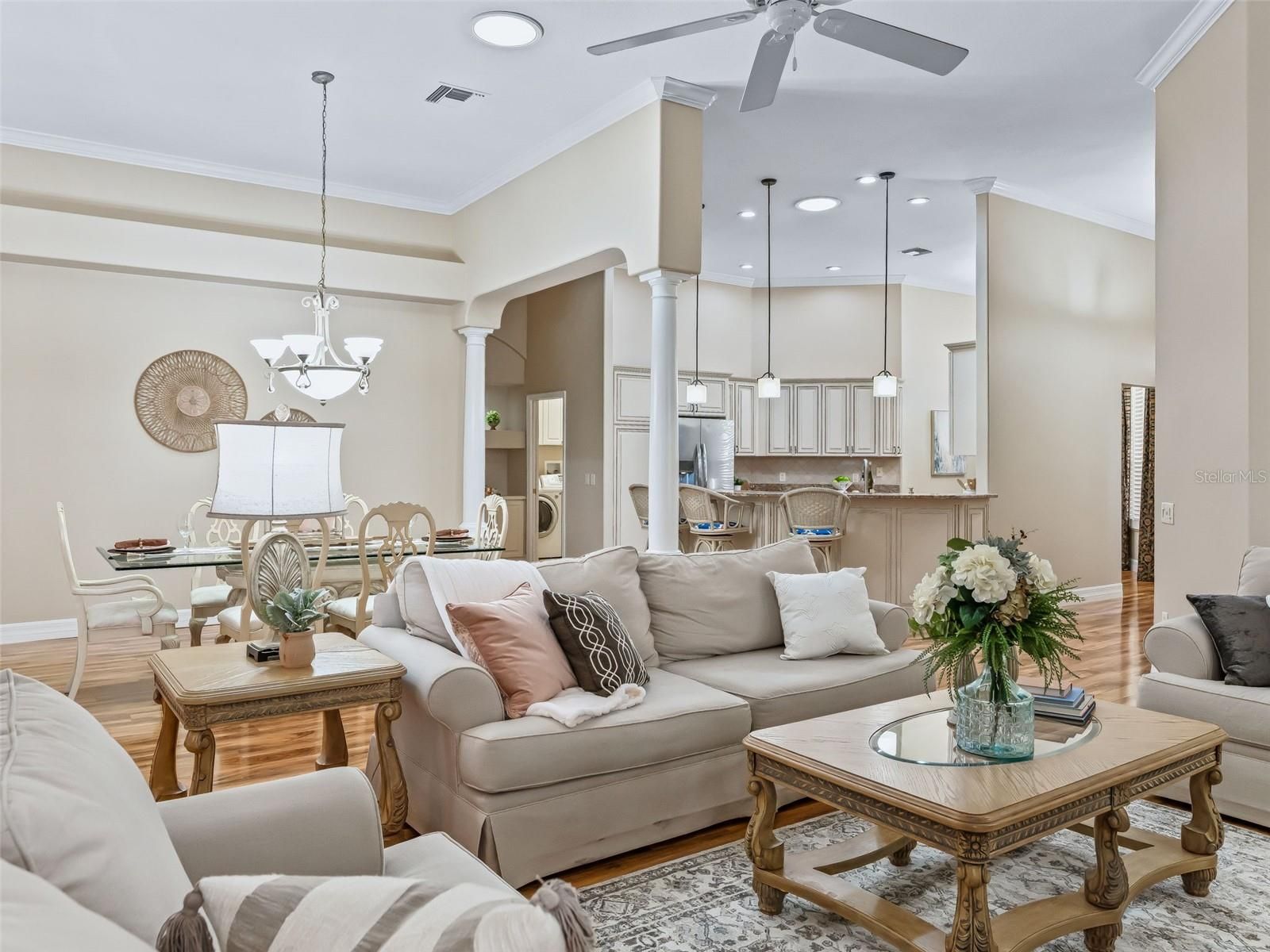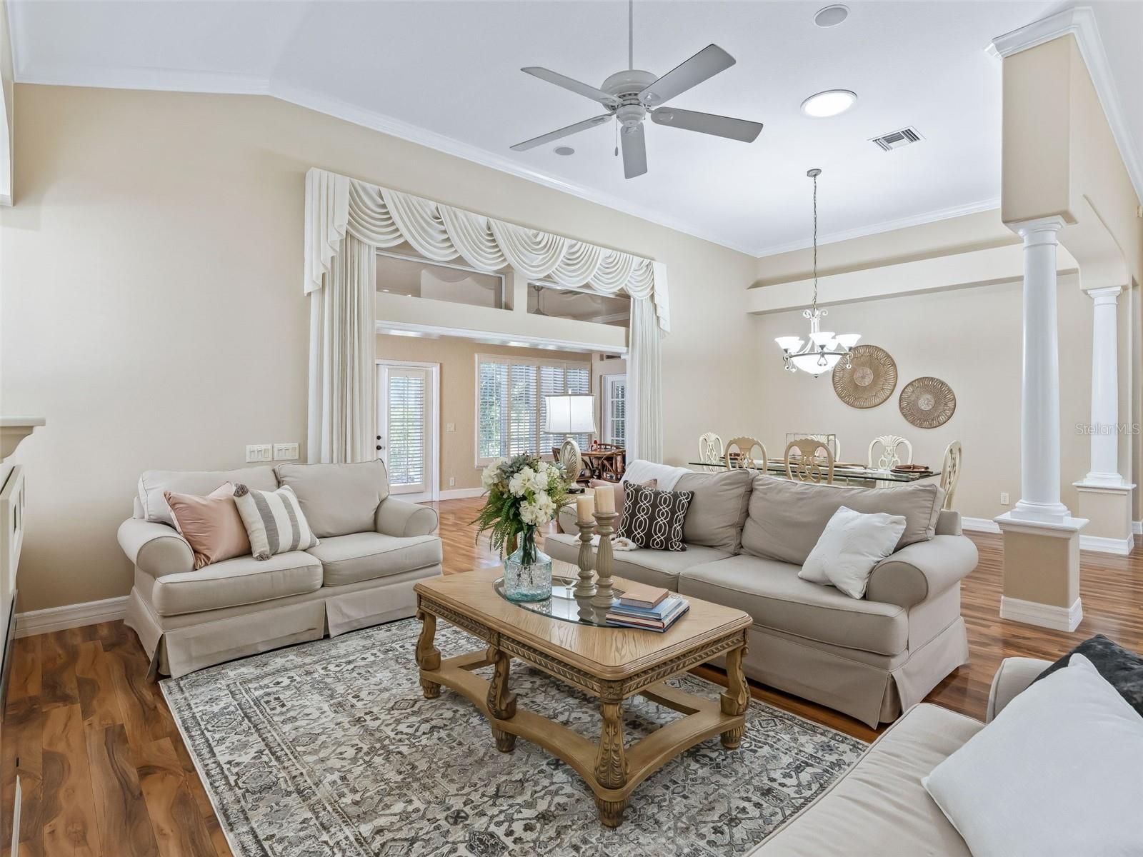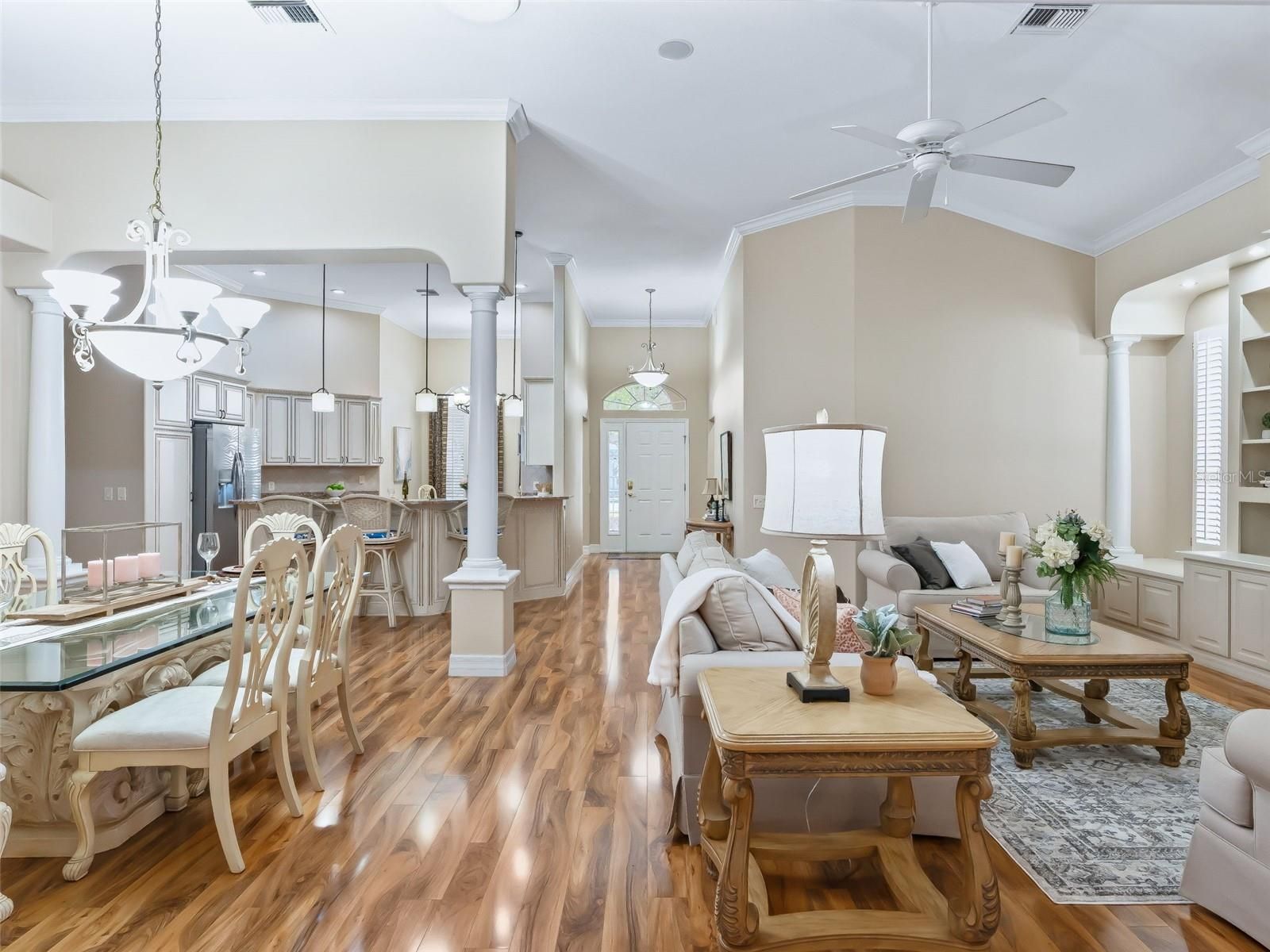 - Built-in Features, Ceiling Fan(s), Crown Molding, Eat-in Kitchen, High Ceilings, Living/Dining Room, Open Floorplan, Main Level Primary, Split Bedrooms, Walk-In Closet(s), Wet Bar, Window Treatments
