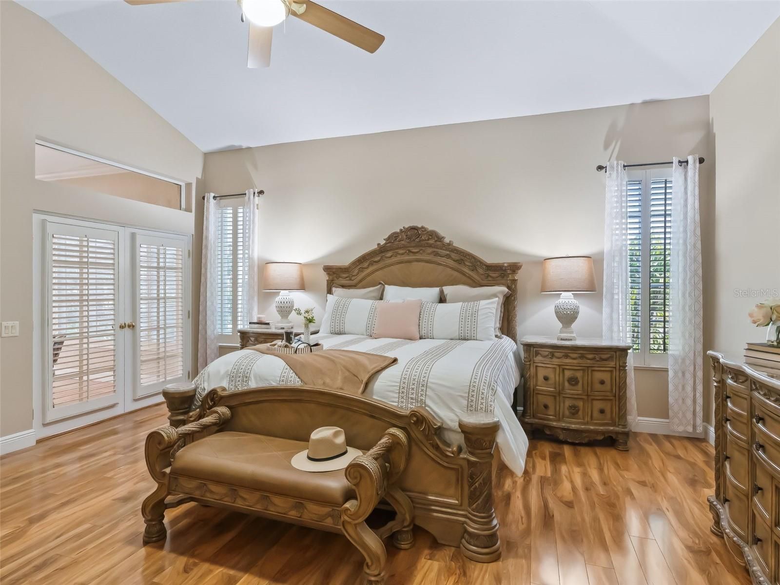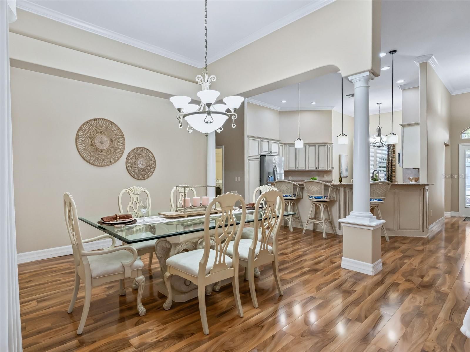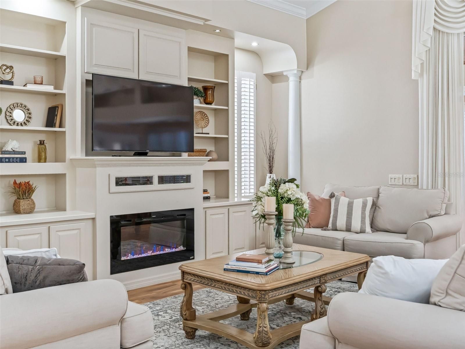 - Built-in Features, Ceiling Fan(s), Crown Molding, Eat-in Kitchen, High Ceilings, Living/Dining Room, Open Floorplan, Main Level Primary, Split Bedrooms, Walk-In Closet(s), Wet Bar, Window Treatments