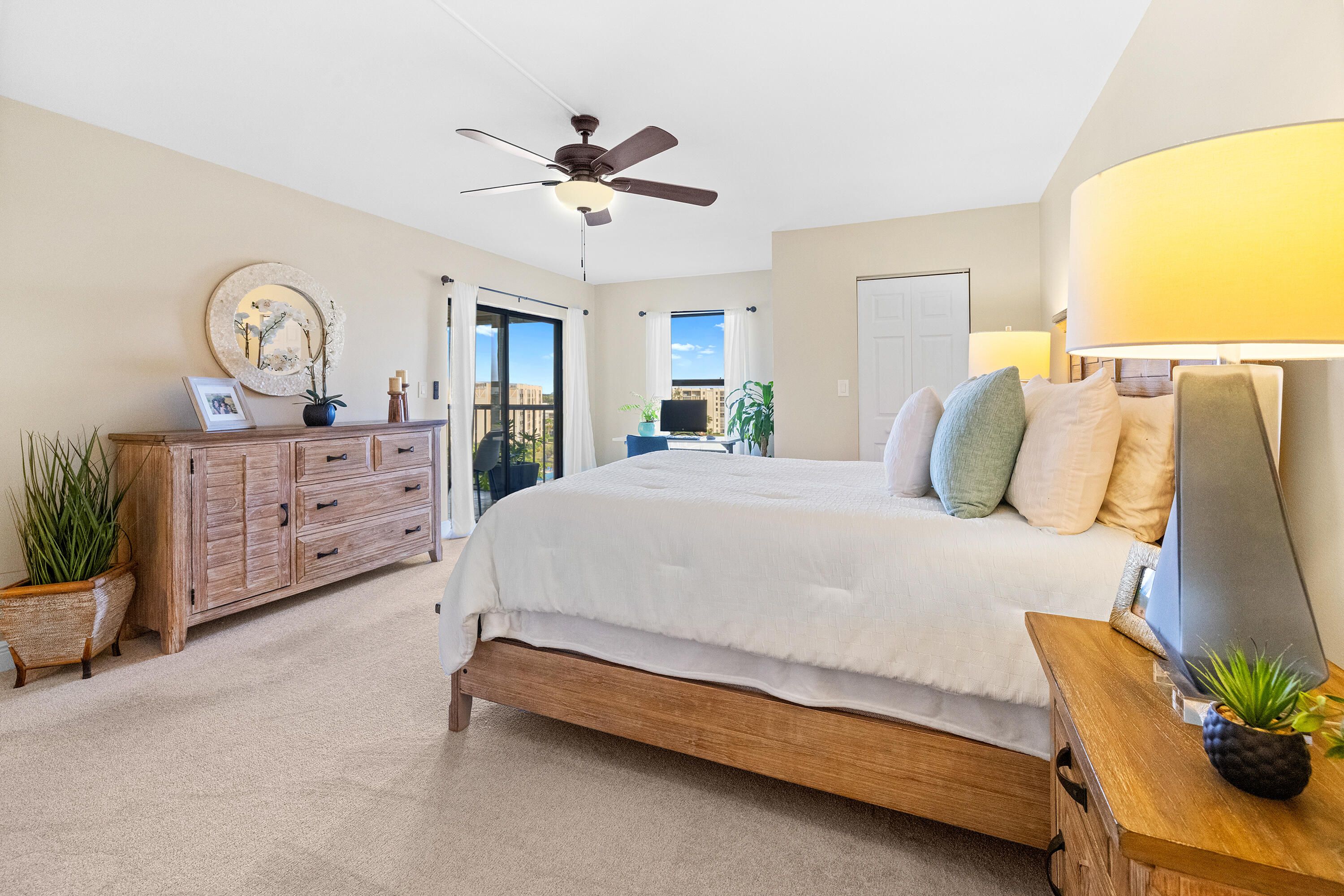 Enjoy exceptional lake views from this fully-furnished, beautifully maintained penthouse residence in a desirable 55+ community. Thoughtfully designed with a split-bedroom layout, the open floor plan offers both comfort and privacy, complemented by abundant storage throughout. Carpet and tile flooring enhance the living spaces, while an in-unit washer and dryer add everyday convenience. The home features impact windows providing peace of mind. Recent updates include a new A/C system, new impact windows, new carpet, a remodeled primary bathroom, and updates to the second bathroom with a new sink, mirror, and flooring. The kitchen has been refreshed with a new countertop and dishwasher.