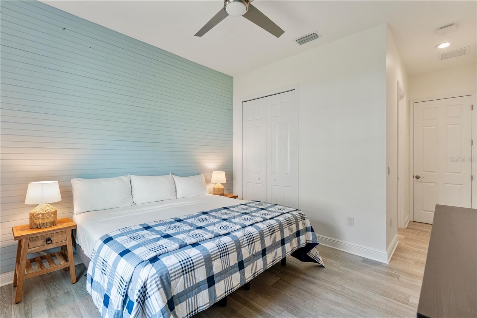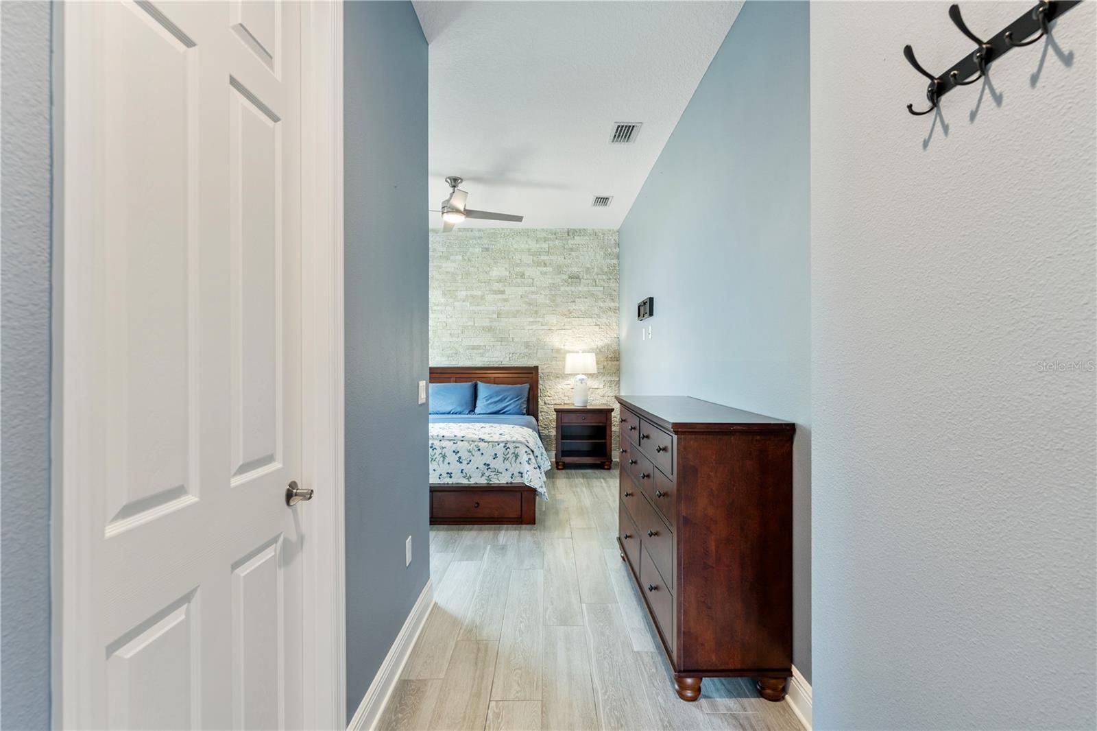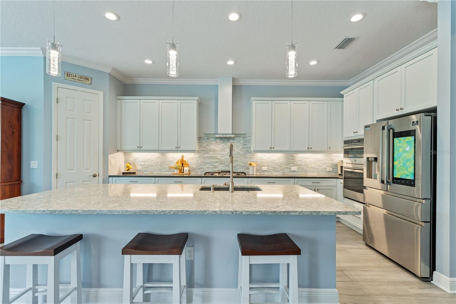 - Ceiling Fan(s), Coffered Ceiling(s), Crown Molding, Eat-in Kitchen, High Ceilings, Kitchen/Family Room Combo, Open Floorplan, Main Level Primary, Solid-Wood Cabinets, Split Bedrooms, Stone Counters, Thermostat, Walk-In Closet(s)