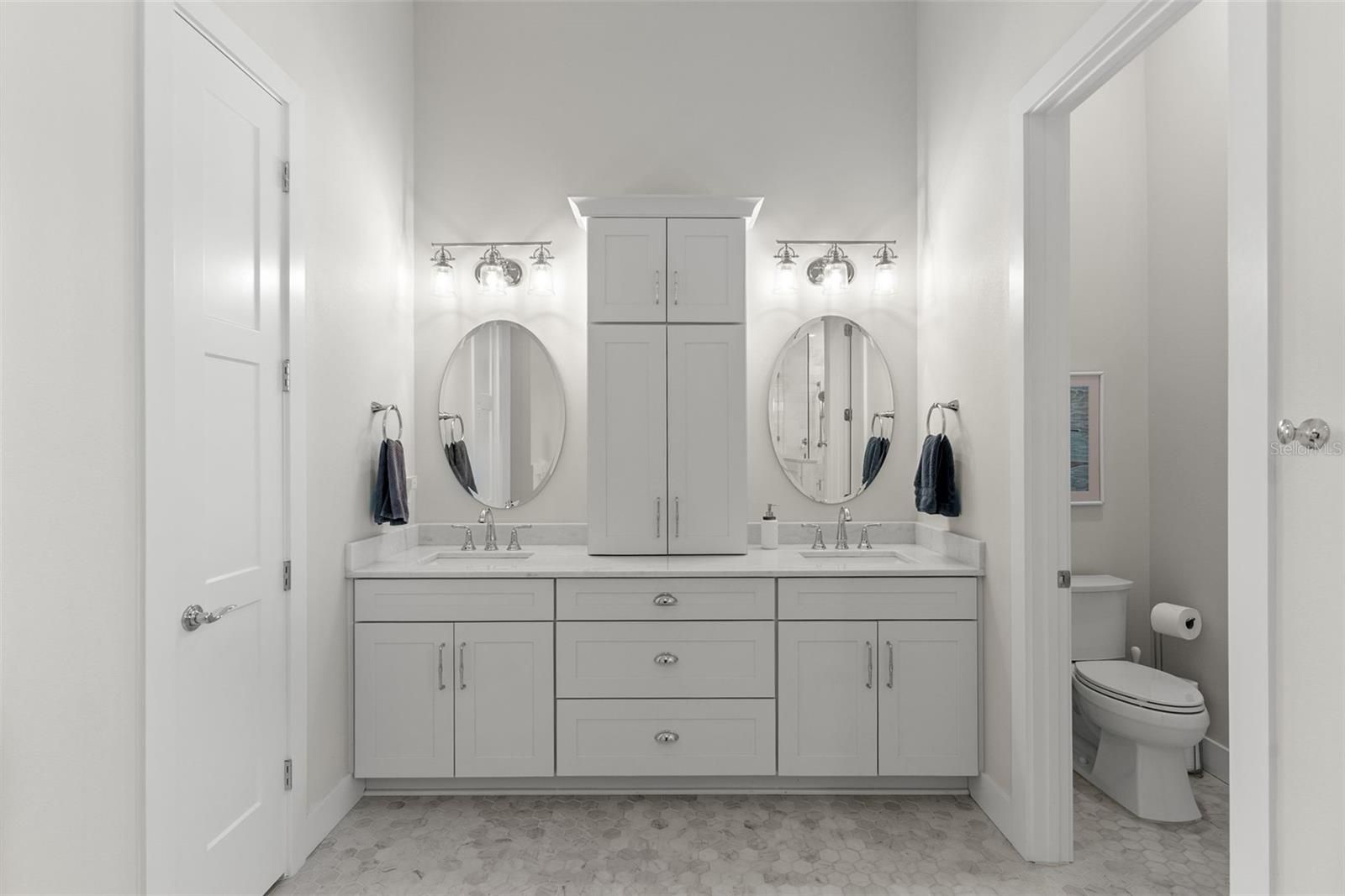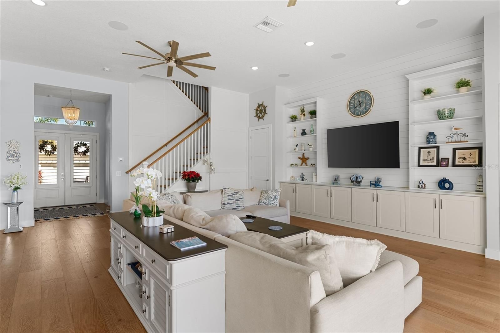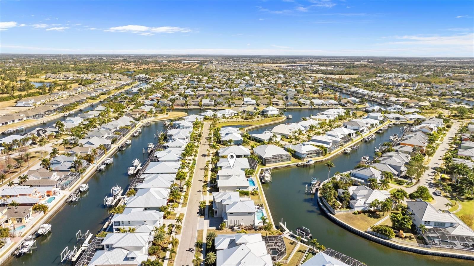 Welcome to your custom coastal dream home, where refined luxury meets relaxed waterfront living. This exceptional 5-bedroom, 5-bath residence offers over 131 feet of saltwater canal frontage, providing serene views and direct boating access from your private 16,000 lb boat lift. Inside, stunning wall-to-wall European oak flooring and soaring 12-foot ceilings throughout the first floor establish an elegant coastal aesthetic. Just off the foyer, a private study and versatile flex space offer endless possibilities, ideal for a second office, playroom, craft room, den, or even a sixth bedroom. The open-concept design flows effortlessly into a spacious great room with picturesque views of the oversized heated saltwater pool, spa, and canal beyond. Designed to impress, the chef’s kitchen features natural quartzite countertops, premium Wolf and Sub-Zero appliances, two Bosch dishwashers, and a concealed walk-in pantry complete with a wine refrigerator. The luxurious primary suite is conveniently located on the main level and serves as a spa-inspired retreat with marble flooring, an oversized soaking tub, and an expansive marble walk-in shower. An additional guest bedroom and full bath are also located downstairs. Upstairs, 10-foot ceilings enhance the sense of space, and a bonus/media room with surround sound and projector screen creates the perfect setting for entertainment or relaxation. Three additional bedrooms each include en-suite bathrooms and walk-in closets, ensuring comfort and privacy for family and guests. This home is thoughtfully constructed for both durability and convenience, featuring PGT hurricane-impact windows and doors, a standing seam metal roof, durable siding, a whole-house water filtration system, pre-plumbing for a whole-house generator, a hardwired security camera system, Control4 home automation with integrated surround sound, an elevation certificate to help reduce flood insurance costs, a transferable flood insurance policy under $800/year, and an invisible fence system. An oversized three-car garage completes the property. The outdoor living space is equally impressive, highlighted by an oversized heated saltwater pool and spa, all set against tranquil canal views. Residents enjoy access to a resort-style community offering a clubhouse, heated swimming pool with water slide, three playgrounds, a fully equipped fitness center, basketball and tennis courts, pickleball courts, and a café with a full liquor license. This is waterfront living at its finest, where luxury, comfort, and coastal elegance seamlessly come together.