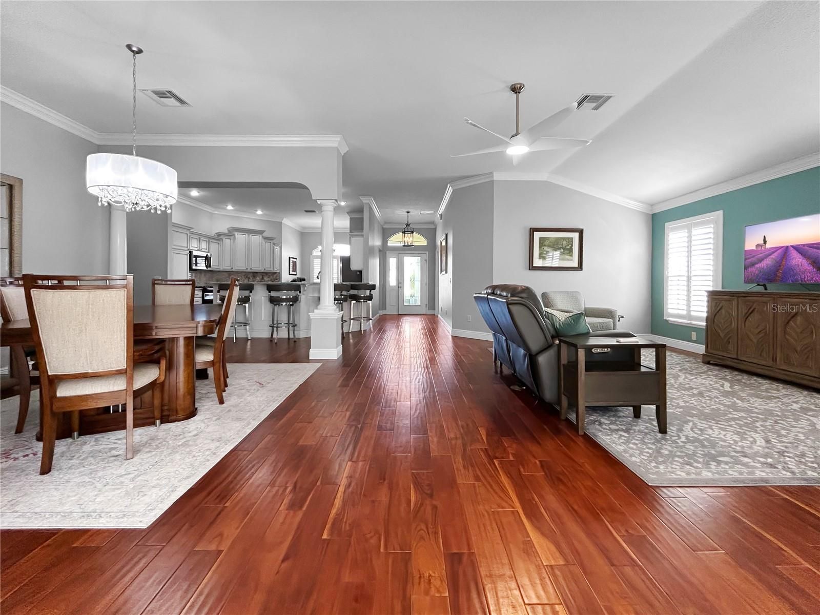 - Ceiling Fan(s), Crown Molding, Eat-in Kitchen, High Ceilings, Living/Dining Room, Open Floorplan, Main Level Primary, Split Bedrooms, Stone Counters, Vaulted Ceiling(s), Walk-In Closet(s), Window Treatments