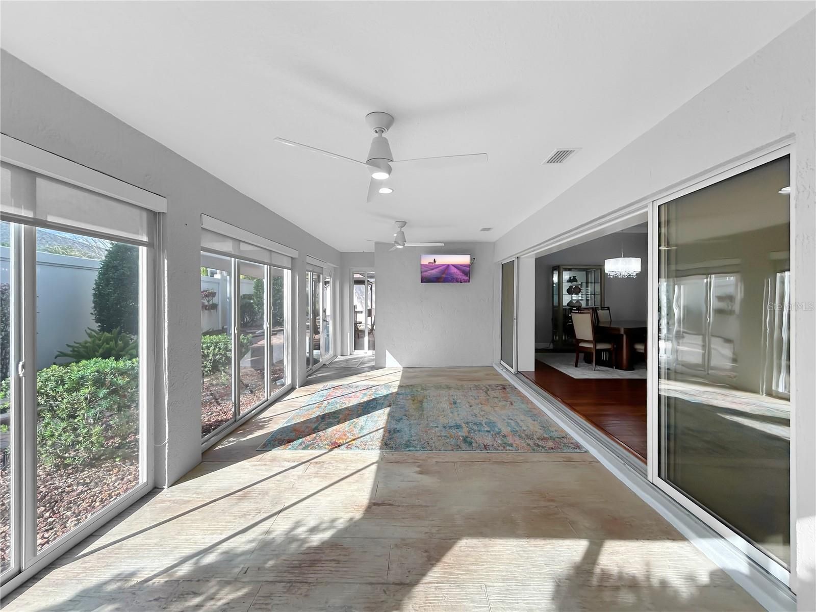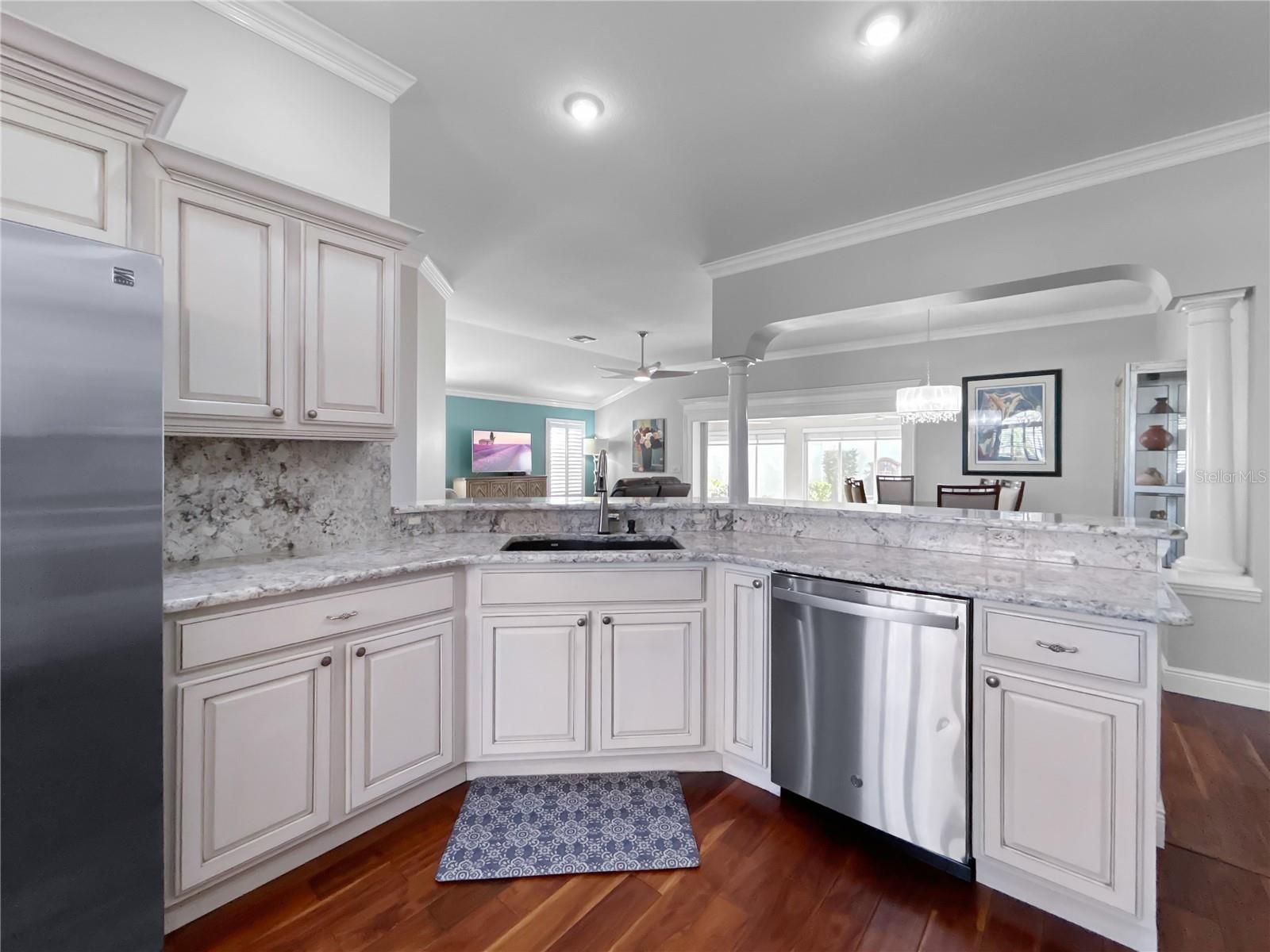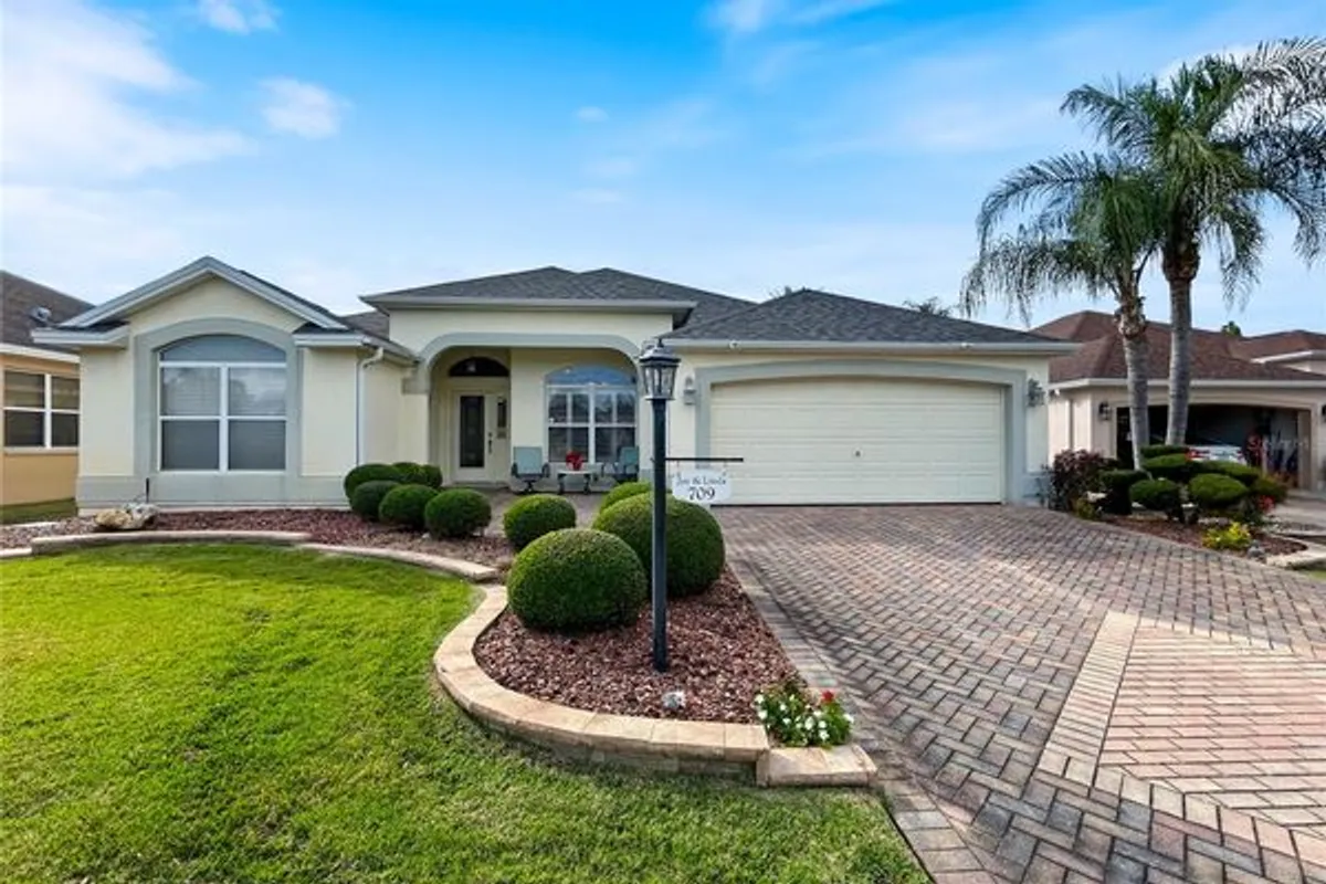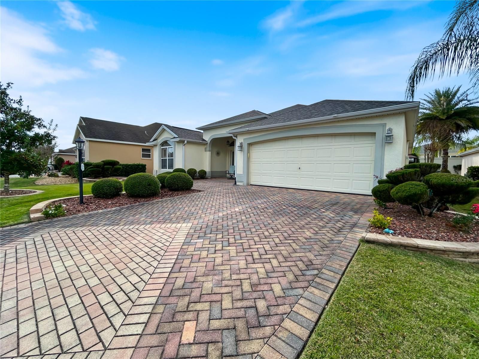Welcome to this stunning GARDENIA model—beautifully updated, impeccably maintained, and enviably located in the highly sought-after Village of Virginia Trace, just minutes from Lake Sumter Landing. With a NEW 2025 ROOF and HOT WATER HEATER, 2026 HVAC and BOND PAID this residence pairs exceptional peace of mind with the lifestyle so many dream of. As you arrive, the PAVER DRIVEWAY, manicured stone-trim landscaping beds, and charming front porch set an inviting tone. Step inside through the decorative GLASS ENTRY with retractable screen, and you are welcomed by soaring VAULTED CEILINGS, abundant natural light, and a sense of space that feels both open and intimate. The main living areas feature continuous engineered wood floors, CROWN MOLDING, elegant architectural columns, and PLANTATION SHUTTERS throughout. The open-concept living and dining areas flow seamlessly into the GLASS ENCLOSED FLORIDA ROOM—a sunlit extension of the home where wall-to-wall windows spotlight the tranquil, professionally landscaped backyard and its soothing fountain. At the heart of the home, the CHEF’S KITCHEN delights with rich creme tall cabinetry (with full pullouts), GRANITE counters and FULL GRANITE BACKSPLASH, stainless steel appliances, and a GAS STOVE . A breakfast bar and a movable entertainment bar add style and flexibility when hosting. The LUXURY primary suite is a true sanctuary. Here, CROWN MOLDING, upgraded flooring, and a BUILT-IN dual office area create an elegant and functional private retreat. TWO WALK IN CLOSETS, plus an additional linen closet, provide generous storage. The ensuite bath continues the elevated feel with his and her sinks and vanities , a glass-enclosed walk-in shower, and a dedicated makeup/vanity area—all designed for comfort and ease. The SPLIT BEDROOM PLAN ensures complete privacy for guests. On the opposite side of the home you will find the ample guest bedroom along with 3rd room that makes a great den or second guestroom (no closet in room, there is a closet in hall). Both rooms share a beautifully updated bathroom with GRANITE counters and a tiled tub/shower combination—ideal for visitors or extended stays. The INDOOR LAUNDRY room with GAS dryer adds practicality with upper cabinetry for extra storage and direct access to the garage. The TWO-CAR GARAGE is finished with EPOXY-coated floors, pull-down attic stairs, and ample space for seasonal items, golf gear, or workshop needs. This home includes a NOVA whole house water filtration system. Step outside to your private backyard retreat—an extended patio with mature landscaping, custom rock features, and a peaceful fountain that creates a serene, spa-like atmosphere. The Florida room features SOLAR SHADES for year-round comfort, while the screened entry, upgraded lighting, and multiple ceiling fans enhance the home’s livability. Located just minutes from the Virginia Trace neighborhood pool and a short golf cart ride to Lake Sumter Landing for dining, entertainment, and shopping, this residence delivers the ideal blend of luxury, location, and lifestyle. This home truly has it all. Schedule your private showing today and start living the dream in The Villages.