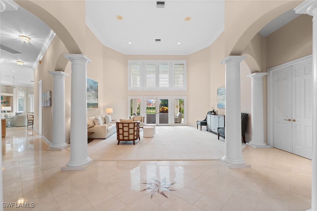 In the exclusive, gated Jamestown community in Pelican Bay. This elegant residence offers western exposure with spectacular sunset skies and serene golf course and lake views. The expansive outdoor area includes a pool, spa and open patio, ideal for entertaining family and friends. The floor plan features three en-suite bedrooms, a spacious den, formal dining room and bar. The light-filled living and family rooms include a fireplace, while the open kitchen offers a pantry and breakfast nook. The primary suite opens to the outdoors and includes dual walk-in closets and a luxurious bath. Additional features include a large laundry room, three-car garage, new roof (2019), and impact-resistant sliding glass doors in the primary suite and kitchen. Enjoy Pelican Bay’s premier amenities: three miles of private beach with tram service, two beachfront pavilions with dining, a state-of-the-art fitness and wellness center, 18 Har-Tru tennis courts, and option to join Club Pelican Bay with 27 holes of championship golf and a newly rebuilt clubhouse.