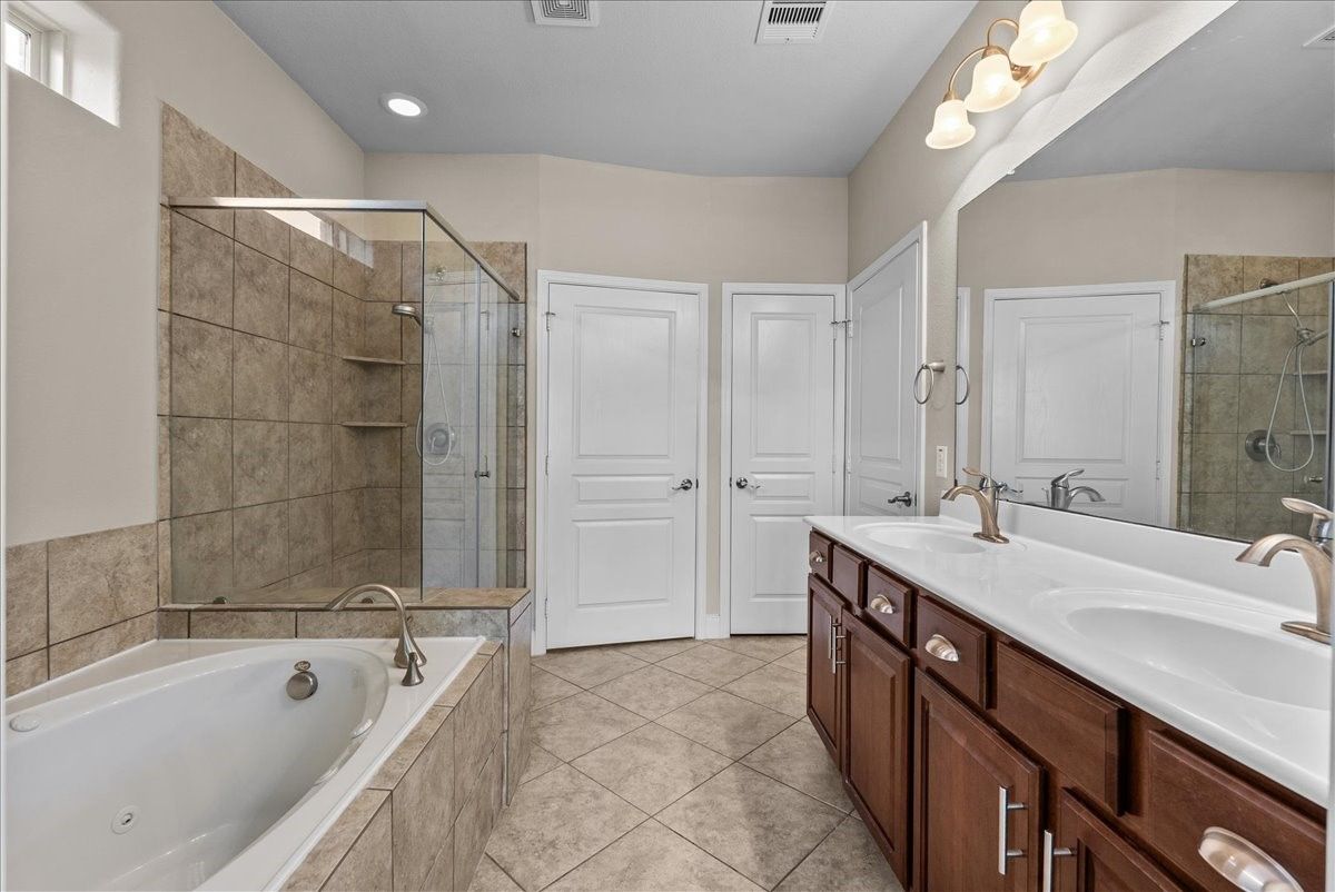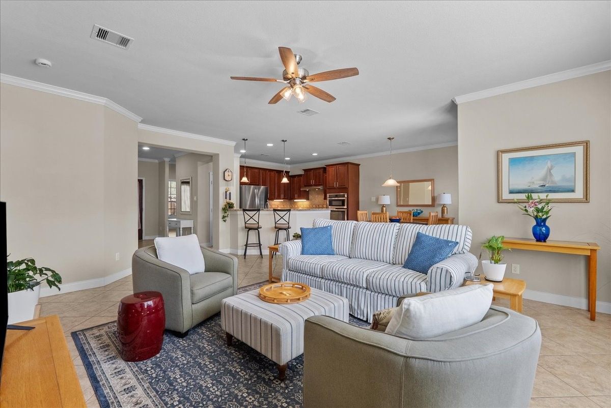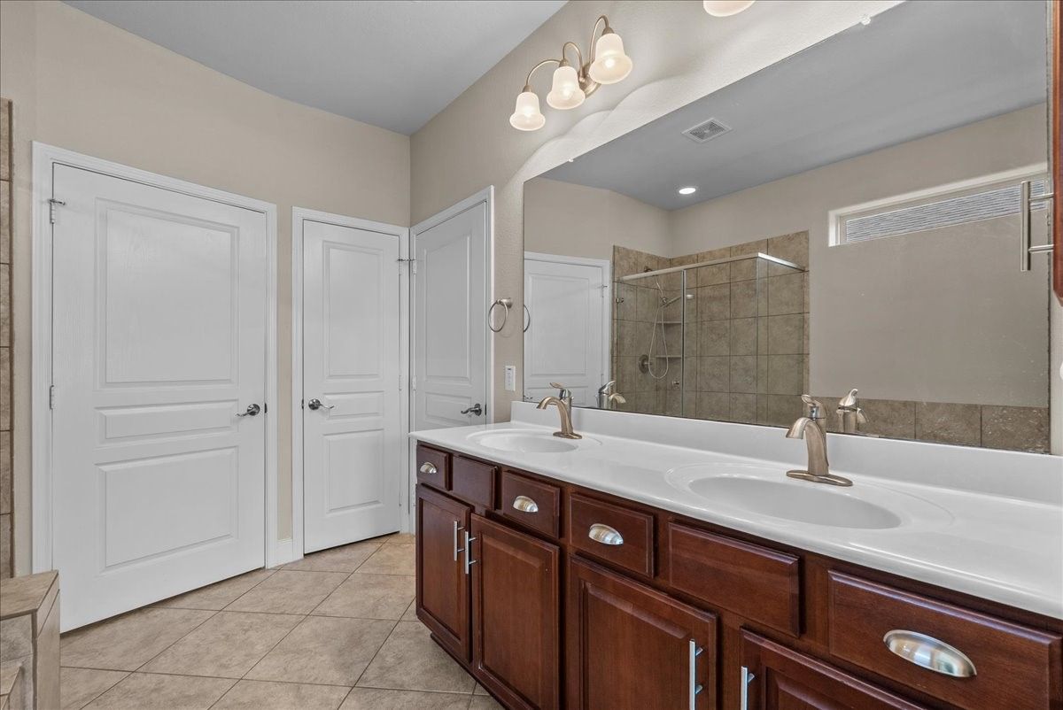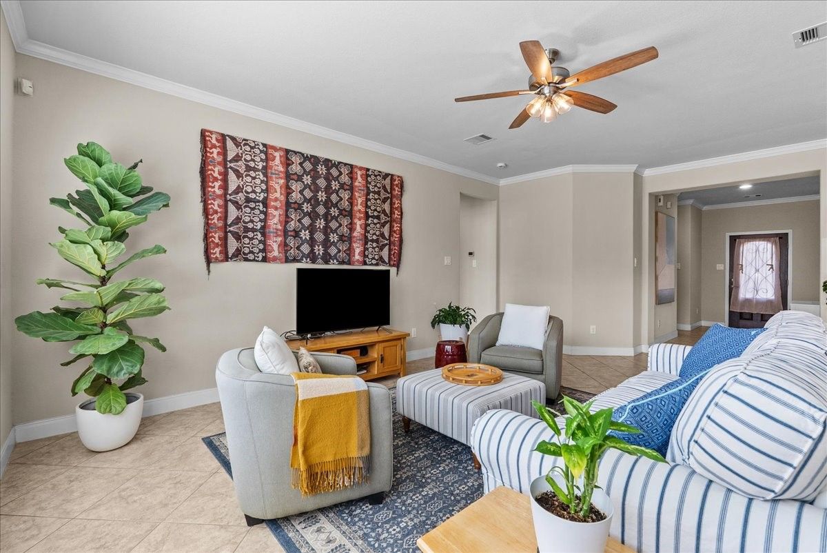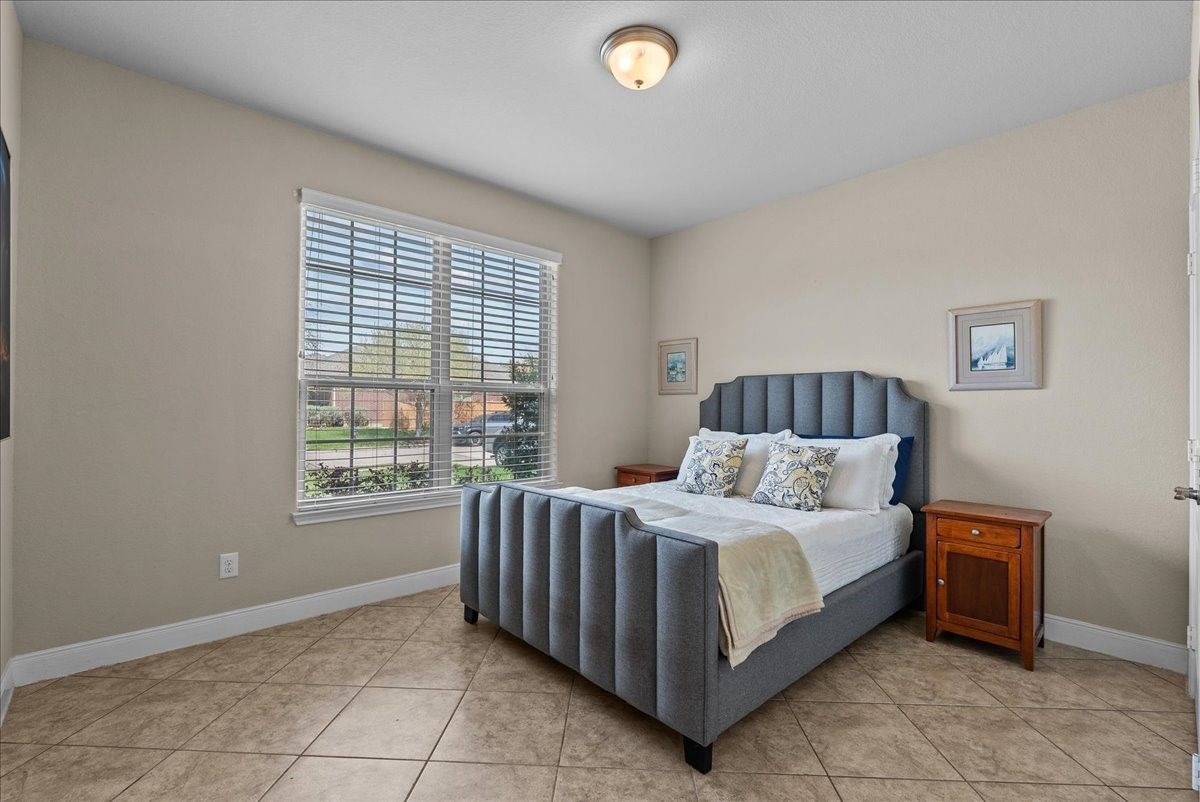 This single-story gem nestled in the highly coveted and gated Village at Tuscan Lakes 55+ community is THE home you are looking for! Beautiful tile floors throughout. NO CARPET! Open floorplan with crown molding sets the tone in this flowing open-concept. Spacious kitchen features granite counters, lots of cabinet space, & stainless steel appliances. Retreat to the serene and abundant primary suite, where a spa-inspired ensuite awaits with a large garden tub, separate shower, and dual vanities. Plus a massive walk-in closet. Secondary bedroom, located at the front of the home is spacious and has a large closet and adjacent full bathroom. A handsome study with French doors offers the ideal private workspace. Oversized utility room with sink and built-in closet adds everyday practicality. Thoughtful finishes throughout; wrought iron glass front door, 2" blinds, ceiling fans, garage door opener, and a full sprinkler system. A recently installed left fence completes the outdoor space.
