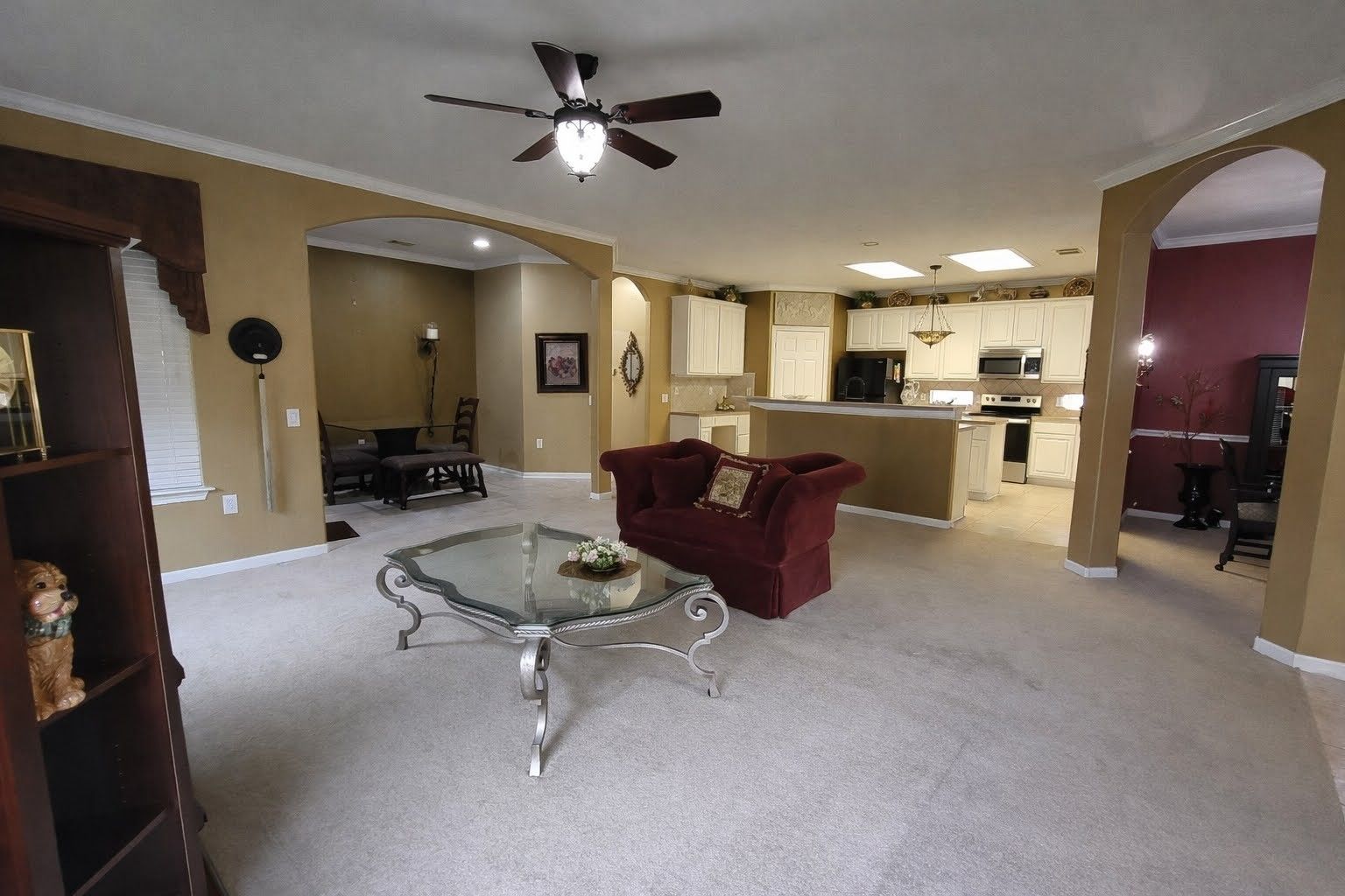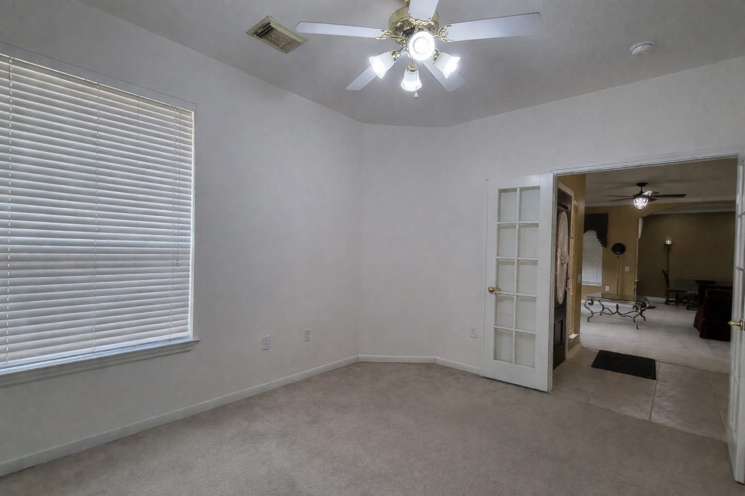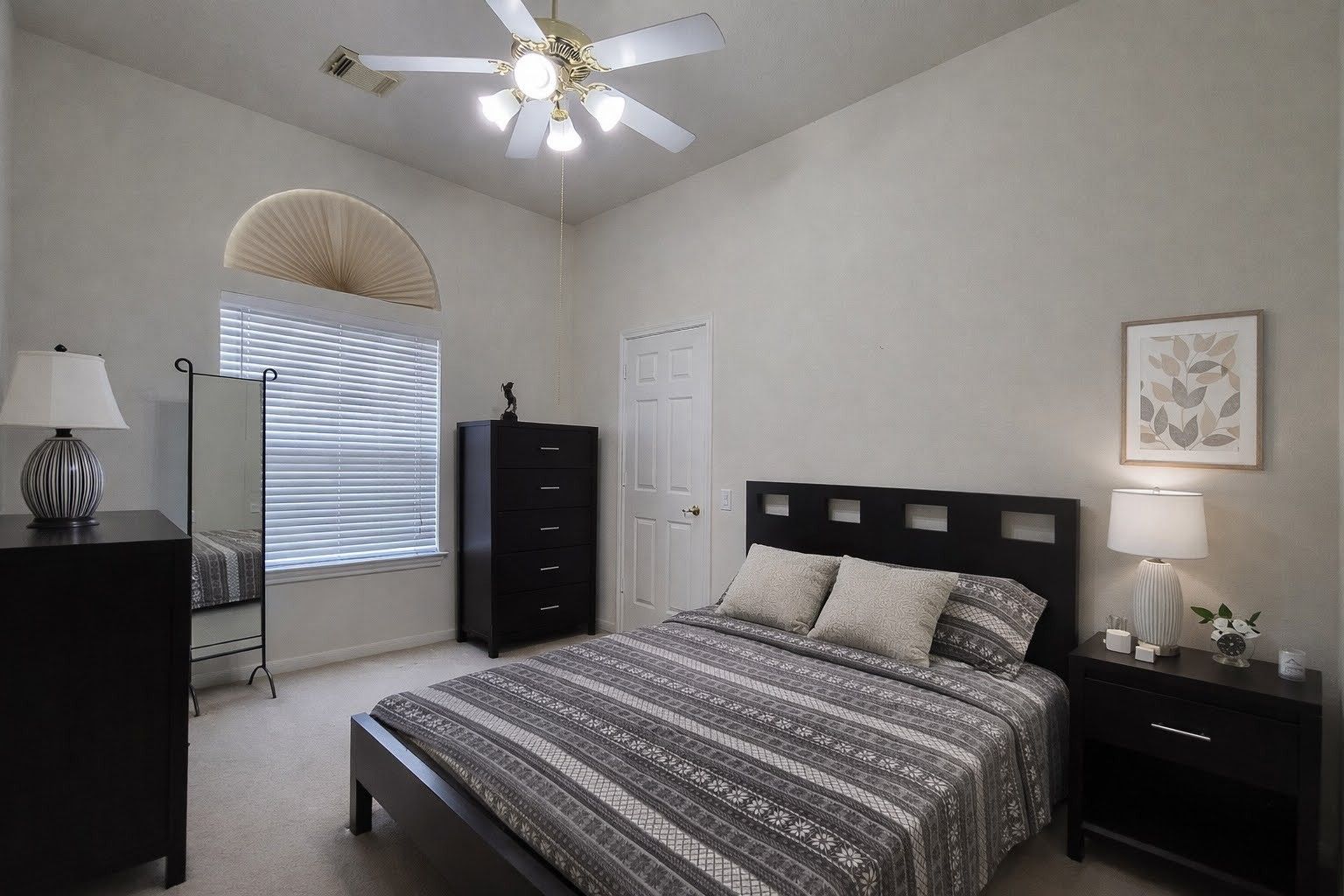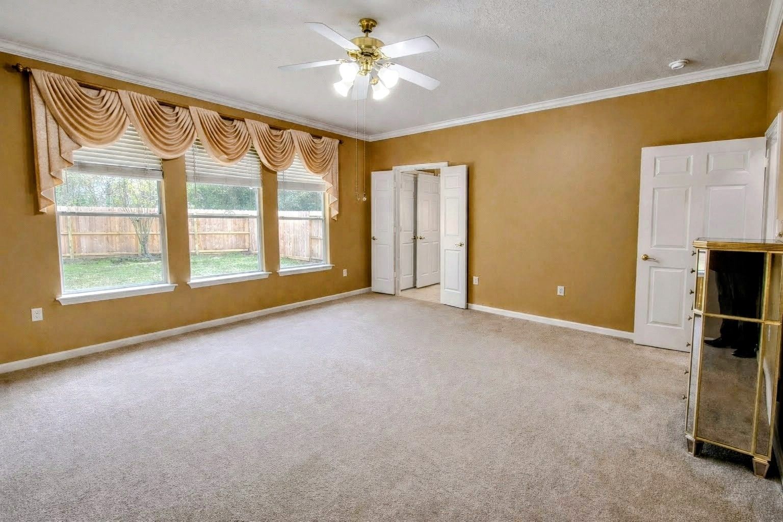 Well-maintained one-story home with a functional split floor plan & valuable upgrades throughout. The spacious living area flows into the kitchen, offering ample cabinet and counter space and an open feel ideal for everyday living and entertaining. The private primary suite features an en-suite bath with extended vanity and seating area, separate shower, soaking tub, and a large walk-in closet. Secondary rooms are generously sized, including a dedicated office or 3rd bedroom with a full-size closet, offering flexible living options.Recent improvements include a new HVAC system installed October 2024 and a whole-home generator for added comfort and peace of mind. Enjoy the covered and screened patio overlooking a large, private backyard with no rear neighbors, ideal for outdoor living, entertaining, or future customization. Property also includes a backyard storage unit. Convenient location near I-45, shopping, dining, and everyday amenities. Includes all the amenities of Windsor Hills.