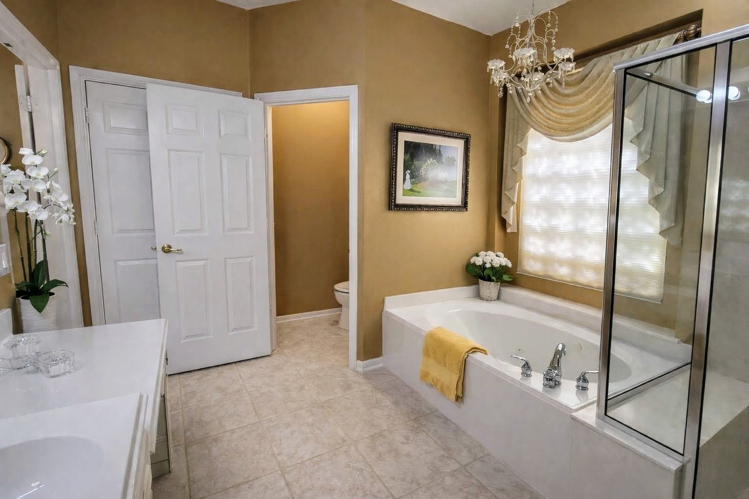 - Breakfast Bar, Handicap Access, High Ceilings, Kitchen Island, Kitchen/Family Room Combo, Pantry, Soaking Tub, Separate Shower, Makeup/Vanity Space, Walk-In Pantry, Window Treatments, Ceiling Fan(s), Programmable Thermostat