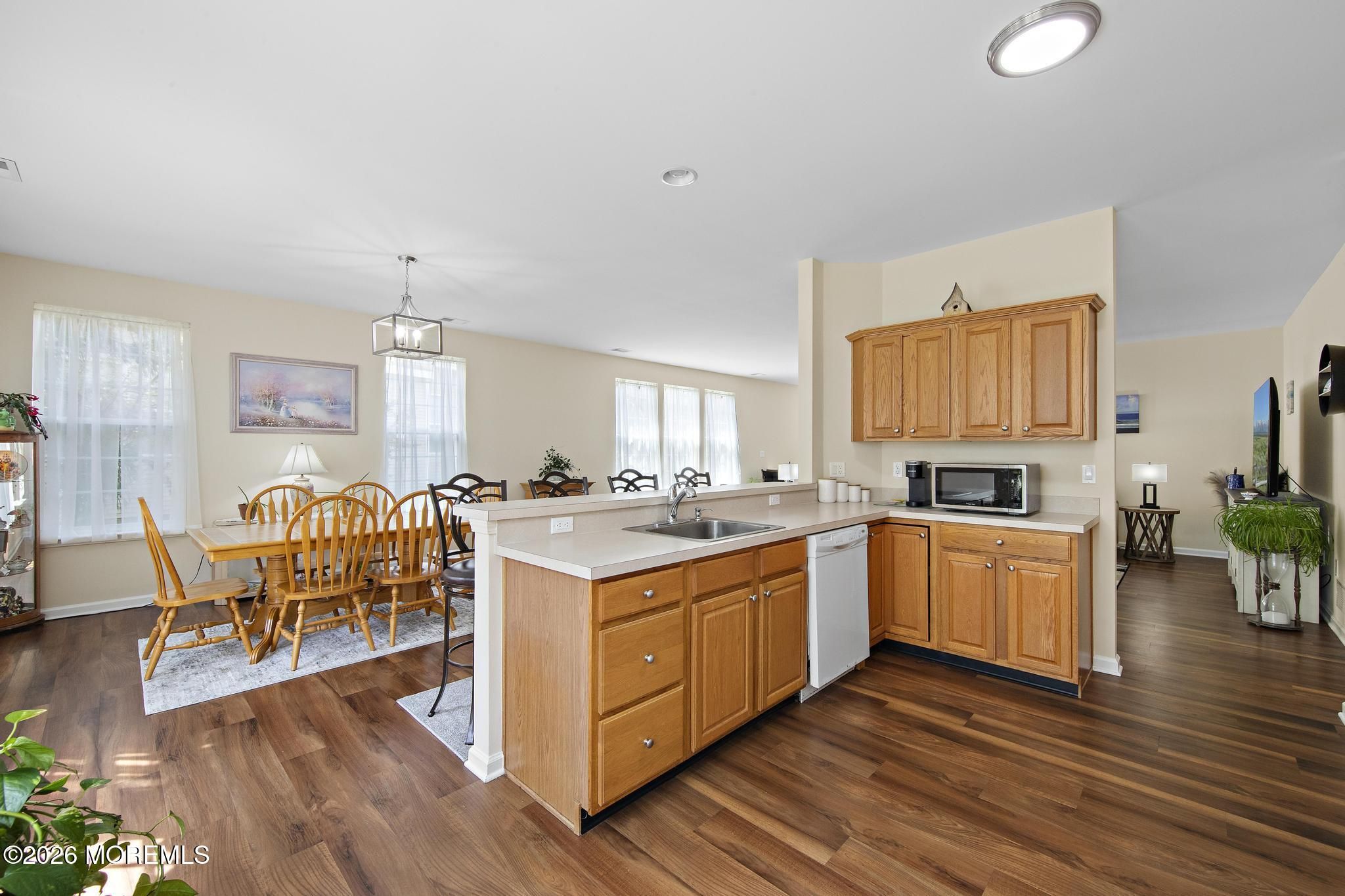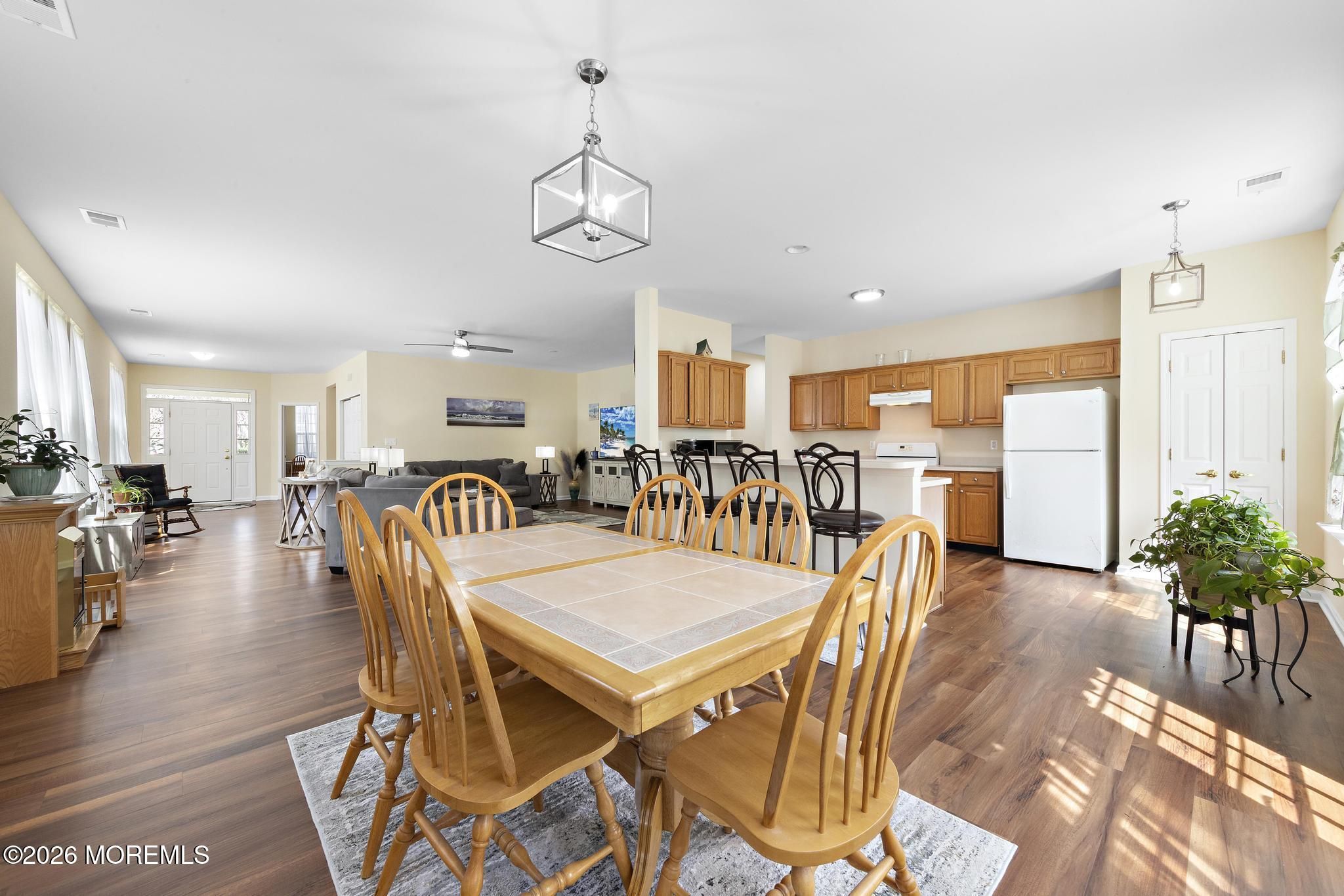 Beautiful Captiva in KHOV Sea Oaks Four Seasons in Little Egg Harbor. Walking distance to the club houses, pools, golf course, restaurant, and hotel at LBI Nation Golf Course. 2 bedrooms, plus a large office, plus 2 baths and a large 2 car garage, this home has been lightly used as a second home. The open floorplan welcomes you in a light, bright space with new LVP flooring throughout. The large living room can accommodate large sofas and multiple seating areas. The dining room can be made more formal or turned into another seating area. The open kitchen has a breakfast bar with 4 chairs and room for a table. There are lots of oak cabinets and a pantry, and sun streaming in all morning. There is a back patio with trees for protection and privacy, and a patio with an awning, and yet close dining space can be used formally or as an additional sitting area. The open kitchen features a breakfast bar with seating for four, abundant oak cabinetry, a pantry, and sun-filled morning exposure, with space for a casual dining table. Enjoy outdoor living on the private rear patio with awning, surrounded by mature trees for added privacy, yet just moments from community amenities. The well-maintained interior offers a perfect opportunity to customize and make it your own. The generous owner's suite includes a large bedroom, two walk-in closets, and an en-suite bath with dual vanities, soaking tub, and separate stall shower. A nicely sized second bedroom with two closets is complemented by a full hall bath, along with a large linen closet. The versatile office/study can easily function as a third bedroom. Additional features include a laundry room with washer, dryer, and pull-down attic storage. An ideal home for those looking to downsize without compromise in a premier active adult community.