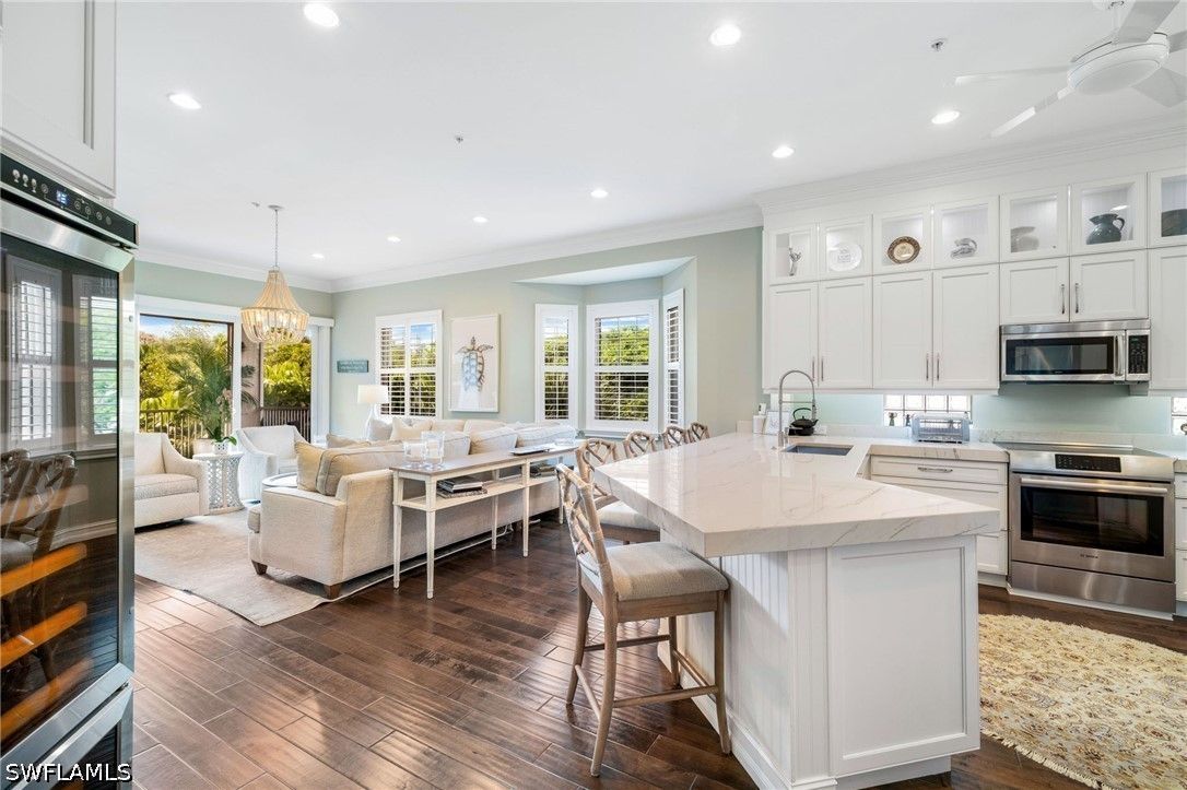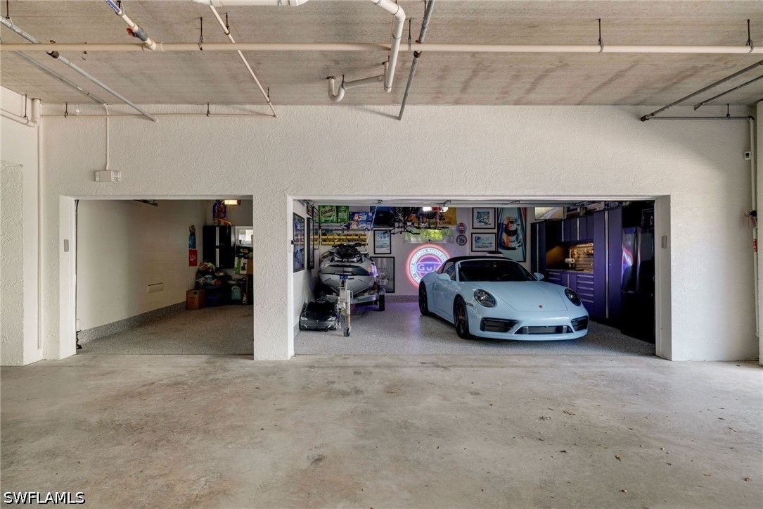Step into a level of luxury rarely offered in Breakwater at Pelican Bay, truly a one-of-a-kind opportunity to own one of the most exceptional and unique residence in the entire community. This fully remodeled and completely reimagined floor plan features 3 bedrooms, a private den, and 2.5 baths, along with an extraordinarily rare 3-car garage. Designed as a showcase of meticulous craftsmanship and premium finishes, the home exudes sophisticated modern coastal elegance and unparalleled comfort throughout The chef’s kitchen features stunning book matched natural quartzite countertops, custom floor-to-ceiling cabinetry, dual wine coolers, and an induction range, all seamlessly integrated into the open living space. No expense was spared while over improving this unit, upgrades include hand-scraped walnut hardwood flooring, two-piece crown molding, three-panel solid-core doors, a total smart home living with a Lutron lighting system and automated window shades, Hue lighting, and custom plantation shutters, and impact-resistant windows and doors throughout. The private den includes custom built-in bookshelves, filing cabinets and a desk, creating the ideal home office or flex space. The luxurious primary suite offers custom closets with built-in dressers and a spa-inspired bath finished in floor-to-ceiling Carrara marble with heated floors and a Toto Washlet toilet. Additional features include a custom-designed laundry room with a large capacity LG stackable washer/dryer, extensive cabinetry and built-in drying racks, along with a tankless hot water heater for endless hot water. The other bedrooms are complete with custom closets with built-in dressers. The elevator leads to one of the rarest offerings in Breakwater a true 3-car fully air-conditioned and insulated garage, one of only a select few and rarely available in the community, featuring Concrete Science flooring, NewAge Commercial Pro Series 18-gauge steel cabinetry and tools, along with an additional full size refrigerator/freezer and 50-amp electric service for high speed vehicle charging. Enjoy peaceful outdoor living from the southwest-facing lanai with marble flooring, custom cedar ceiling, and lush landscape for the in ultimate privacy. Perfectly situated directly across from Breakwater’s newly renovated clubhouse and pool, this residence truly checks all the boxes and offers unmatched convenience while maintaining privacy behind mature hedging. Breakwater is a gated community known for ZERO hurricane flooding and extensive exterior redesigned renovations including new windows, roofs, and fresh coastal paint colors. Residents of Pelican Bay enjoy world-class amenities including private beach access, two beachfront restaurants, tennis, pickleball, fitness/life center, wellness classes, and miles of scenic walking and biking paths. Ideally located near Mercato, Pavilion, and Pelican Bay Community Center. Don’t miss this once in a generation opportunity.