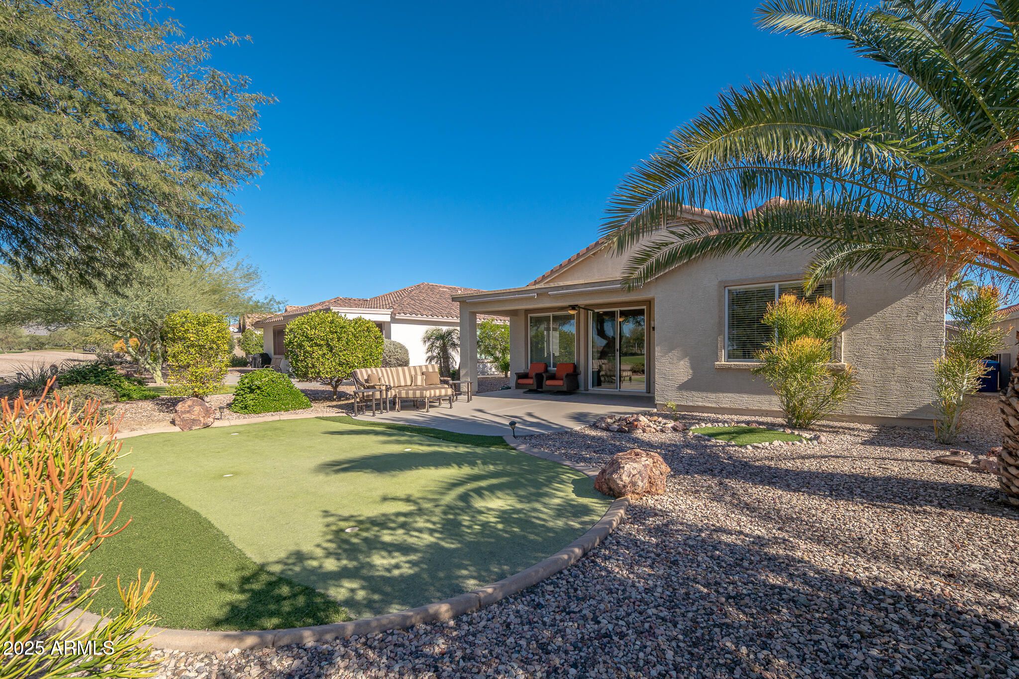 Enjoy the Golf Course View from almost every room in this hard to find, 3 bedroom Cholla Model Home. Spectacular Desert Sunset views can be yours from your spacious extended patio. This home was designed to enjoy the outdoors. You have your own putting green to practice those short shots before you hit the greens. This home is ready for an easy move in, furniture is included, bring your toothbrush and clothing, everything else is here for you to begin enjoying your resort style home. Sundance Active Adult community is known for its friendly neighbors and fun community activities throughout the year. You will be walking distance to the course, restaurant and the Sundance Community Center. Shopping and other restaurants are also within walking distance, making it one of the best located homes in the community. Come and view this beautiful home ready for you to make it your own.