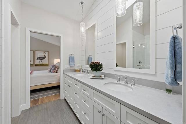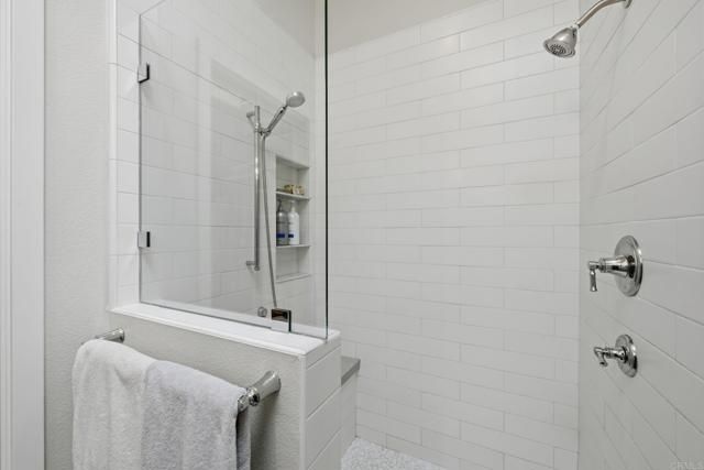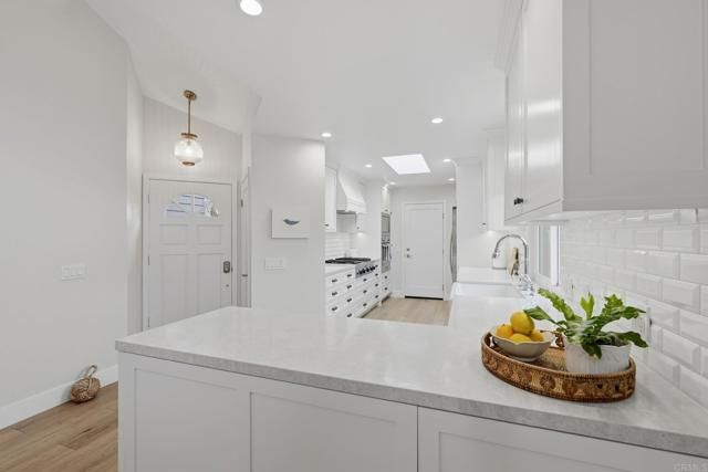 Coastal single-story living at its finest—just minutes from the ocean. Welcome to the highly coveted, gated community of Sea Cliff, where this beautifully upgraded detached single-level 2-bedroom, 2-bath residence is tucked away on a serene cul-de-sac and offers one of the most sought-after features in the community—a generous private driveway that accommodates two cars, a special and authorized convenience. Together, these rare attributes provide exceptional privacy, ease, and everyday functionality, all within a resort-style setting. Soaring ceilings and multiple skylights flood the home with natural light. Custom designer touches are woven throughout the home, with thoughtfully curated finishes, high-end materials, and refined details that elevate every space. The open-concept floor plan is designed for easy living and seamless indoor-outdoor entertaining. The inviting living room features a striking fireplace with decorative fire glass, a stylish shiplap accent wall, and custom built-in cabinetry—creating a warm, coastal-modern ambiance. Multiple sliding glass doors seamlessly connect the interior to a private rear wraparound patio, ideal for morning coffee, al fresco dining, or unwinding after a day at the beach. The chef’s kitchen is a standout, thoughtfully upgraded with high-end stainless-steel appliances including a 36" Thermador cooktop with center griddle, custom exhaust hood, Thermador convection oven, and Samsung refrigerator and dishwasher. Quartz countertops, a Kohler farmhouse sink, custom cabinetry with a lighted China cabinet, and a Velux Low-E skylight complete this stunning space. Luxury vinyl plank flooring flows throughout, complemented by energy-efficient Milgard windows and patio doors. The serene primary suite features a shiplap accent wall, a beautifully upgraded bath with quartz counters, and a walk-in closet with a conveniently located washer and dryer. The secondary bedroom and guest bath are equally refined, with custom finishes, designer lighting, and thoughtful details throughout. Step outside to your private garden-style patio, surrounded by lush greenery—your own tranquil outdoor retreat for entertaining or relaxation. Residents of Sea Cliff enjoy resort-style amenities, including two pools and spa, tennis courts, a clubhouse, and scenic walking trails that wind around peaceful ponds and streams, all set within impeccably maintained grounds. Single-story homes near the coast in Carlsbad are rare—this is your opportunity to live the lifestyle you’ve been waiting for, with the beach, award-winning schools, top dining, and premier shopping just moments away.