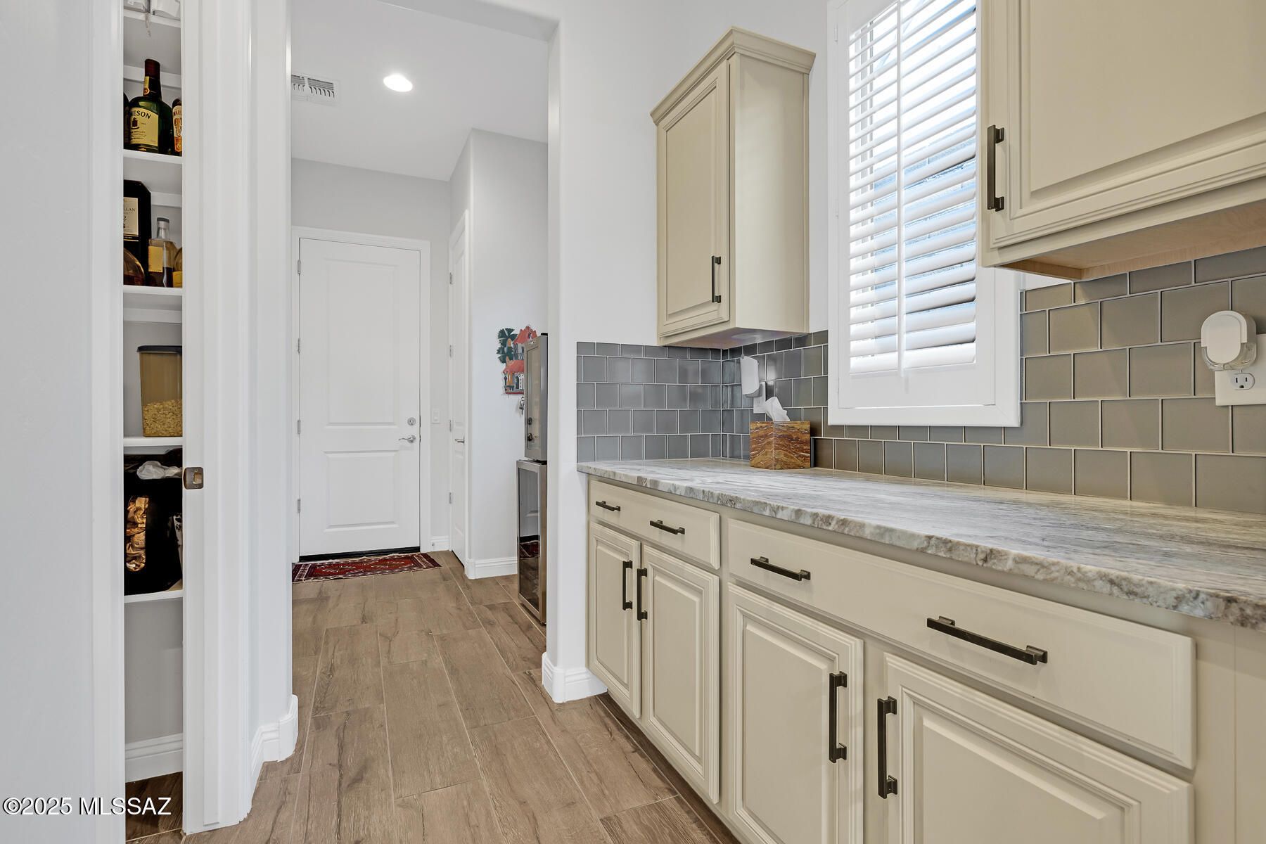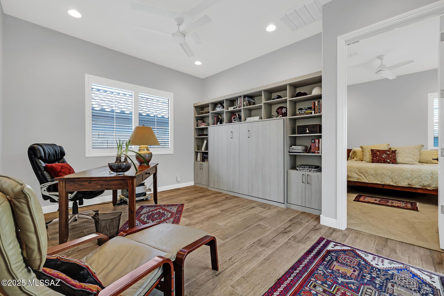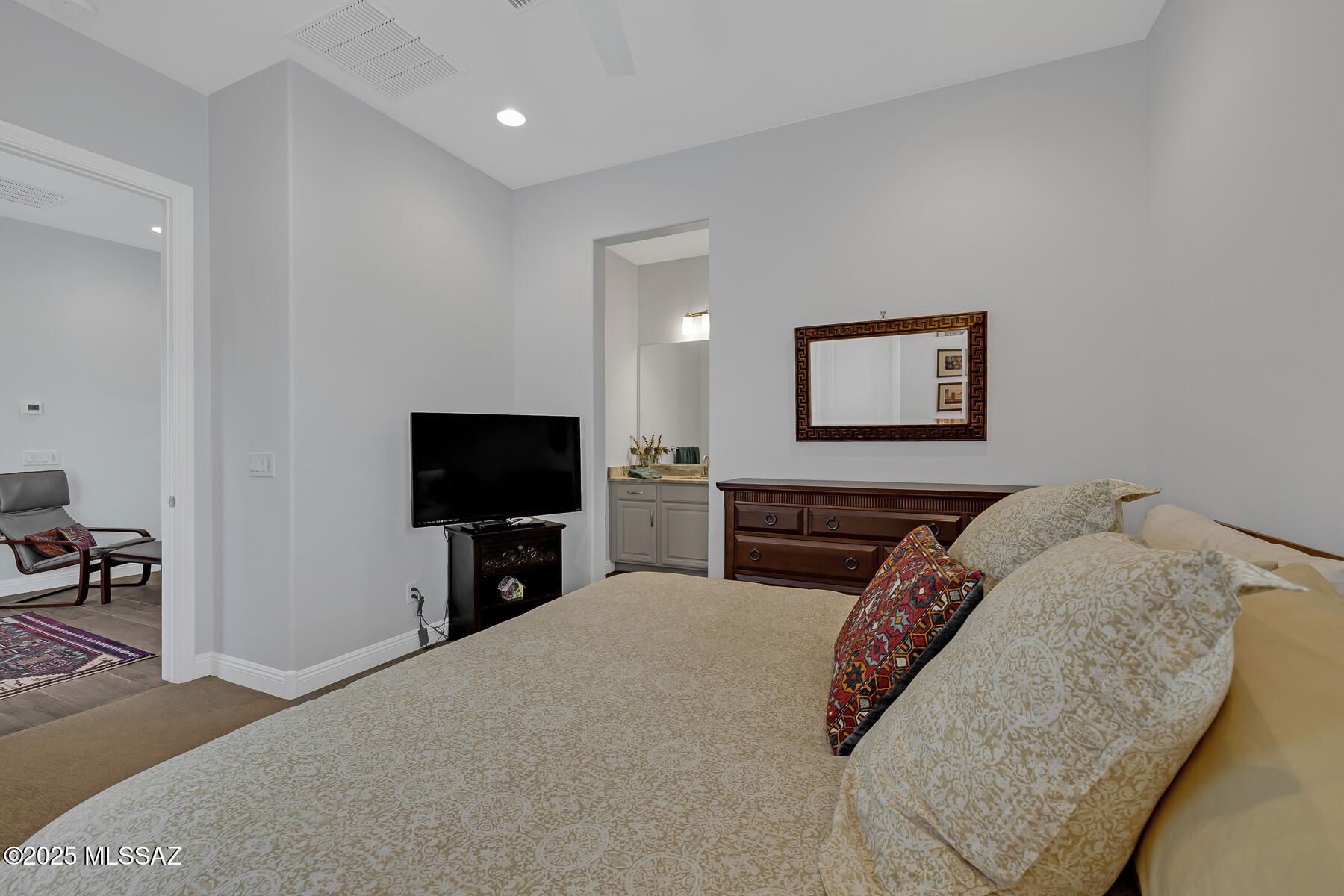 Welcome to this meticulously maintained 2BD/2.5BA (2514 sqft) Journey Model located in Del Webb at Dove Mountain active adult 55+ community. Owned solar! Step into an open-concept floor plan featuring a spacious great room, formal dining area, and a stunning chef's kitchen complete with upgraded cabinetry, premium countertops, top-of-the-line appliances, and a butler's pantry with a large walk-in pantry for extra storage. Luxurious owner's suite offers a spa-like retreat with a generous walk-in shower, dual vanities, and a spacious walk-in closet. Your guests will enjoy the comfort of a private en suite guest bedroom, while the versatile den/office includes a custom Murphy bed, perfect for accommodating visitors. Retreat outdoors to a gorgeous backyard oasis featuring a covered patio