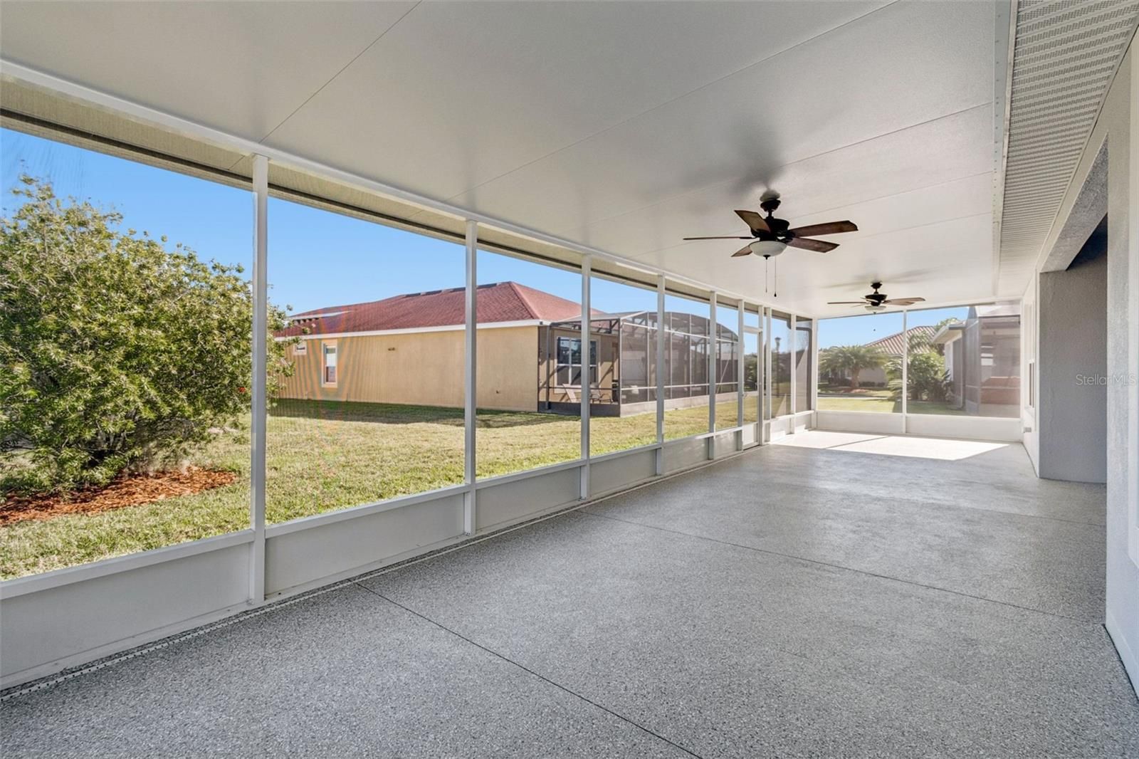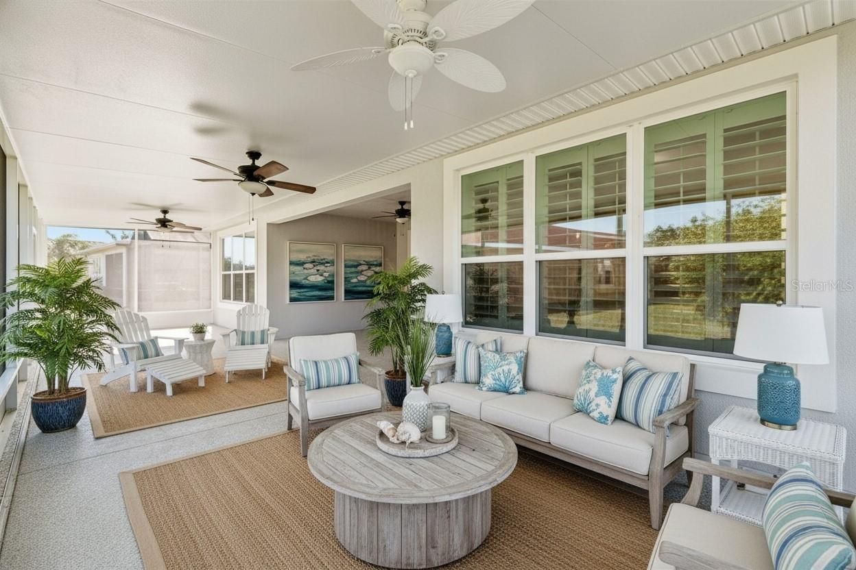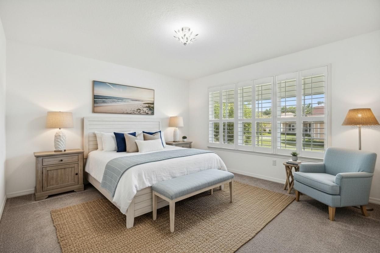 One or more photo(s) has been virtually staged. Beautifully upgraded and meticulously maintained Calto model with golf cart garage offering 2,028 square feet of living space and built in 2018. Ideally located in a quiet neighborhood just minutes from the Palms Resort Amenity Center, this home blends comfort, style, and thoughtful upgrades throughout. Enter through the screened front entryway and elegant leaded glass front door into a bright and welcoming interior. The gourmet kitchen is designed for both everyday living and entertaining, featuring pull-out shelving and a walk-in pantry for exceptional storage and convenience. The home offers two spacious master suites, both carpeted for comfort, along with 2½ baths. Each master bathroom includes upgraded walk-in showers (no tubs), with dual sinks in one bath. A versatile den, along with tile flooring in the den and great room, adds flexibility for a home office or hobby space. Additional upgrades include central vacuum, plantation shutters on all windows, and motorized shades on all three sliding glass doors. Step outside to the truly impressive expanded grand lanai, measuring approximately 800–1,000 square feet. This outdoor living space features a fully covered ceiling, two ceiling fans for optimal airflow, and special Florida screens letting NO bugs in. The lanai floor has been professionally finished with Shark Coatings, providing a durable, long-lasting surface backed by a 15-year warranty—perfect for relaxing or entertaining year-round. Solivita is a premier 55+ community, offering residents an exceptional, resort-style lifestyle with outstanding amenities. Enjoy a state-of-the-art fitness center, dance and aerobics studios, and an impressive variety of recreational options including 14 heated swimming pools, two heated spas, tennis courts, pickleball courts, shuffleboard, bocce ball, billiards, and an art gallery. The community also features three on-site restaurants and two championship 18-hole golf courses. With a full calendar of activities, clubs, and events, there is always something new to explore and enjoy. This home is conveniently located near a hospital and medical office complex, shopping and dining, and a new shopping center featuring Sprouts, Outback, and other popular retailers, offering the perfect balance of privacy, convenience, and an active lifestyle.