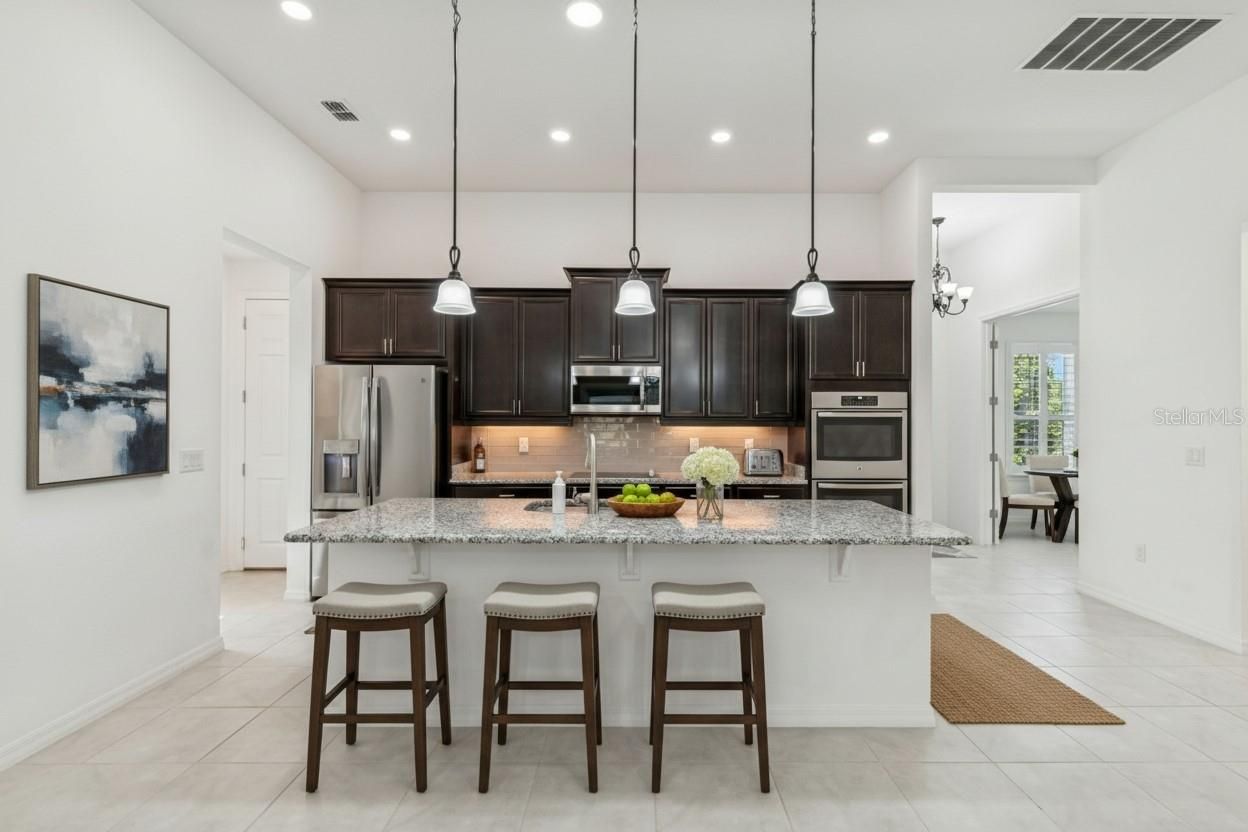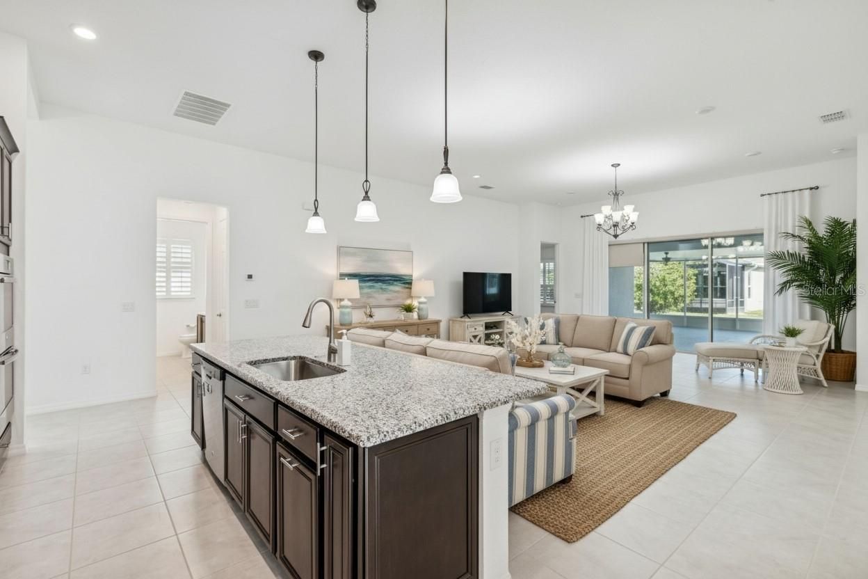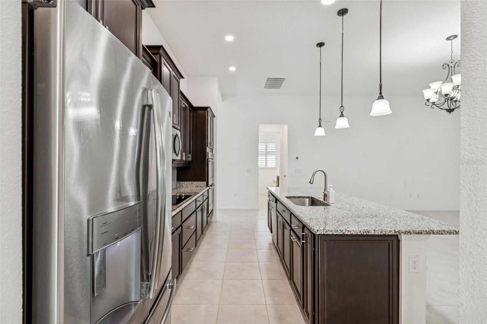 One or more photo(s) has been virtually staged. Beautifully upgraded and meticulously maintained Calto model with golf cart garage offering 2,028 square feet of living space and built in 2018. Ideally located in a quiet neighborhood just minutes from the Palms Resort Amenity Center, this home blends comfort, style, and thoughtful upgrades throughout. Enter through the screened front entryway and elegant leaded glass front door into a bright and welcoming interior. The gourmet kitchen is designed for both everyday living and entertaining, featuring pull-out shelving and a walk-in pantry for exceptional storage and convenience. The home offers two spacious master suites, both carpeted for comfort, along with 2½ baths. Each master bathroom includes upgraded walk-in showers (no tubs), with dual sinks in one bath. A versatile den, along with tile flooring in the den and great room, adds flexibility for a home office or hobby space. Additional upgrades include central vacuum, plantation shutters on all windows, and motorized shades on all three sliding glass doors. Step outside to the truly impressive expanded grand lanai, measuring approximately 800–1,000 square feet. This outdoor living space features a fully covered ceiling, two ceiling fans for optimal airflow, and special Florida screens letting NO bugs in. The lanai floor has been professionally finished with Shark Coatings, providing a durable, long-lasting surface backed by a 15-year warranty—perfect for relaxing or entertaining year-round. Solivita is a premier 55+ community, offering residents an exceptional, resort-style lifestyle with outstanding amenities. Enjoy a state-of-the-art fitness center, dance and aerobics studios, and an impressive variety of recreational options including 14 heated swimming pools, two heated spas, tennis courts, pickleball courts, shuffleboard, bocce ball, billiards, and an art gallery. The community also features three on-site restaurants and two championship 18-hole golf courses. With a full calendar of activities, clubs, and events, there is always something new to explore and enjoy. This home is conveniently located near a hospital and medical office complex, shopping and dining, and a new shopping center featuring Sprouts, Outback, and other popular retailers, offering the perfect balance of privacy, convenience, and an active lifestyle.