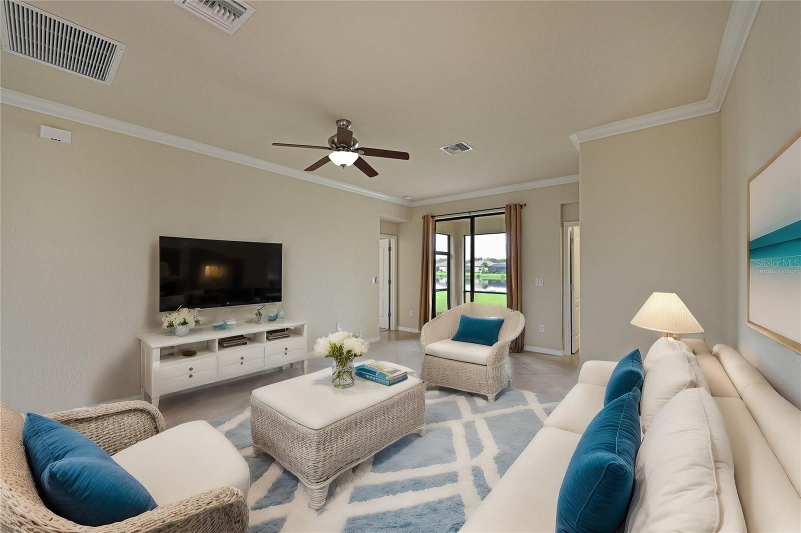 This home is PRICED TO SELL! And the perfect TIME is now! The pool is open, the 8.5 million dollar clubhouse renovation is nearing completion, and the best weather all year is upon us. Soak up stunning WATER VIEWS and the state-of-the-art renovations. The owner renovated the kitchen and painted the interior. The cabinets were custom-painted, and quartz countertops and a matching backsplash were installed. This gem in the Sanctuary of River Strand Golf and Country Club has a social membership. The fees and capital contributions are lower. You can live the River Strand lifestyle AND play golf without higher fees. Have it all…24-hour gated security, cable, wifi, lawn care, trimming, mulch, and much more. The Sanctuary social membership allows you access to all amenities. Golf is pay-to-play based on availability. River Strand Golf & Country Club is a vibrant community with 9 Har-Tru Tennis Courts, 8 Pickleball courts, 2 Resort-Style Pools, 6 Satellite Pools, a 27-hole golf course, the Clubhouse with a restaurant, social events, a Community Center & 2 fitness centers! Convenient location to I-75, a golf cart ride to The Market Place, which includes many popular stores and restaurants to include Target, Costco, Hobby Lobby, Academy Sports, and the upcoming Whole Foods. Enjoy University Town Center, & beaches, Spring Training games, the arts and social scene and much, much more. Come home to River Strand Golf & Country Club and live the Florida lifestyle you have been dreaming of.