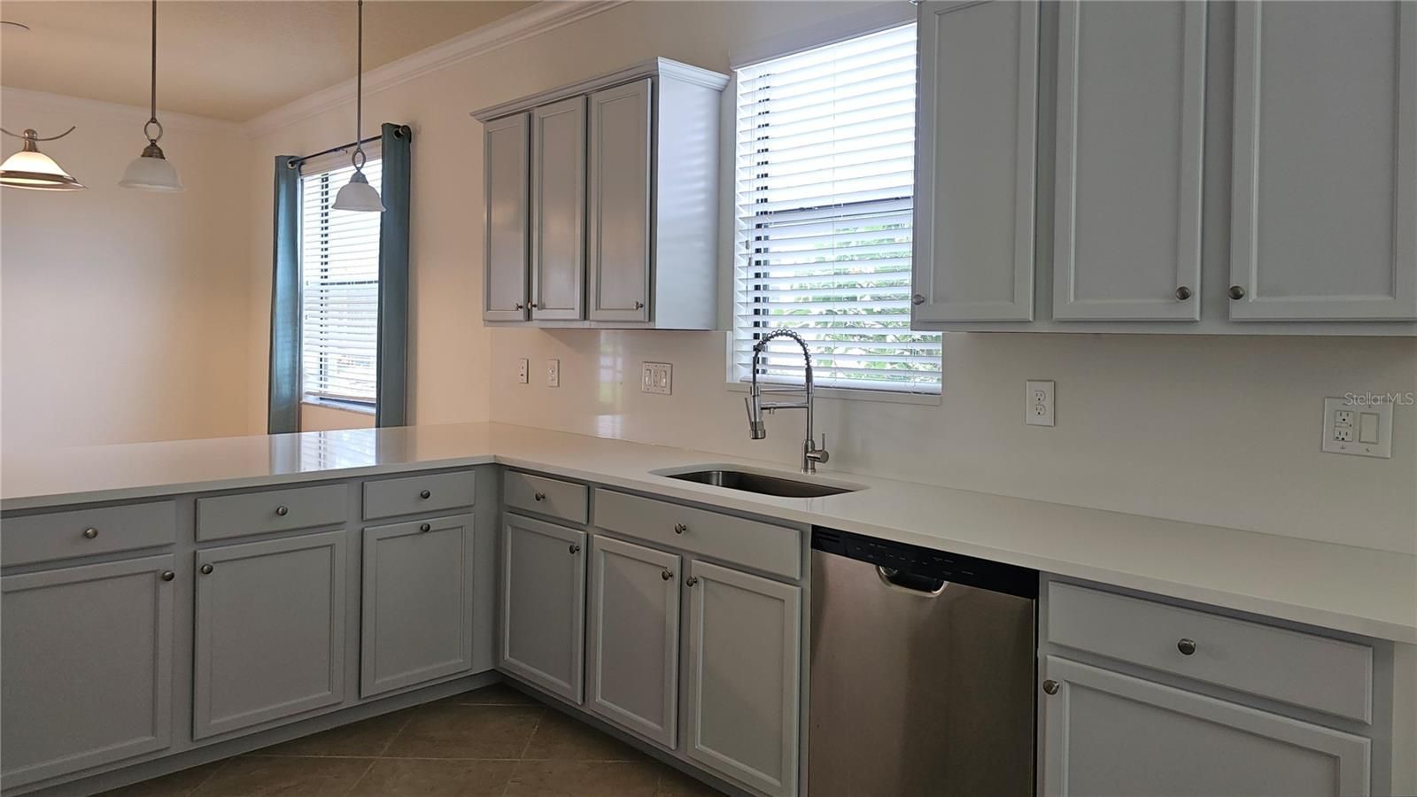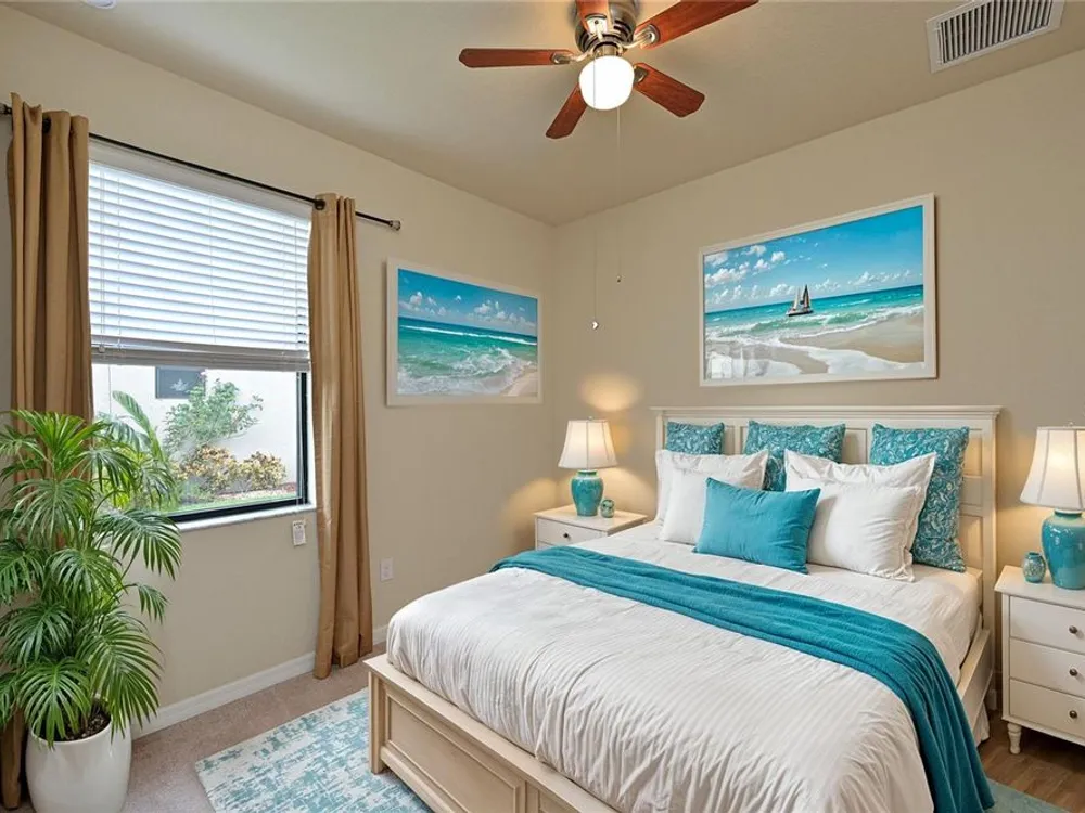 - Ceiling Fan(s), Eat-in Kitchen, High Ceilings, Living/Dining Room, Open Floorplan, Main Level Primary, Solid Surface Counters, Solid-Wood Cabinets, Split Bedrooms, Stone Counters, Thermostat, Walk-In Closet(s), Window Treatments