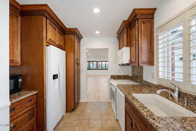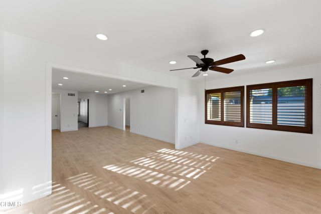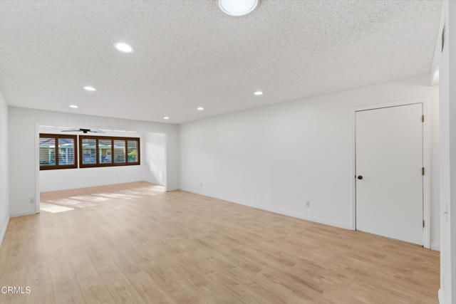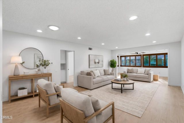 Incredible NEW price for this UPGRADED and EXPANDED Del Mar home in Leisure Village 7 with remodeled interiors and brand new beautiful flooring throughout. There is also a beautiful added den overlooking the greenbelt. This 2 bedroom, 2 bath home includes an approx. 165 sq. ft. permitted expansion that creates a spacious den or extended living area with multiple windows and peaceful views behind the home--ideal for reading, hobbies, or flexible seating.The kitchen has been tastefully upgraded with cherry cabinetry, granite counters, custom shutters, and quality finishes. Both bathrooms mirror the same elevated look, featuring matching cherry cabinetry, granite counters, and updated fixtures. The layout maintains the classic Del Mar flow while offering the benefit of added square footage and natural light enhanced by skylights.This home is located in Camarillo's premier 55+ guard-gated community, very near amazing amenities offered in Leisure Village including expansive clubhouse with library & workshops, golf course, pool, hot tub, pickleball, tennis, fitness center and so much more. This home is move-in ready and positioned for its next homeowner to enjoy everything Leisure Village offers--security, amenities, and a low-maintenance lifestyle.