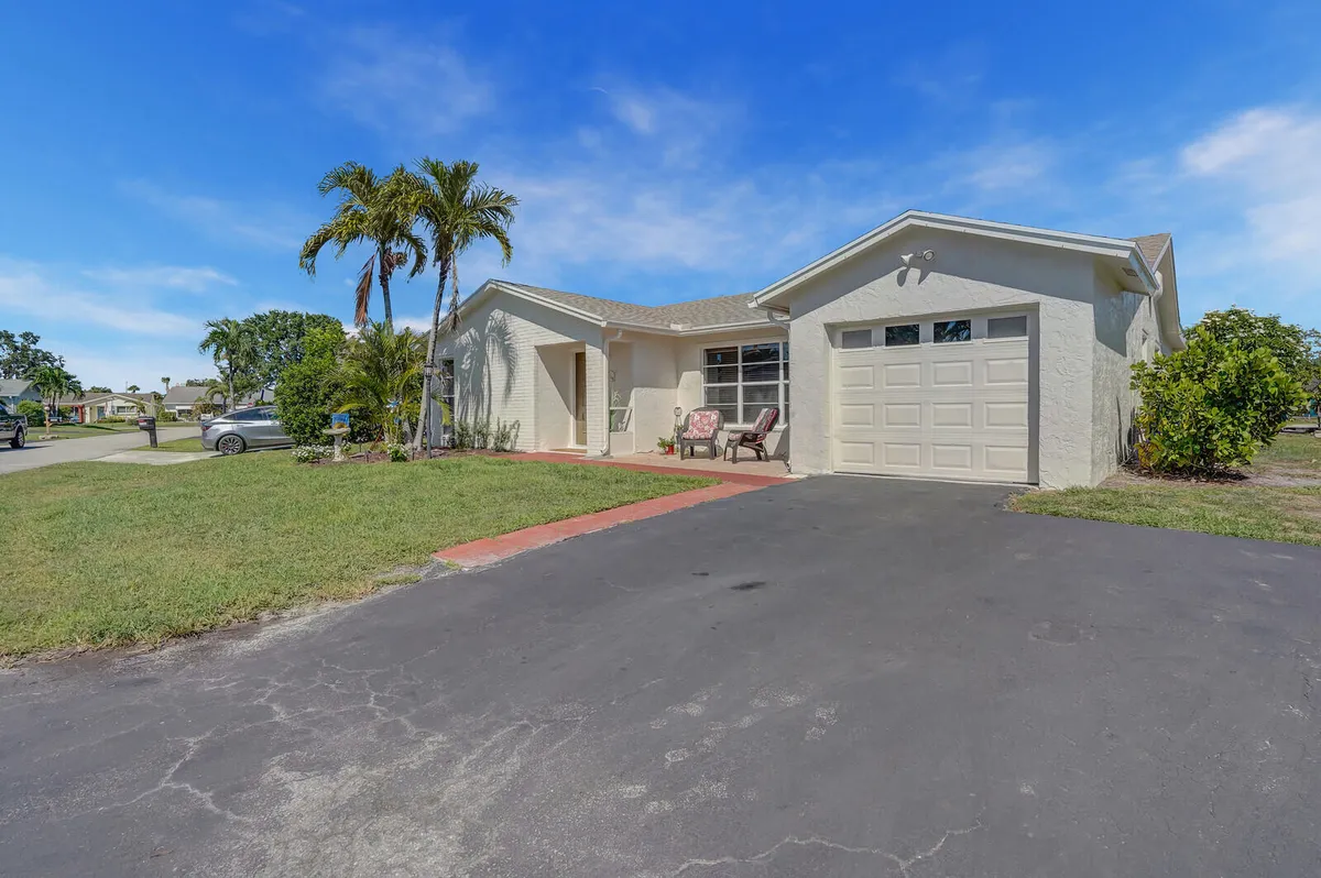 NEW ROOF installed 2025. You will love this large 2 bed, 2 bath, 1 car garage with a den on the lake. The den could easily be converted into a bedroom. Kitchen has quartz countertops and has been renovated. The home backs up to a lake and sits on a large lot. Excellent location minutes from the new Palm Beach National golf course and driving range. Low HOA fee includes cable and Internet package (high speed fiber). All ages welcome.